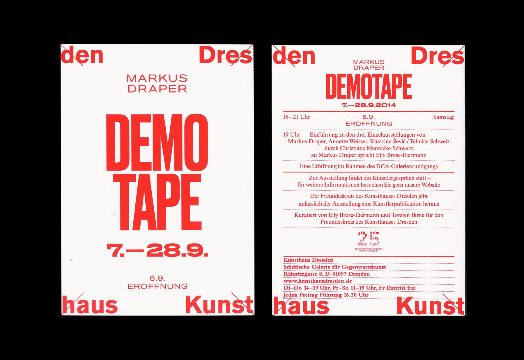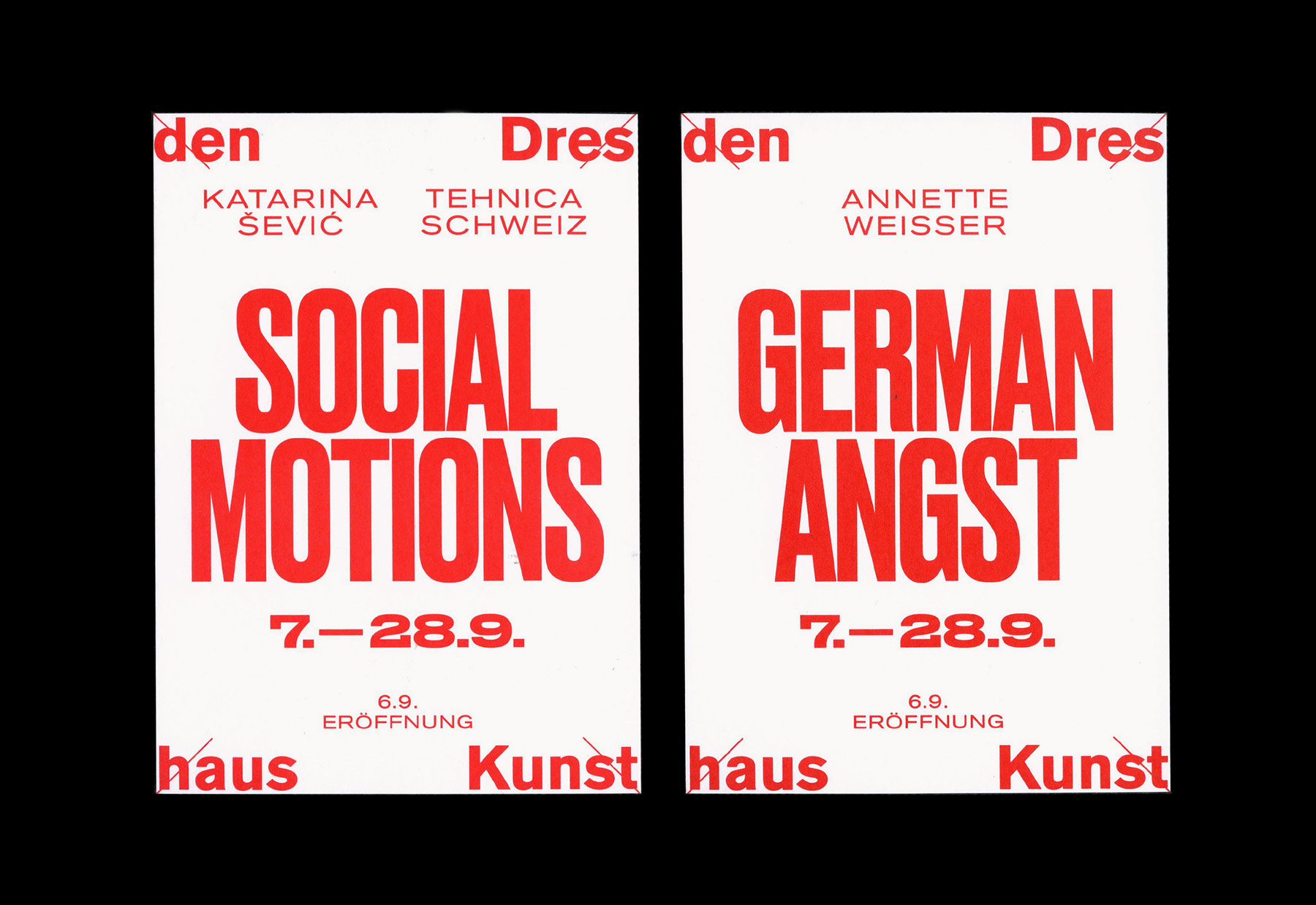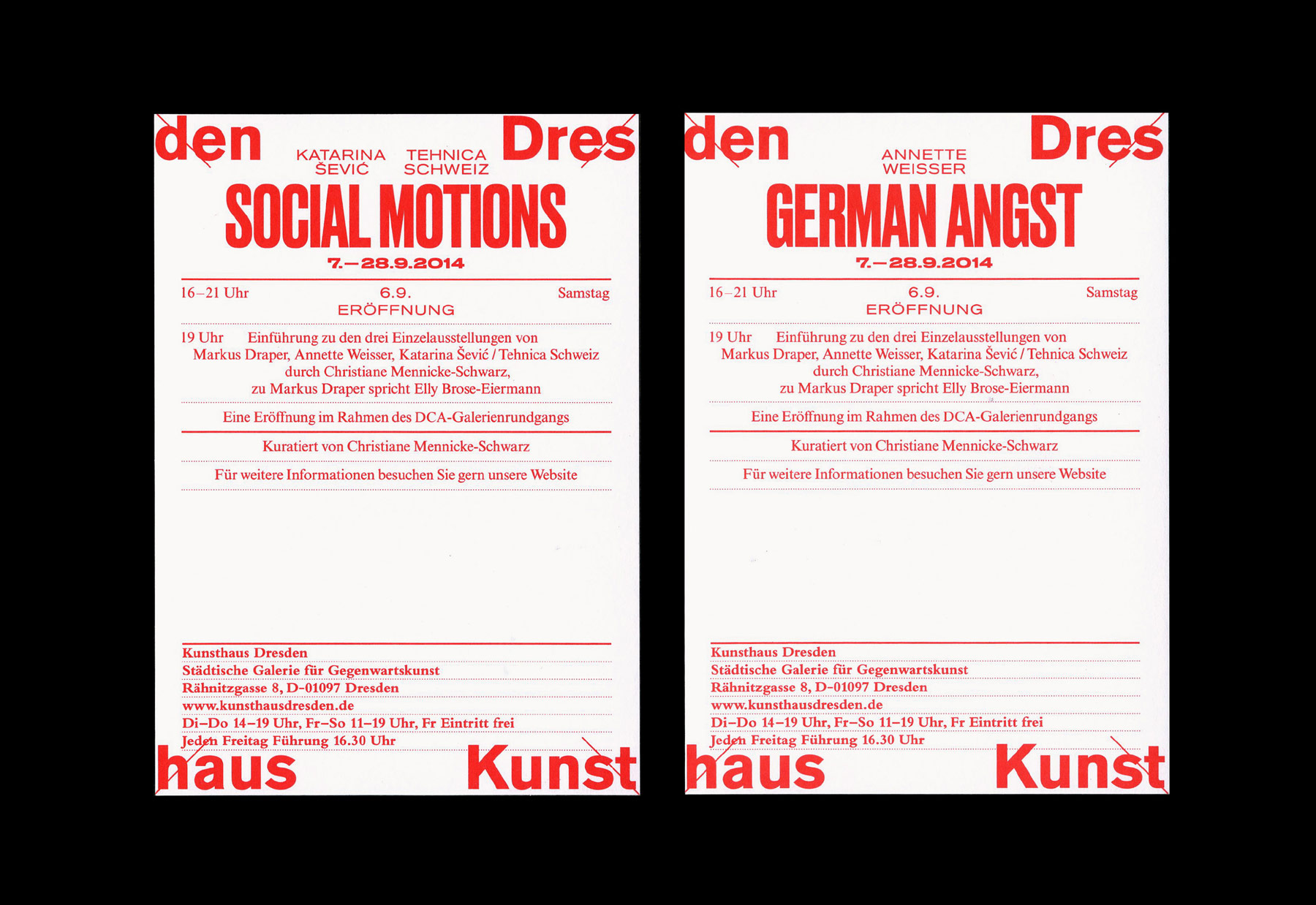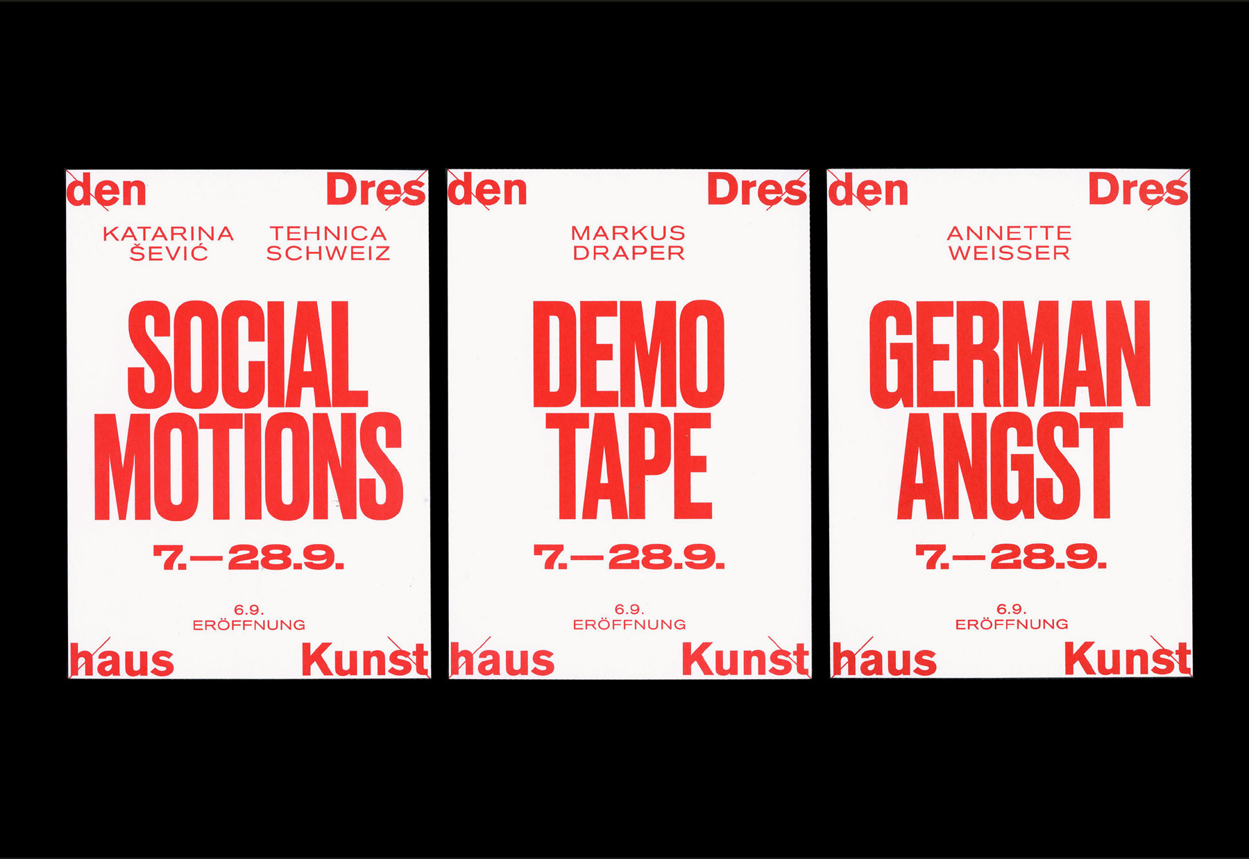 Exhibiton design for the solo shows of Katarina Šević, Markus Draper and Annette Weisser at Kunsthaus Dresden, including invitation flyers, poster steles, ads, and signage. In the form of paintings, photographs and choreographies, the three artists deal with the social, political and aesthetical aspects of mass movements and protest cultures.