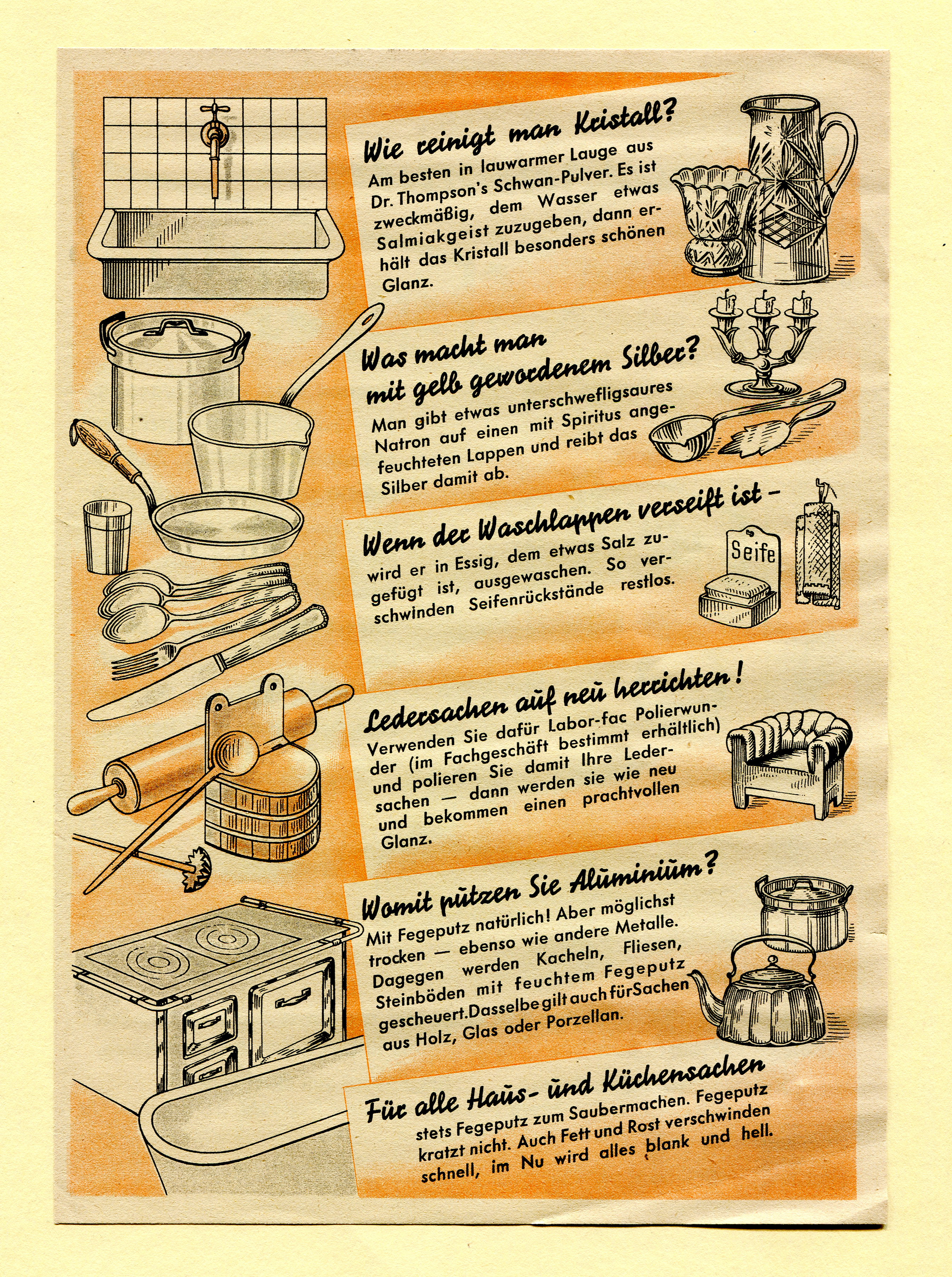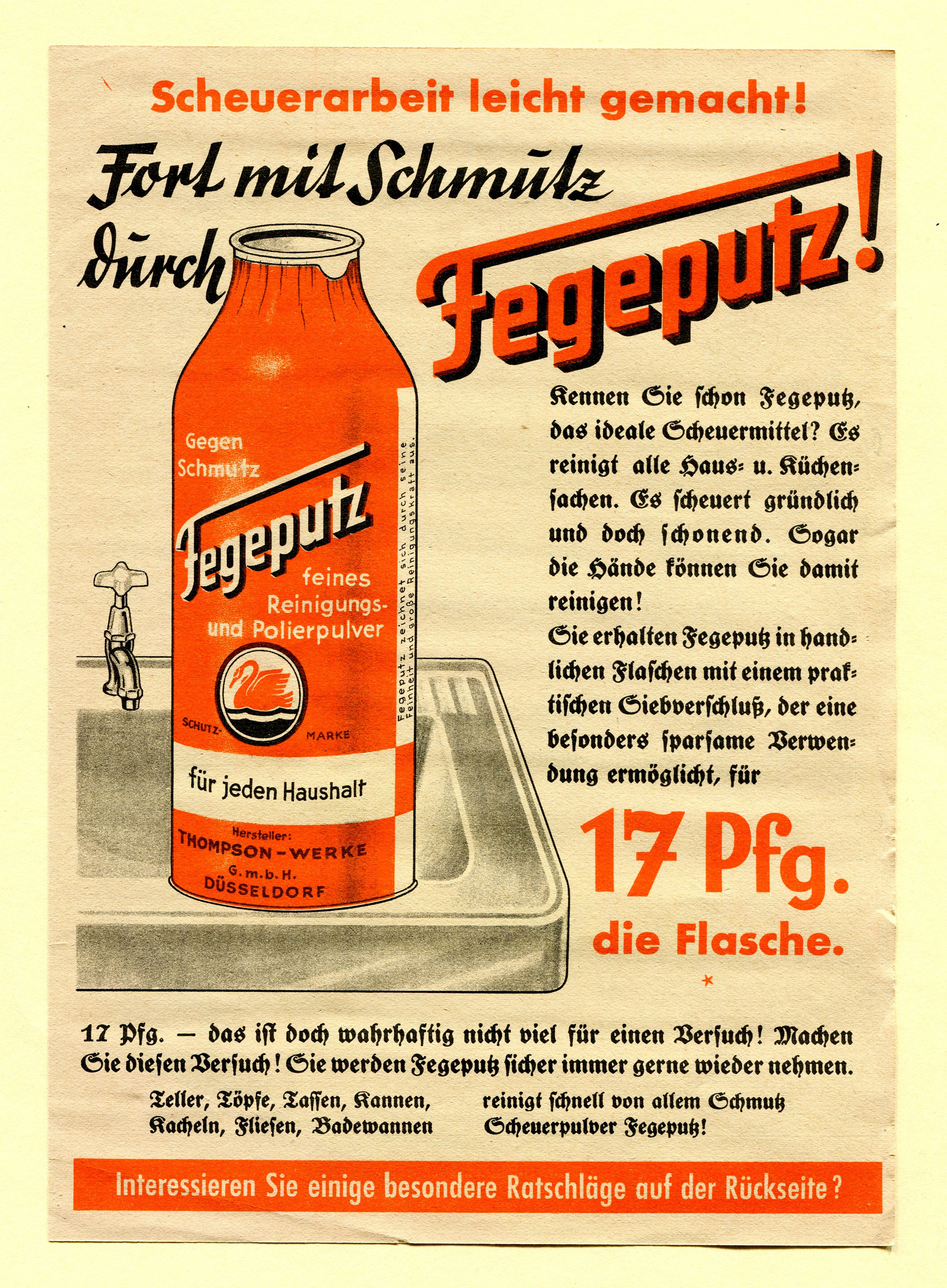 Advertising flyer for the scouring agent Fegeputz. While the slogan, the brand name and the price information feature custom lettering, the copy is set in Bernhard-Fraktur. The sans printed in red is Futura fett, the line in reverse at the bottom is the schmalhalbfett style from Paul Renner’s geometric sans family.