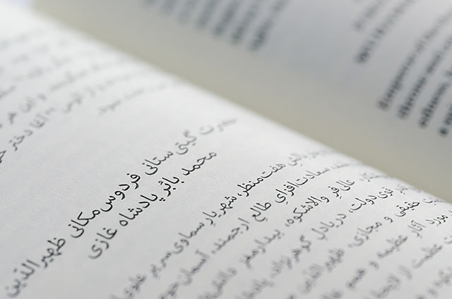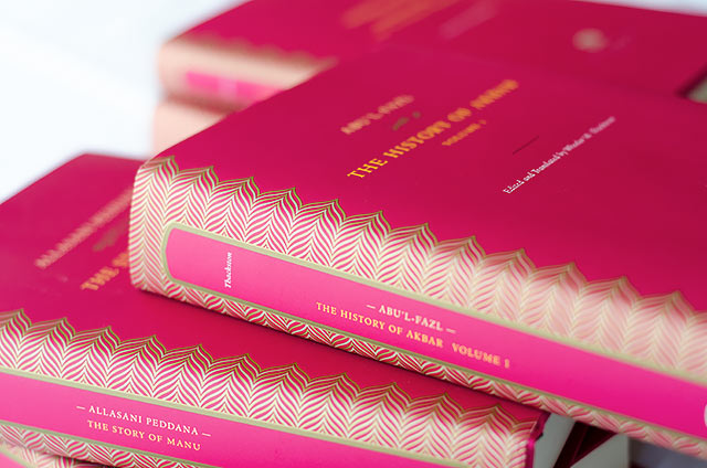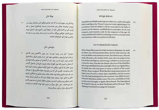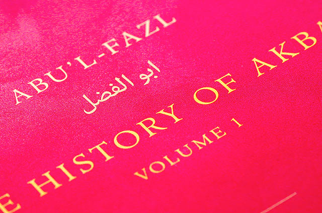 The concept and beautiful design of the books was done by Rathna Ramanathan. A range of new Indian types were specially commissioned from Fiona Ross and John Hudson of Tiro Typeworks. The Arabic type used for Persian is Nassim by Titus Nemeth, presented here in the book The History of Akbar, Vol I. The Latin is Henrik Kubel’s Antwerp.