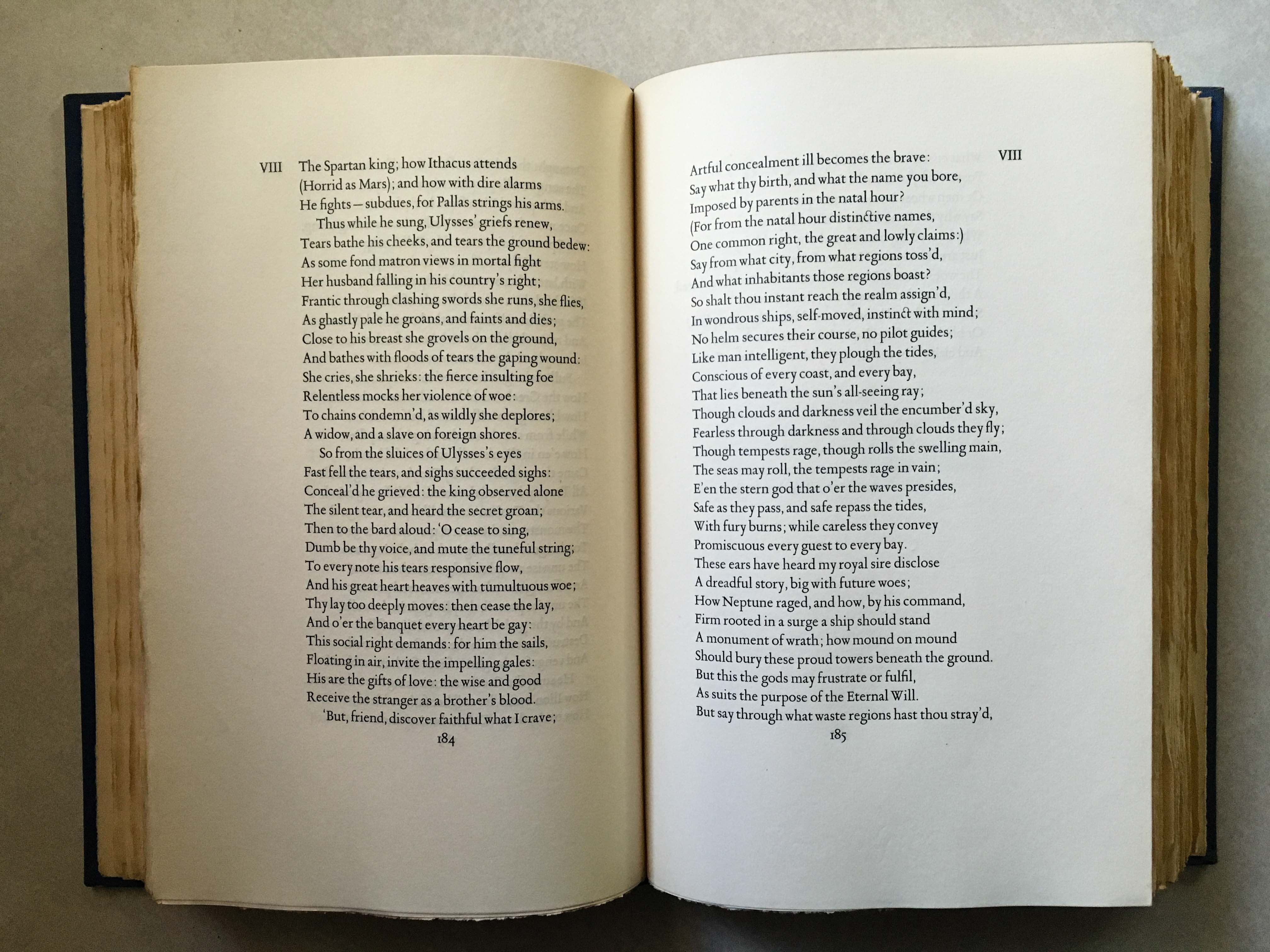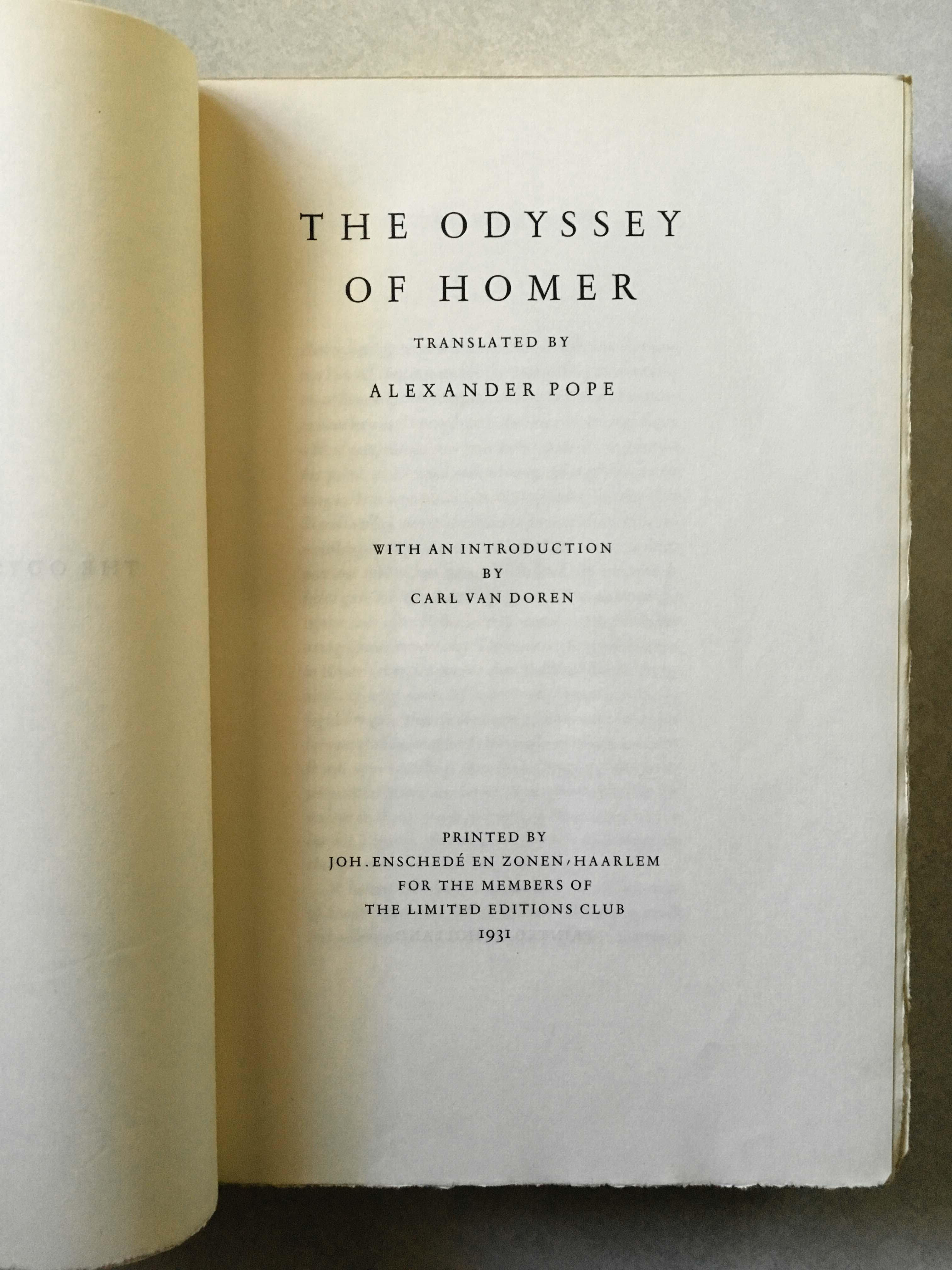 In 1931, the Limited Editions Club in New York commissioned Jan van Krimpen to design a two-volume series for the Iliad and Odyssey of Homer. Shown in the images, the Odyssey is hard-bound with a dark blue cloth surface, contained in a yellow slipcase.