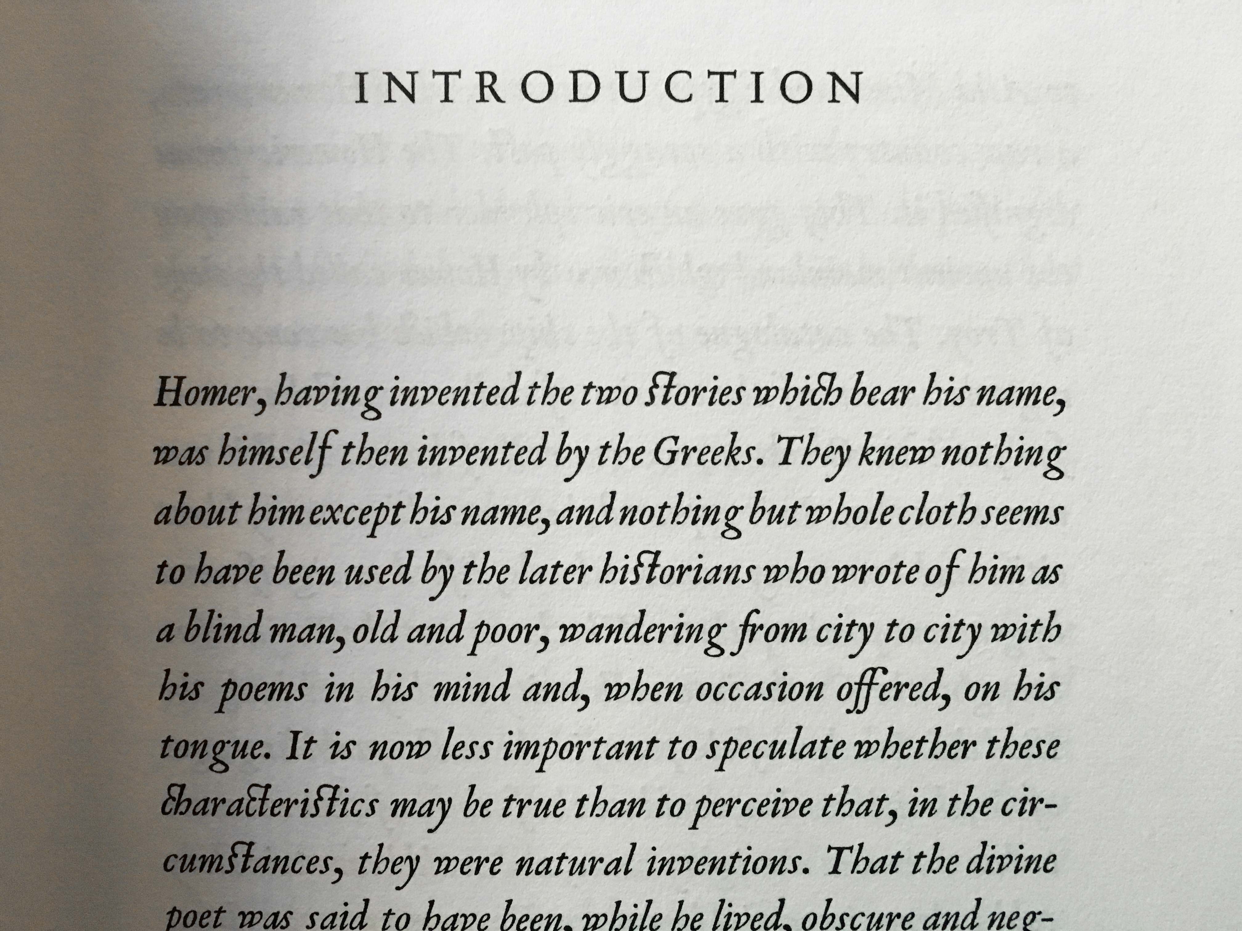 This Homer was also the first use of Van Krimpen’s own typeface, Romanée, casted at 16-point. Romanée was an upright style originally conceived to accompany Enschedé's Kleine Text Cursyf (“[for] Small Text Italic” in English), rediscovered in its archive. At that point, Van Krimpen had yet to design his own Romanée italic. Therefore the introduction, which is set completely in italic, uses Monotype Van Dijck.