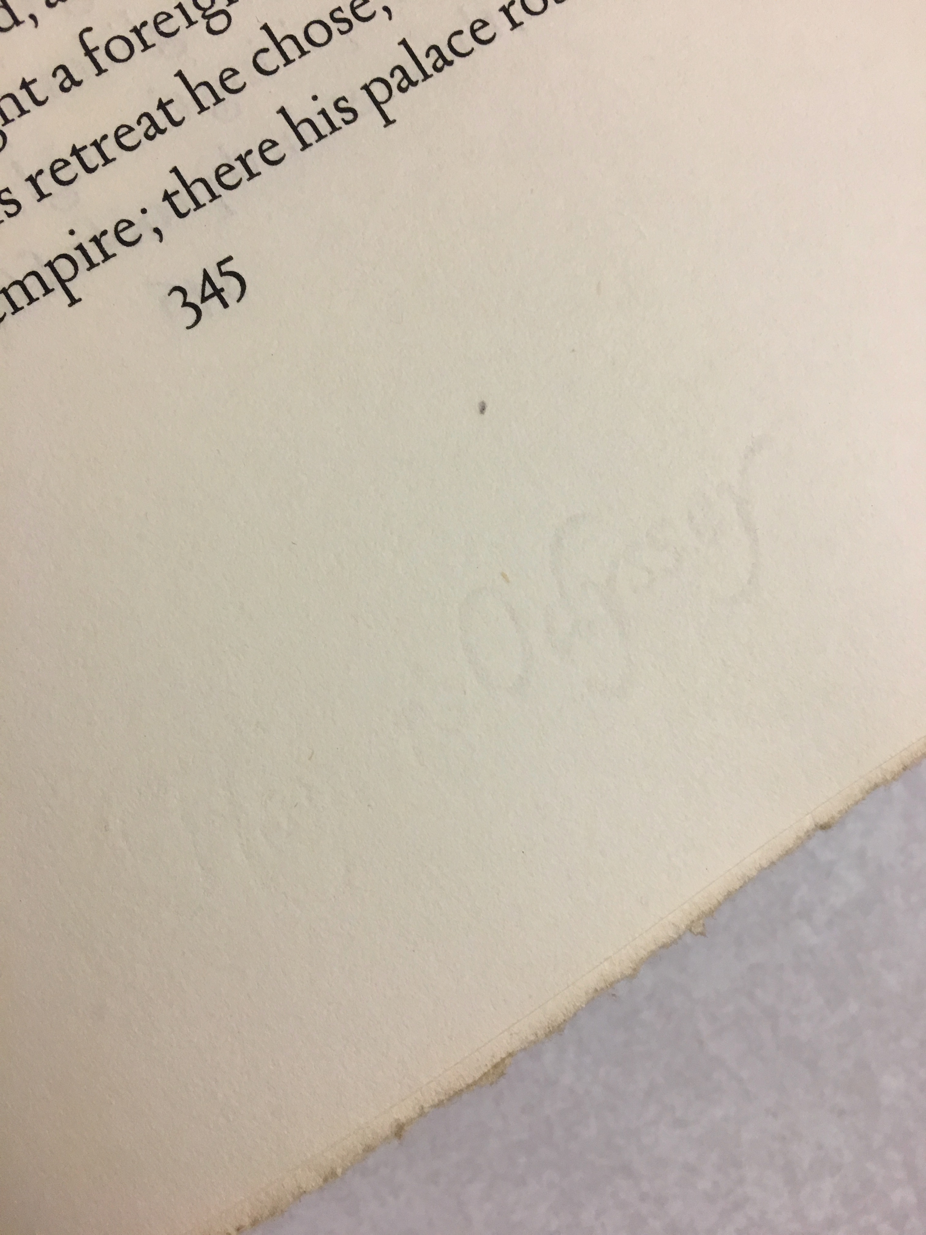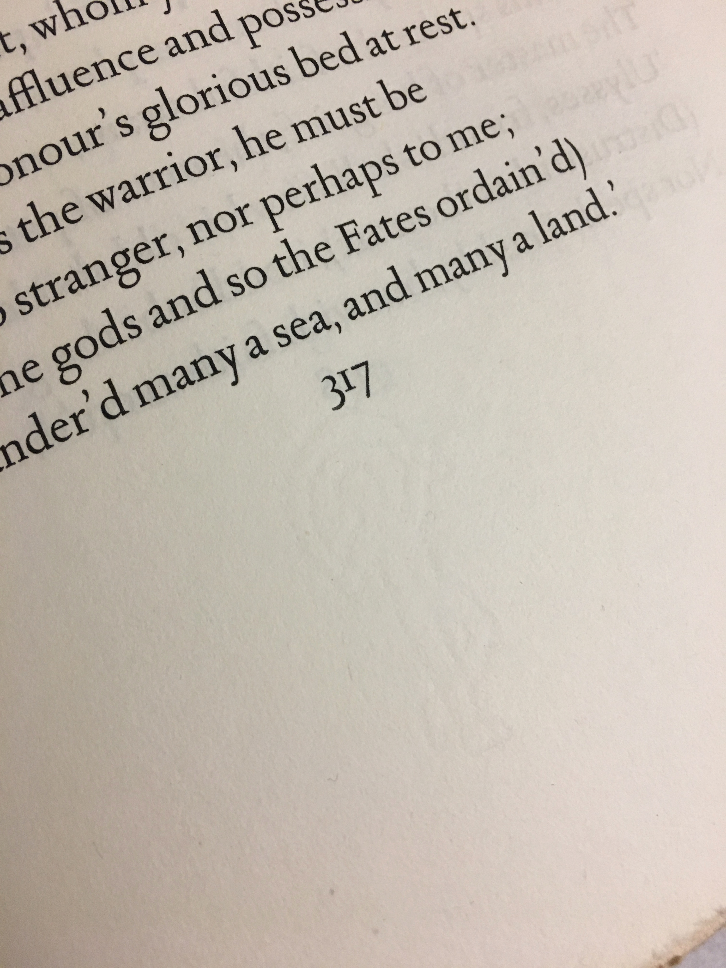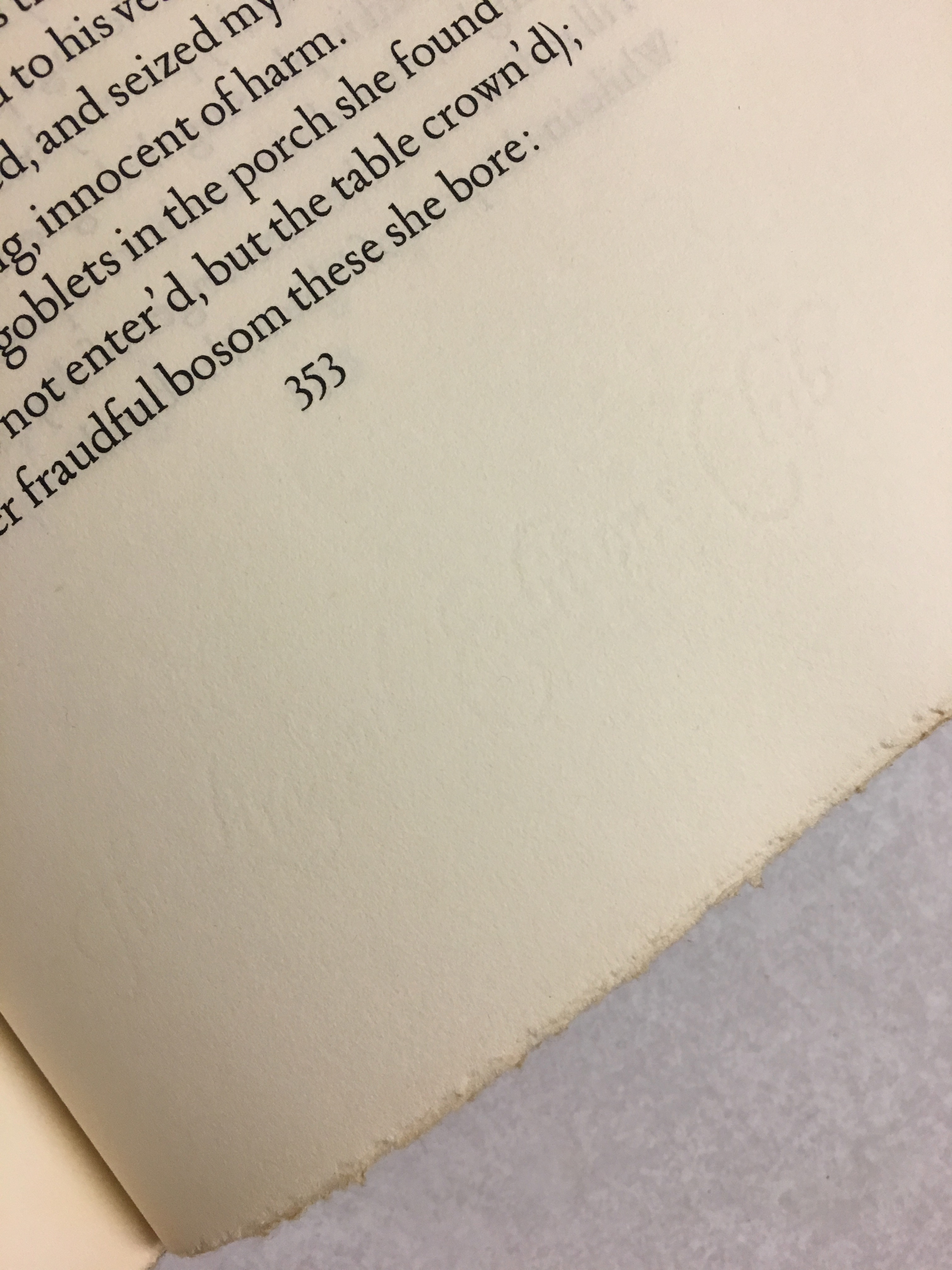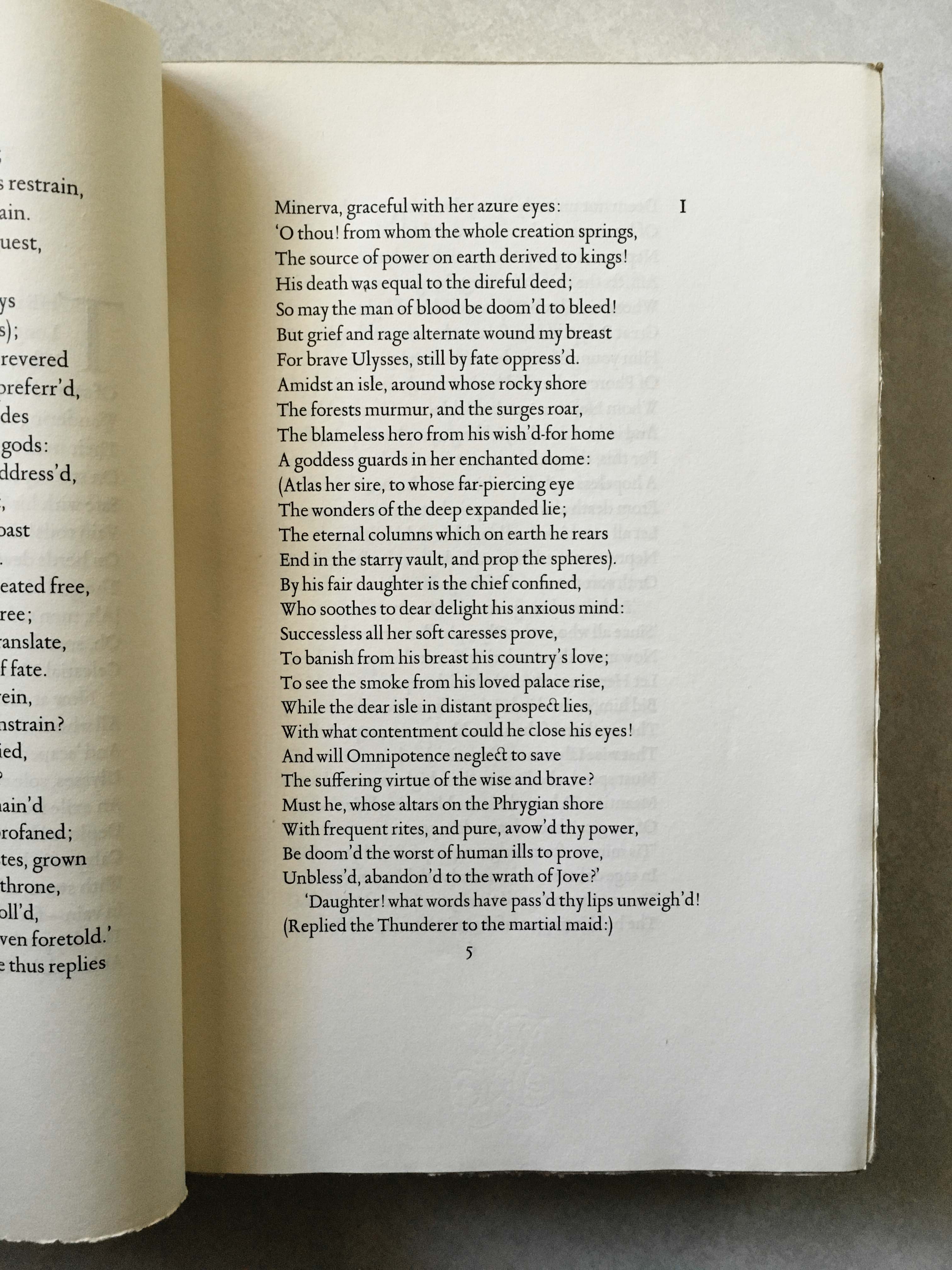 The book title “The Odyssey of Homer” only appears on the spine in all caps, embossed in gold. Other than drop caps, there is no illustration inside. The pages’ top edge are gold glided, and the reading edges are deckled. Some pages are not even cut open.