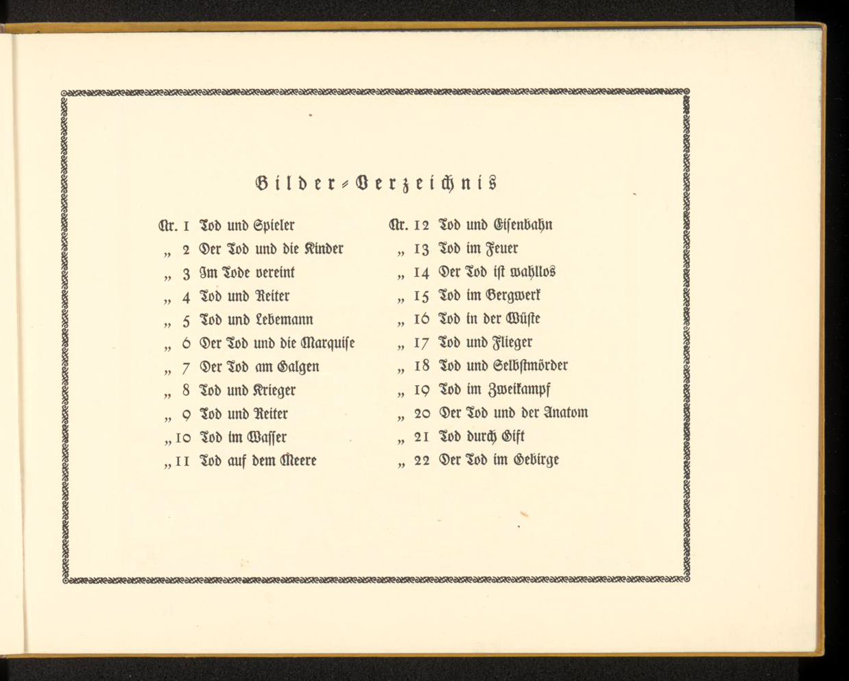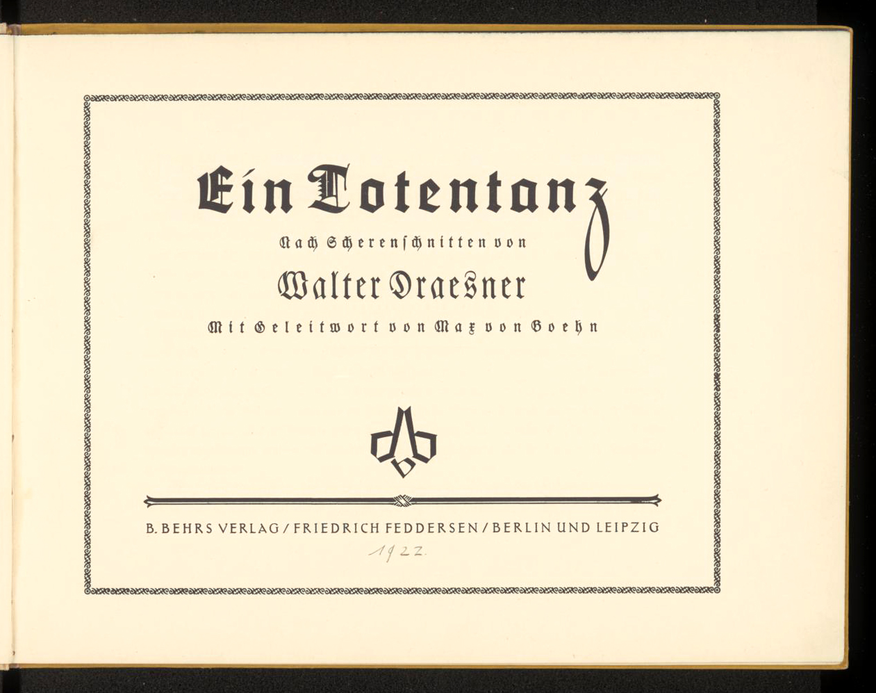 Ein Totentanz (A Danse Macabre) is a series of reproduced silhouettes cut by Walter Draesner and published in 1922 by B. Behrs Verlag / Friedrich Feddersen, Berlin and Leipzig, with an introduction by Max von Boehn. Universitäts- und Landesbibliothek Düsseldorf has made an electronic edition available under a CC0-License (Public Domain Dedication).