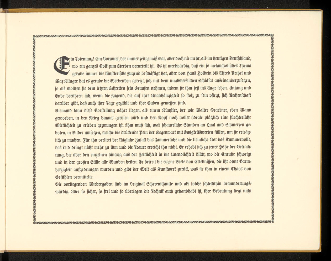 The Gotisch typeface on the title page is Rudolf Koch’s Maximilian (1917), with a decorated capital ‘T’ and a swash alternate ‘z’. The drop cap in the introduction is also from Maximilian’s Zierbuchstaben. The artist’s name, the introduction text and the table of contents are set in Ehmcke-Fraktur (1912). The publisher’s name is rendered in caps from Ehmcke-Rustika (1914).