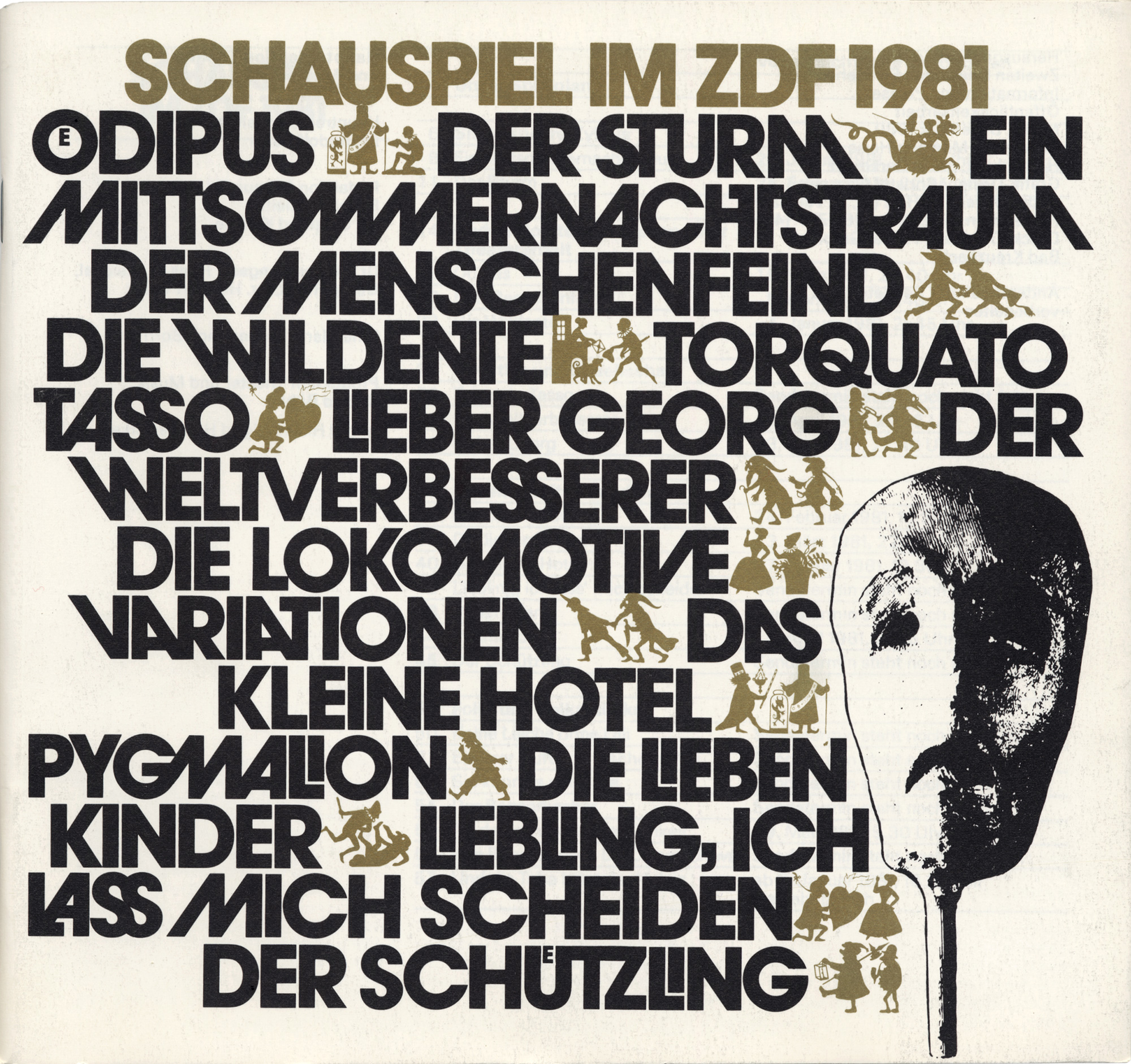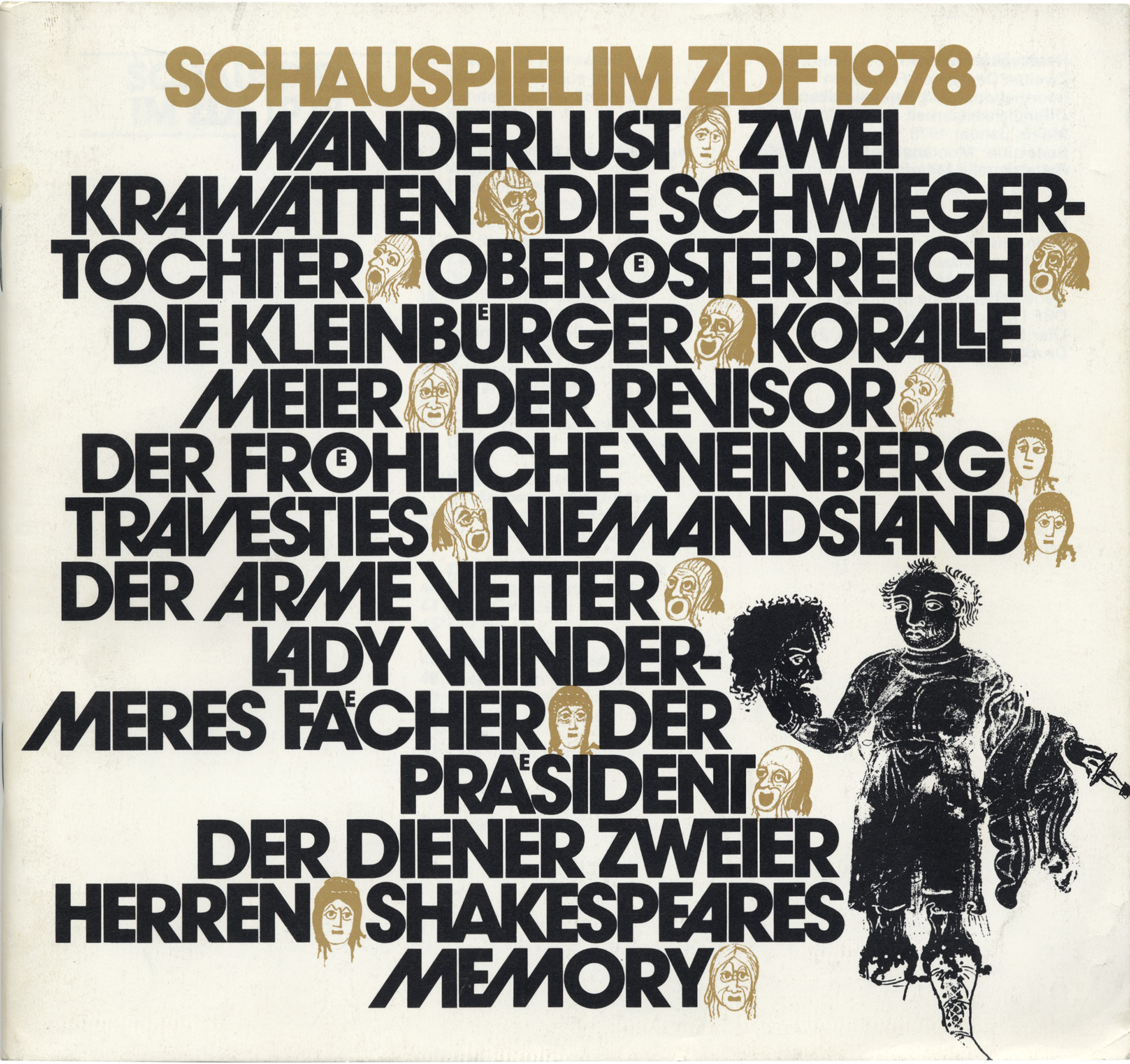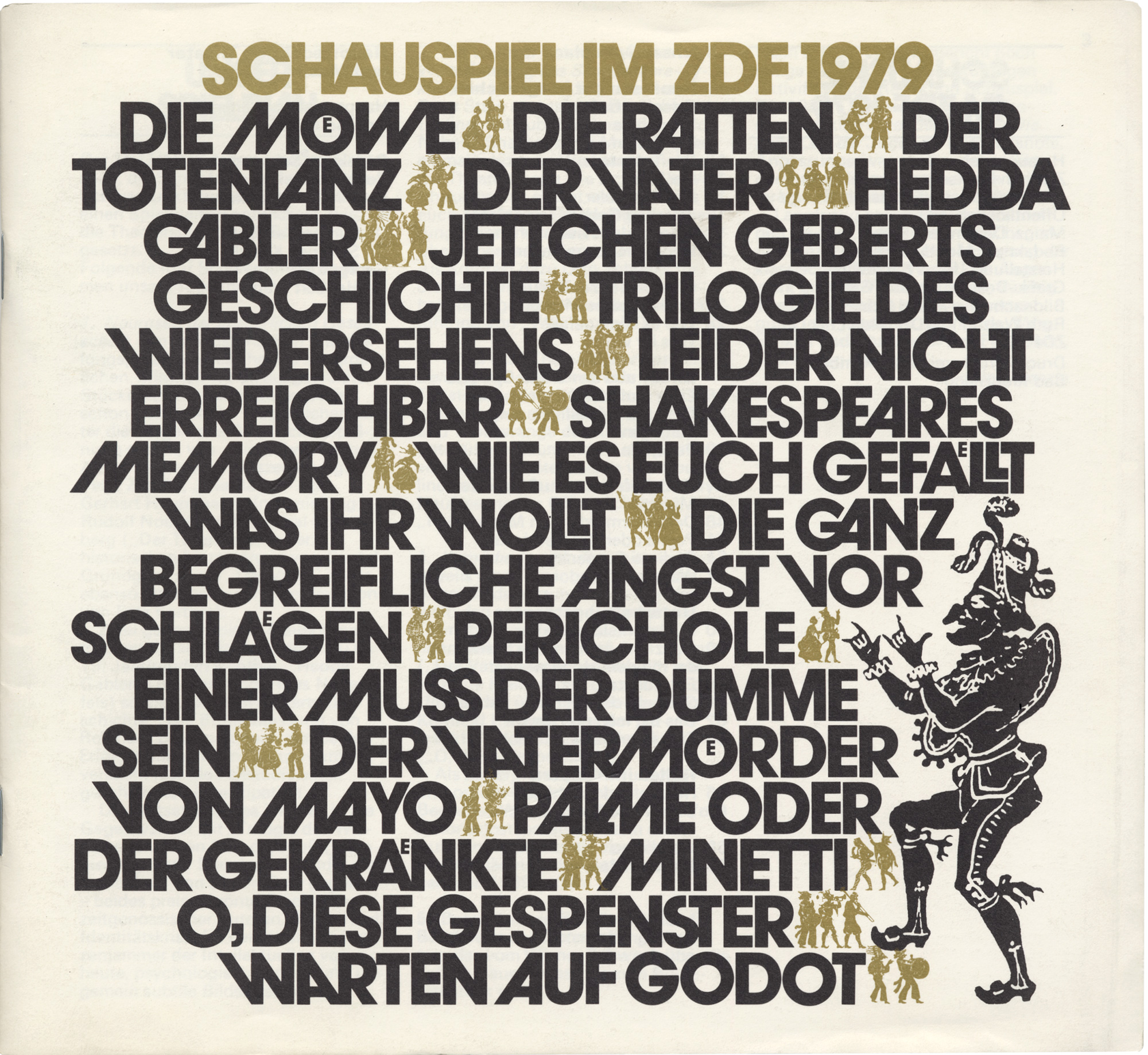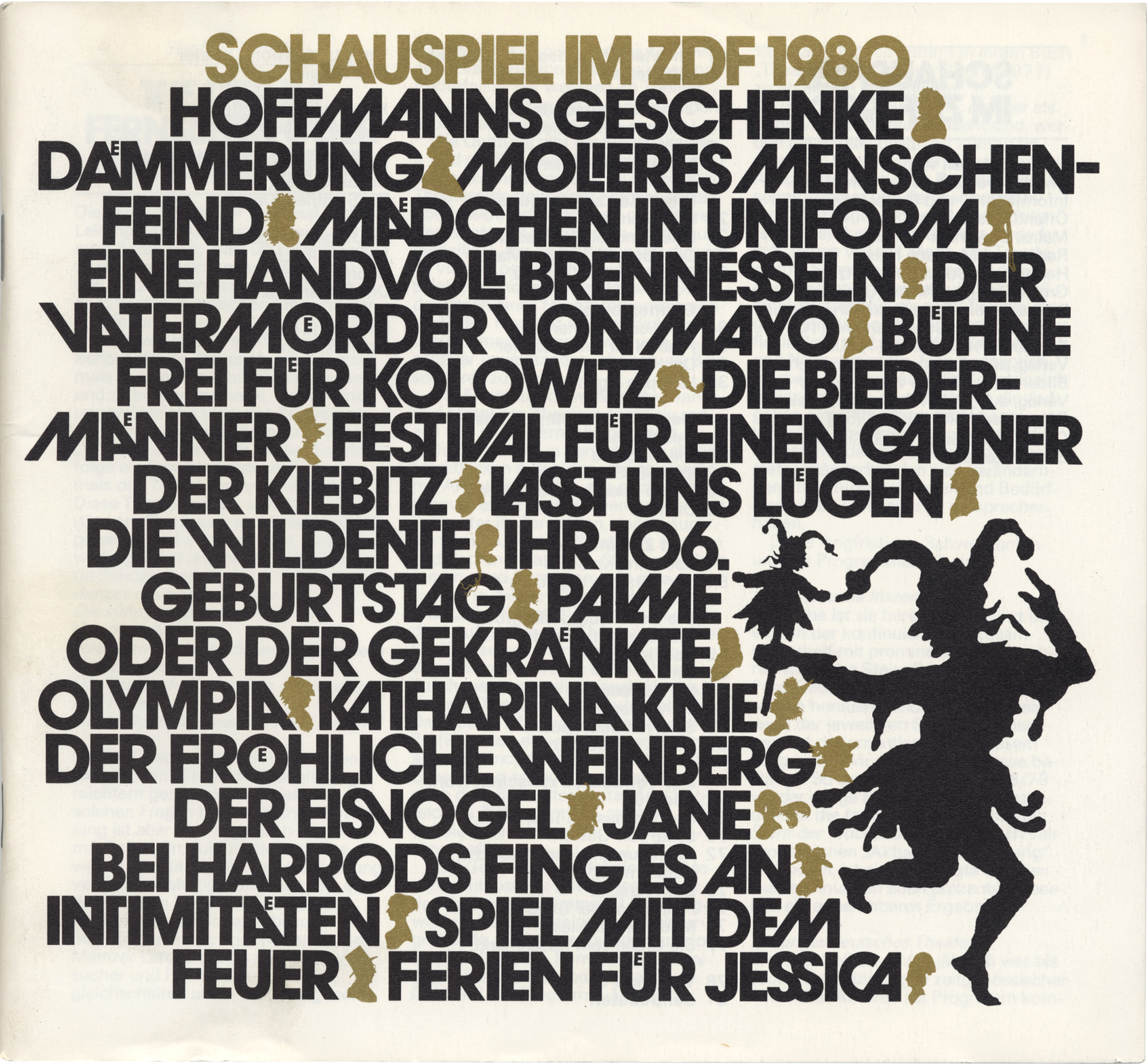 The brochures featured here advertise theatrical programming on ZDF from 1979 to 1983. Each 21×19.8 cm issue has black-and-gold covers and three to six opening spreads of display typography, much of it masterfully set in Avant Garde, and some in other fantastical designs, including Gassner’s own typeface, Knirsch. All issues credit Gassner for graphic design and Jobst Barkewitz for production.