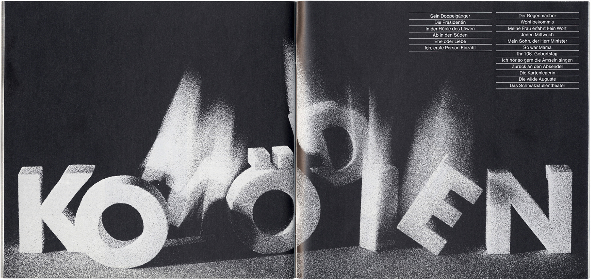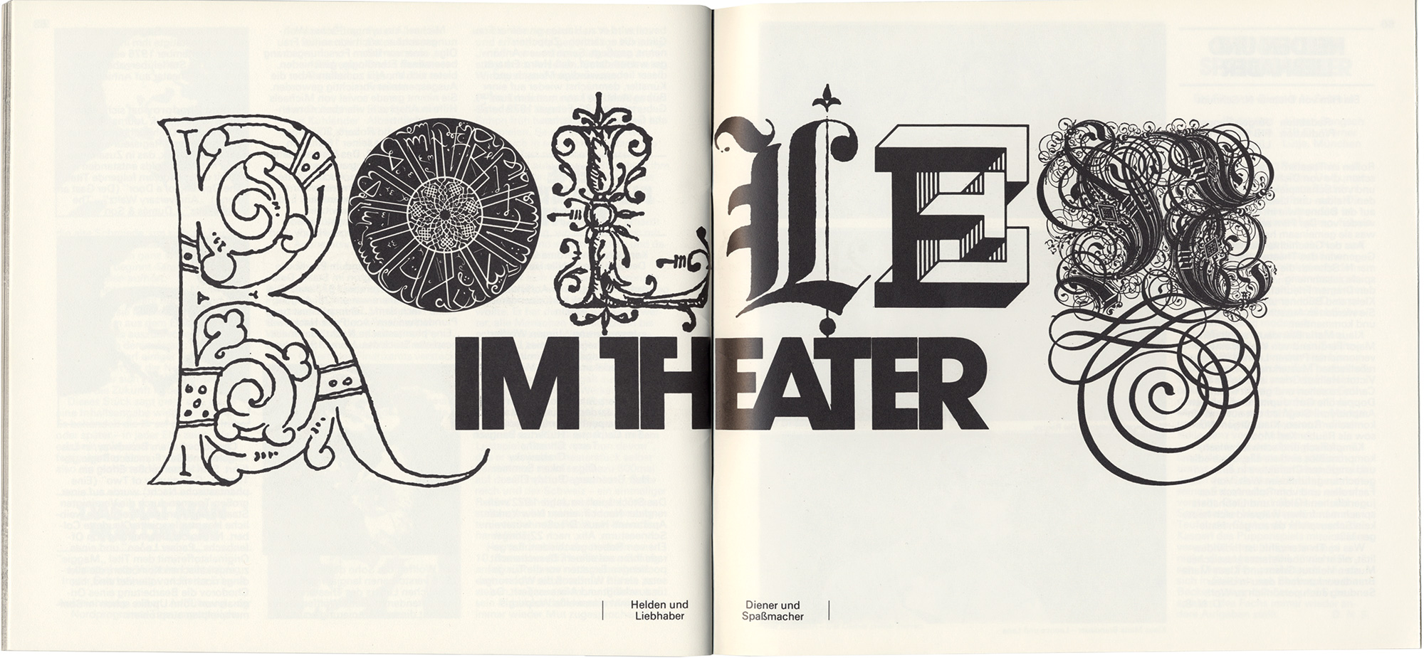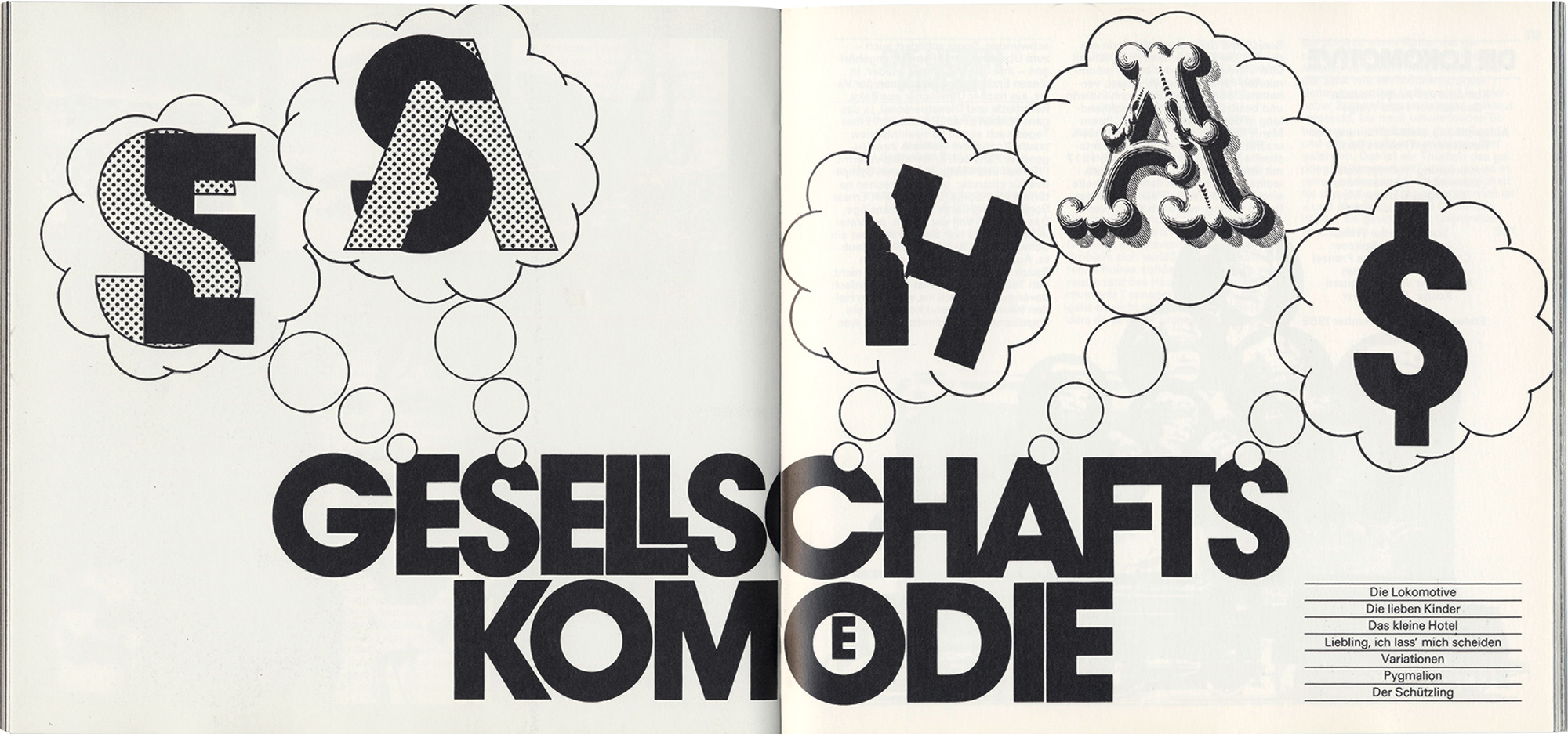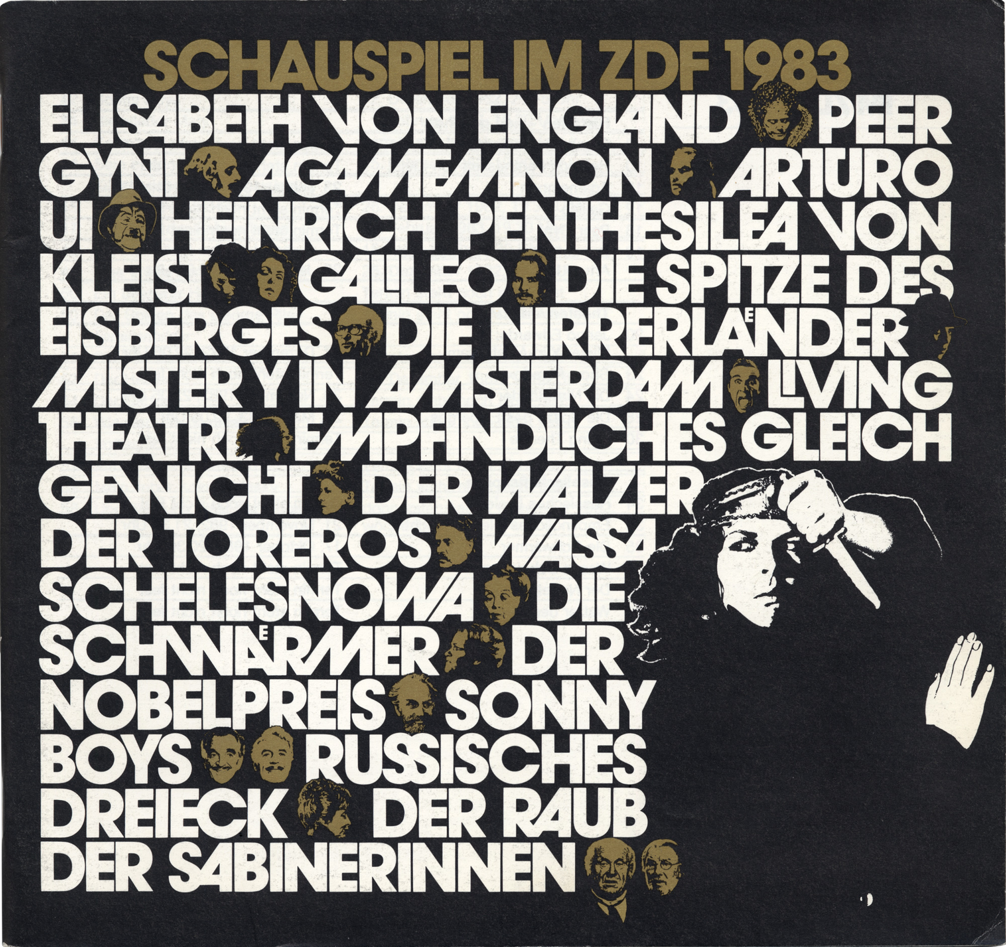 The brochures featured here advertise theatrical programming on ZDF from 1979 to 1983. Each 21×19.8 cm issue has black-and-gold covers and three to six opening spreads of display typography, much of it masterfully set in Avant Garde, and some in other fantastical designs, including Gassner’s own typeface, Knirsch. All issues credit Gassner for graphic design and Jobst Barkewitz for production.