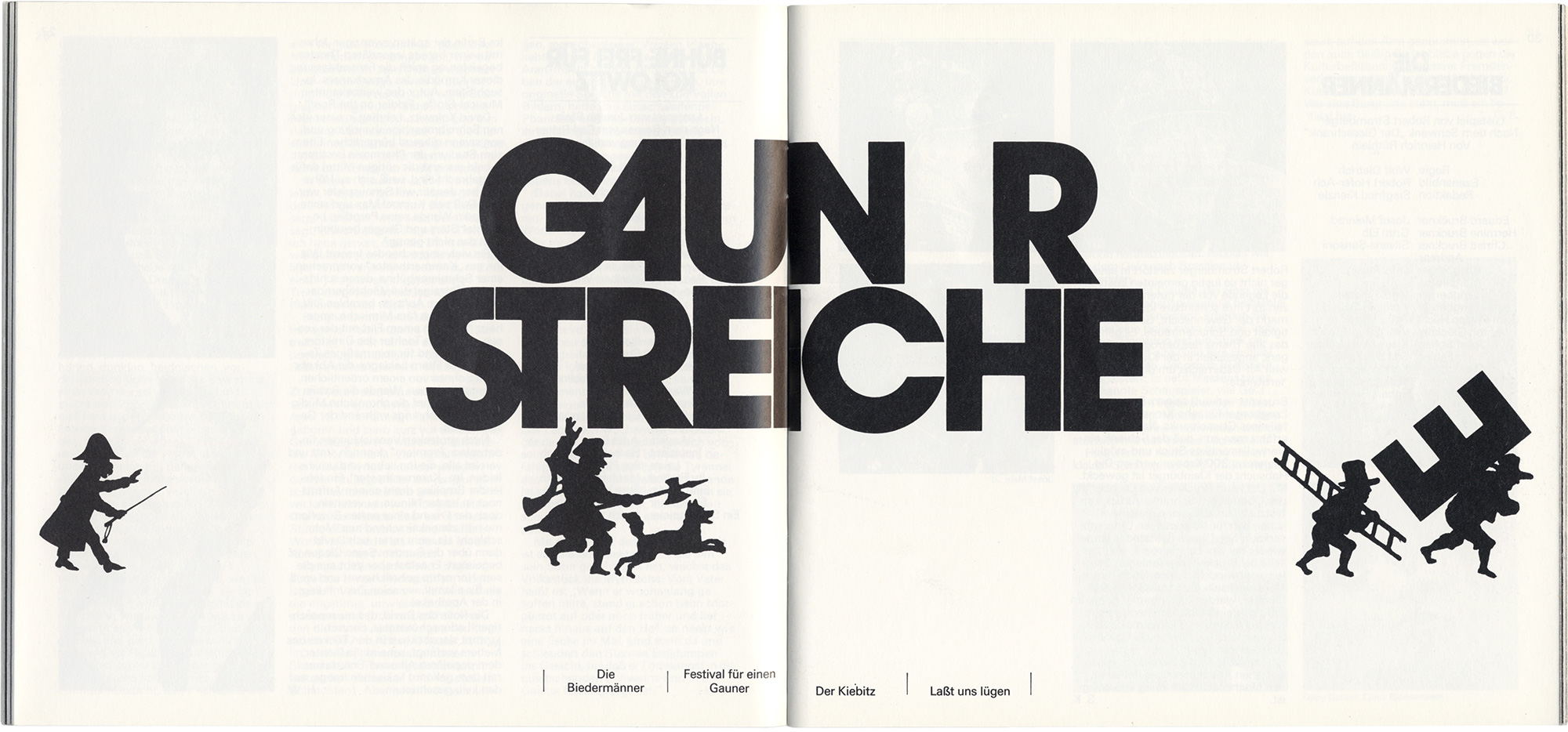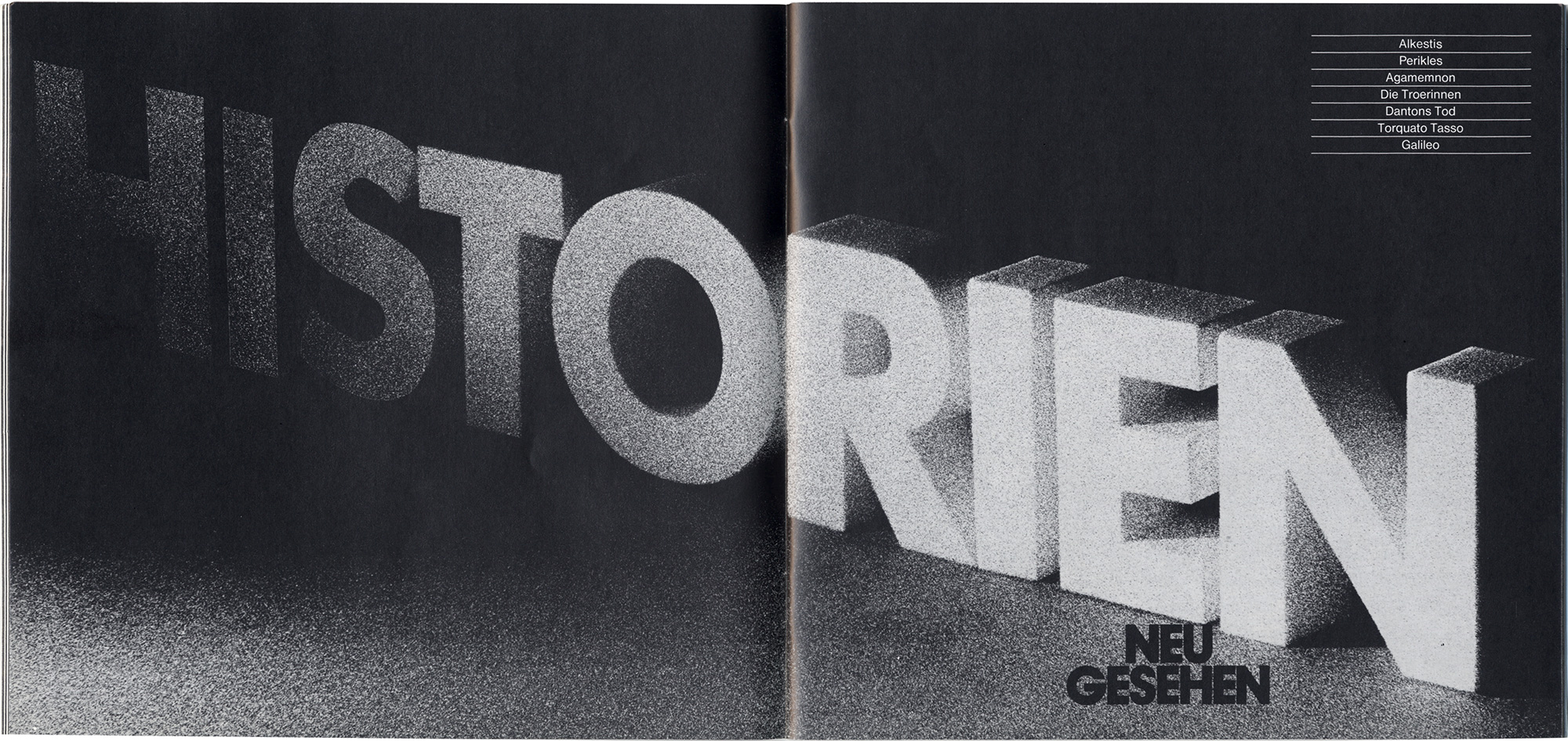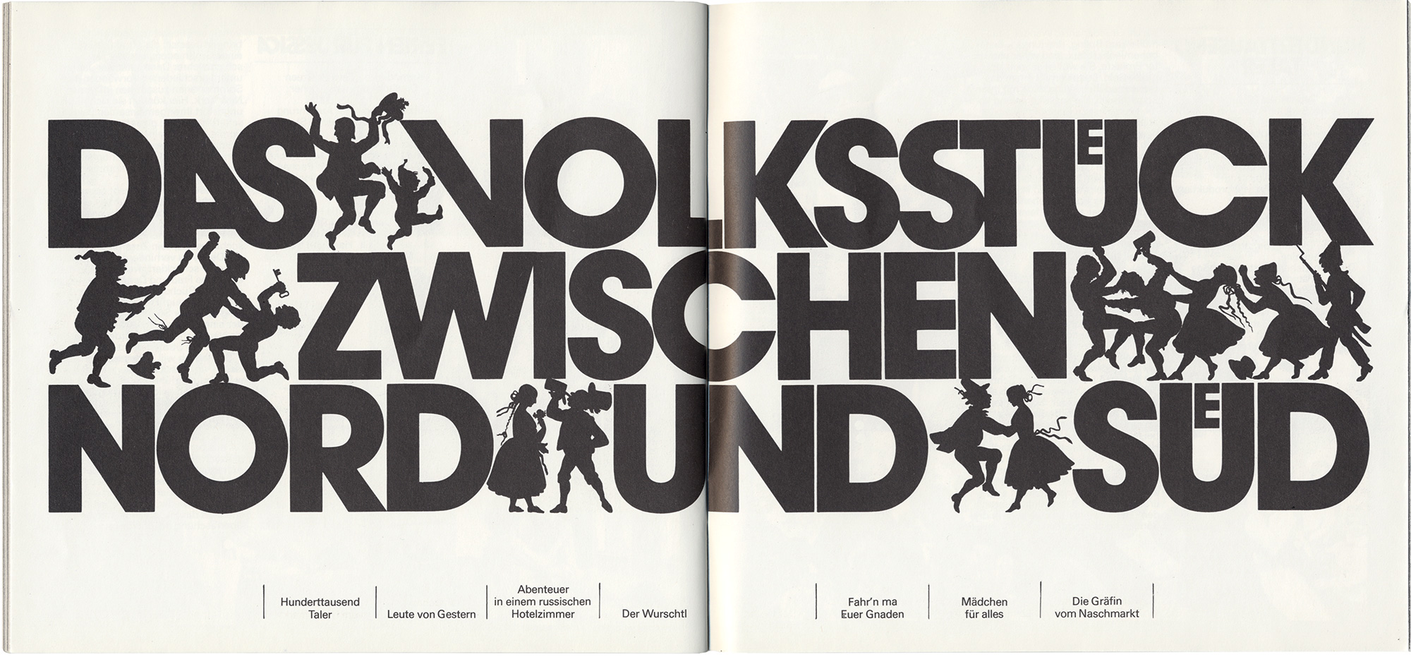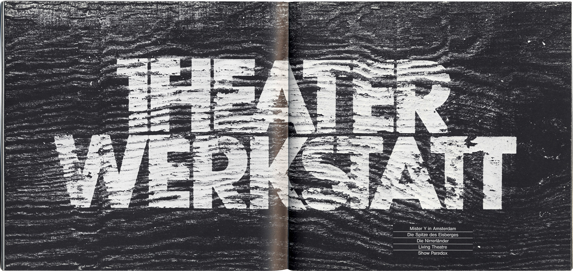 The brochures featured here advertise theatrical programming on ZDF from 1979 to 1983. Each 21×19.8 cm issue has black-and-gold covers and three to six opening spreads of display typography, much of it masterfully set in Avant Garde, and some in other fantastical designs, including Gassner’s own typeface, Knirsch. All issues credit Gassner for graphic design and Jobst Barkewitz for production.