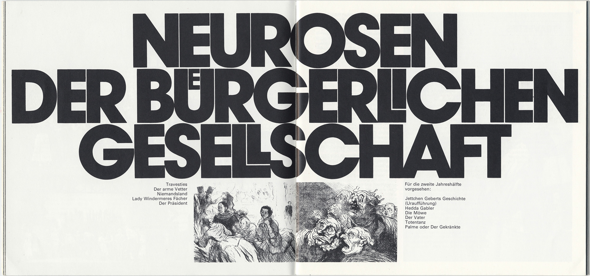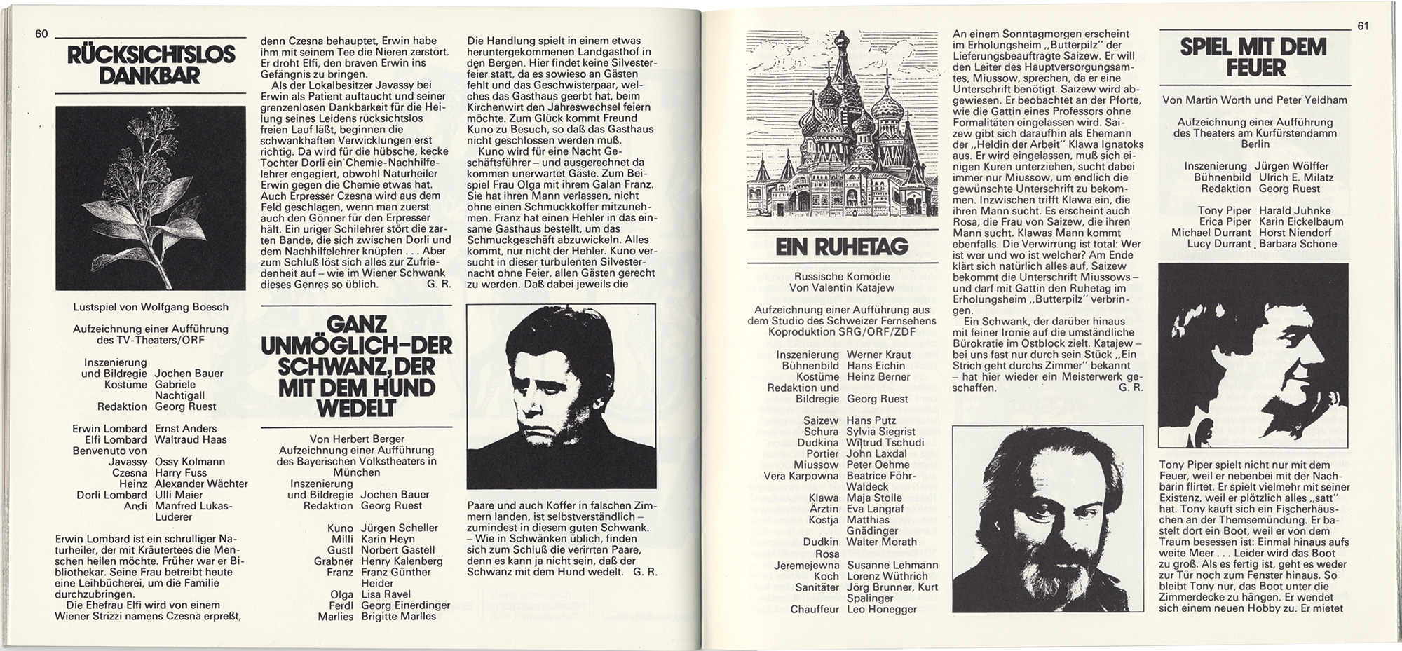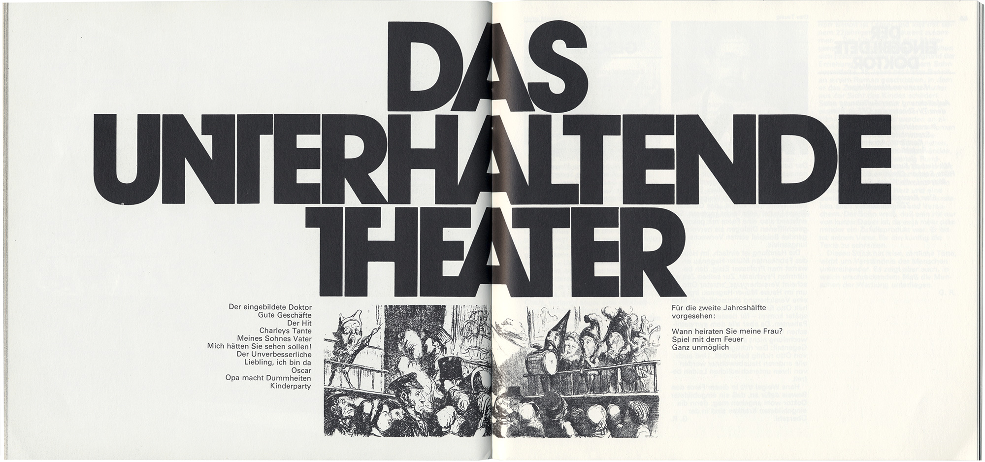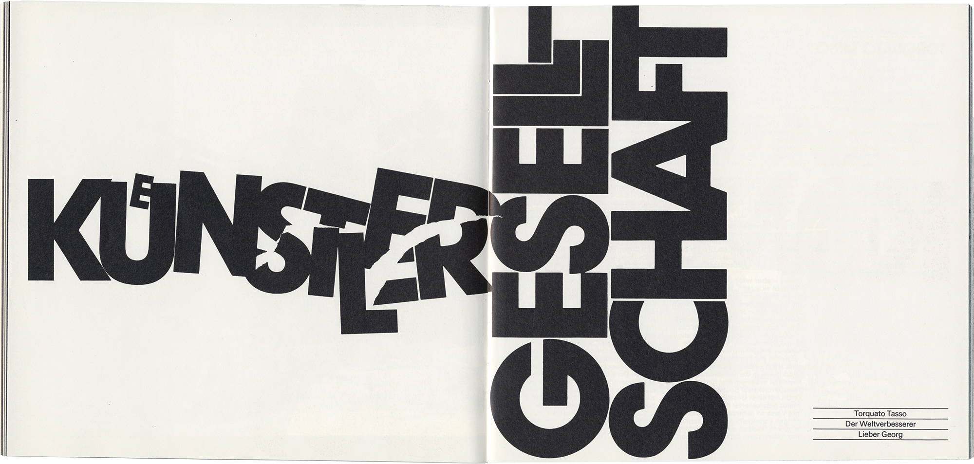 The brochures featured here advertise theatrical programming on ZDF from 1979 to 1983. Each 21×19.8 cm issue has black-and-gold covers and three to six opening spreads of display typography, much of it masterfully set in Avant Garde, and some in other fantastical designs, including Gassner’s own typeface, Knirsch. All issues credit Gassner for graphic design and Jobst Barkewitz for production.