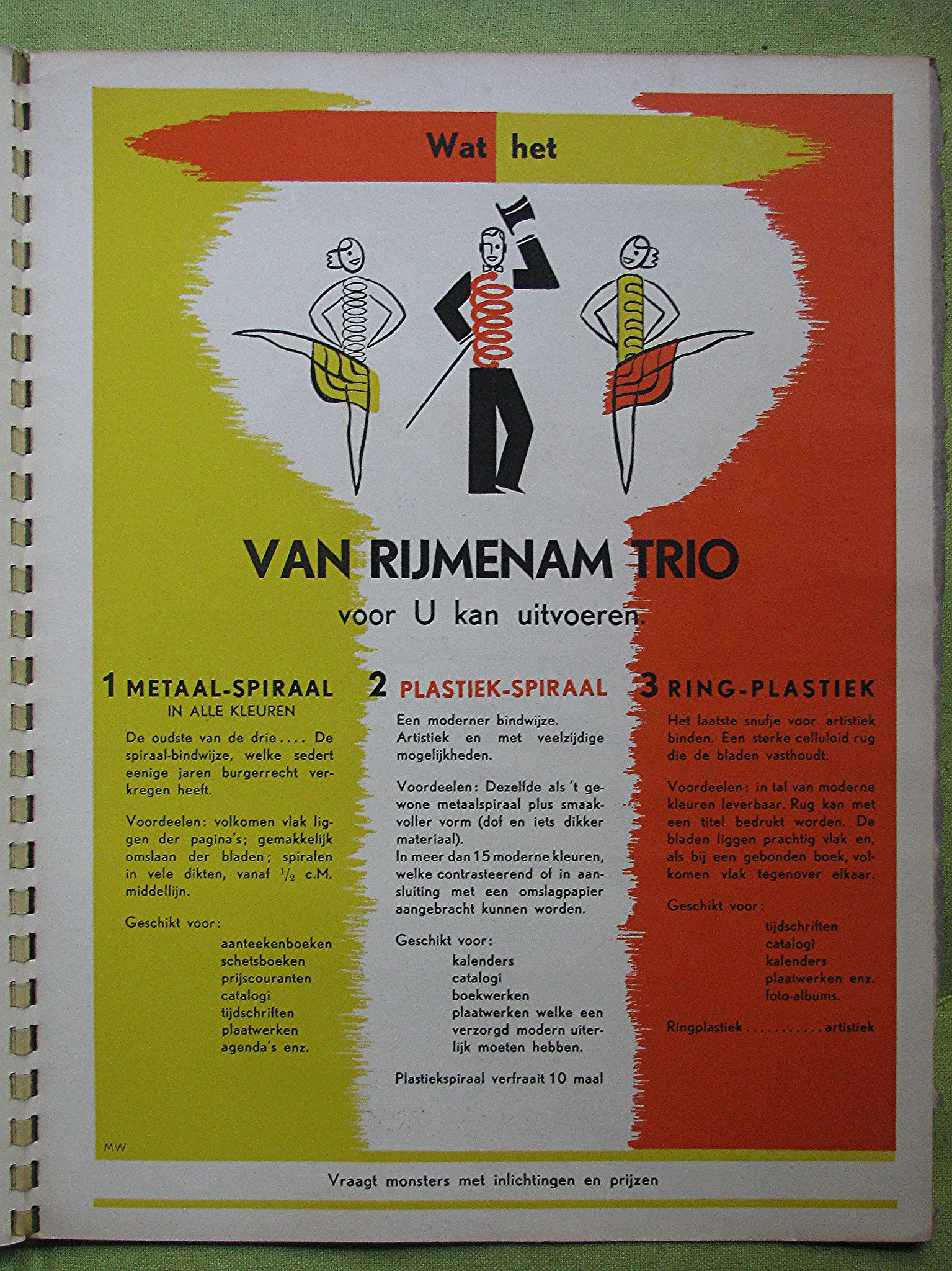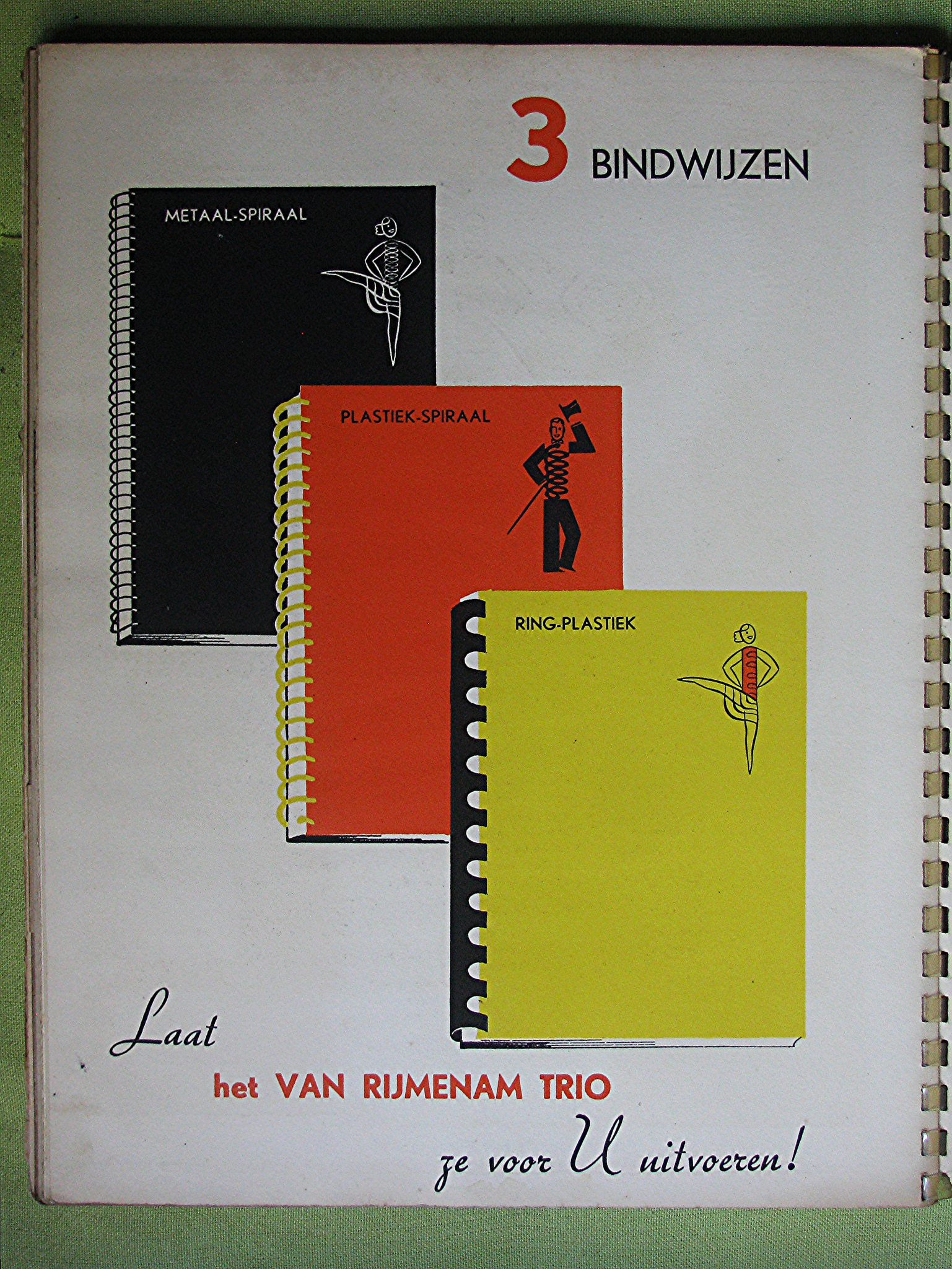 Ad in Drukkers Weekblad (Printers’ Weekly), Christmas edition 1938, presenting the three binding methods offered by H. van Rijmenam’s bookbindery, Oranjelaan 21, The Hague.