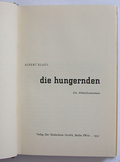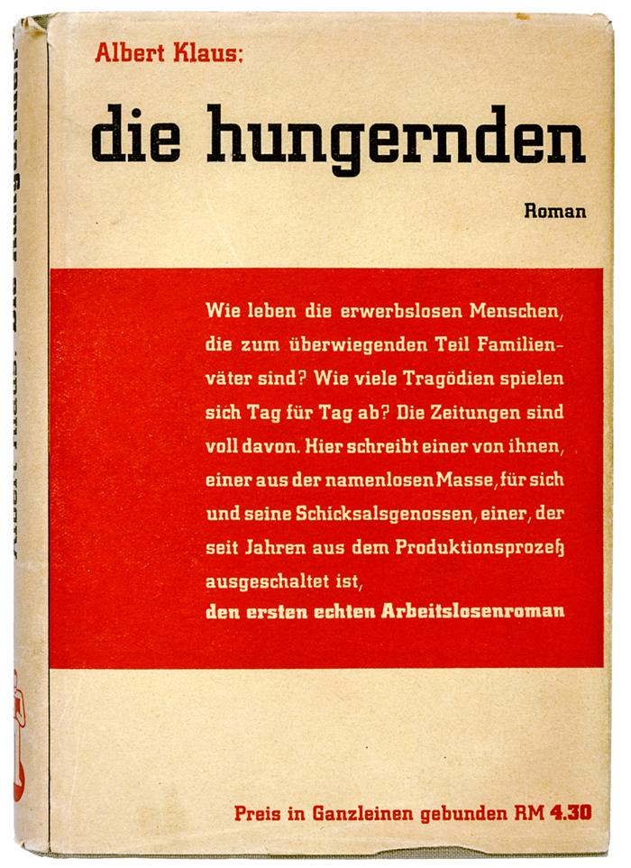 “The Starving”, a socio-critical novel published by Der Bücherkreis, a Socialist book club during the Weimar Republic. The description/subtitle on Tschichold’s book jacket calls it the first novel about the unemployed.