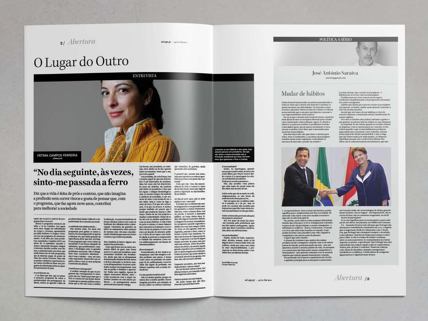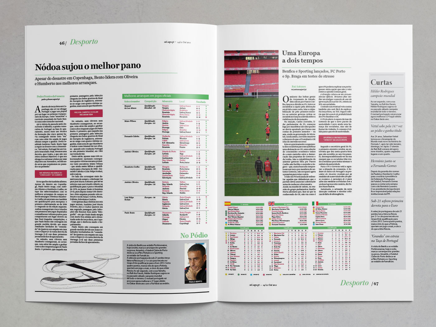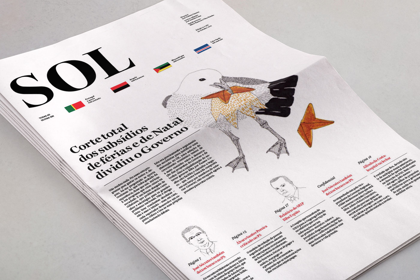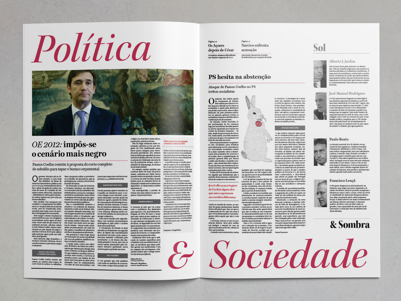 This academic exercise was to reimagine the logo and some spreads for the Portuguese newspaper Sol, Issue #268, October 14th, 2011. The textual content was fixed: would be exactly the same as the existing edition. Images also had to comply with the same number existing in the original newspaper, however we determined their size and importance.