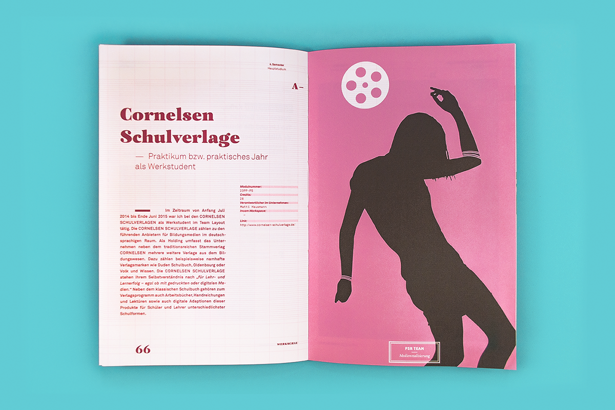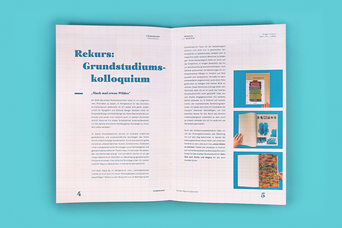 Werkschau — Auf dem Weg zum Spezialisten is a compendium of the various works created at the FHPotsdam. It displays a cross-section of the design knowledge and skills acquired in the second part of the study and thus serves as proof of the qualification as a designer.