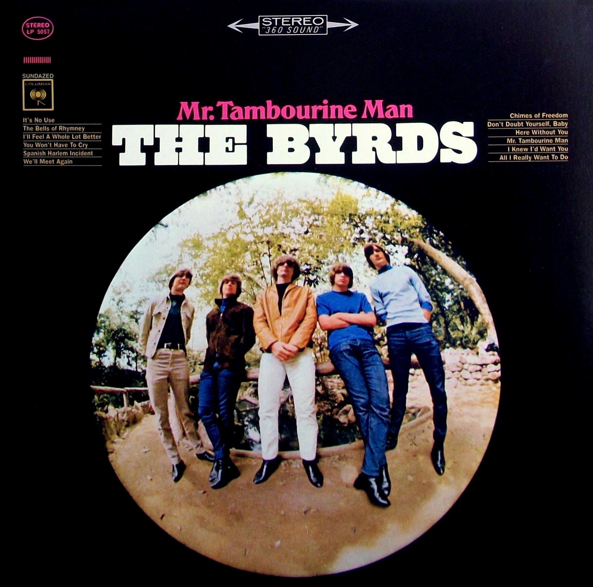 “Mr. Tambourine Man is the debut album by the American folk rock band The Byrds and was released in June 1965 on Columbia Records. The distinctive front cover fisheye lens photograph of the band was taken by Barry Feinstein.” — Wikipedia