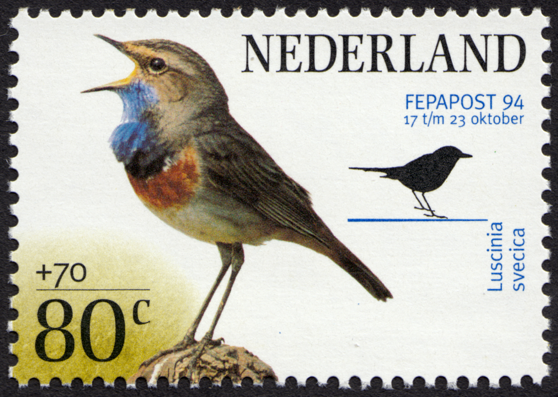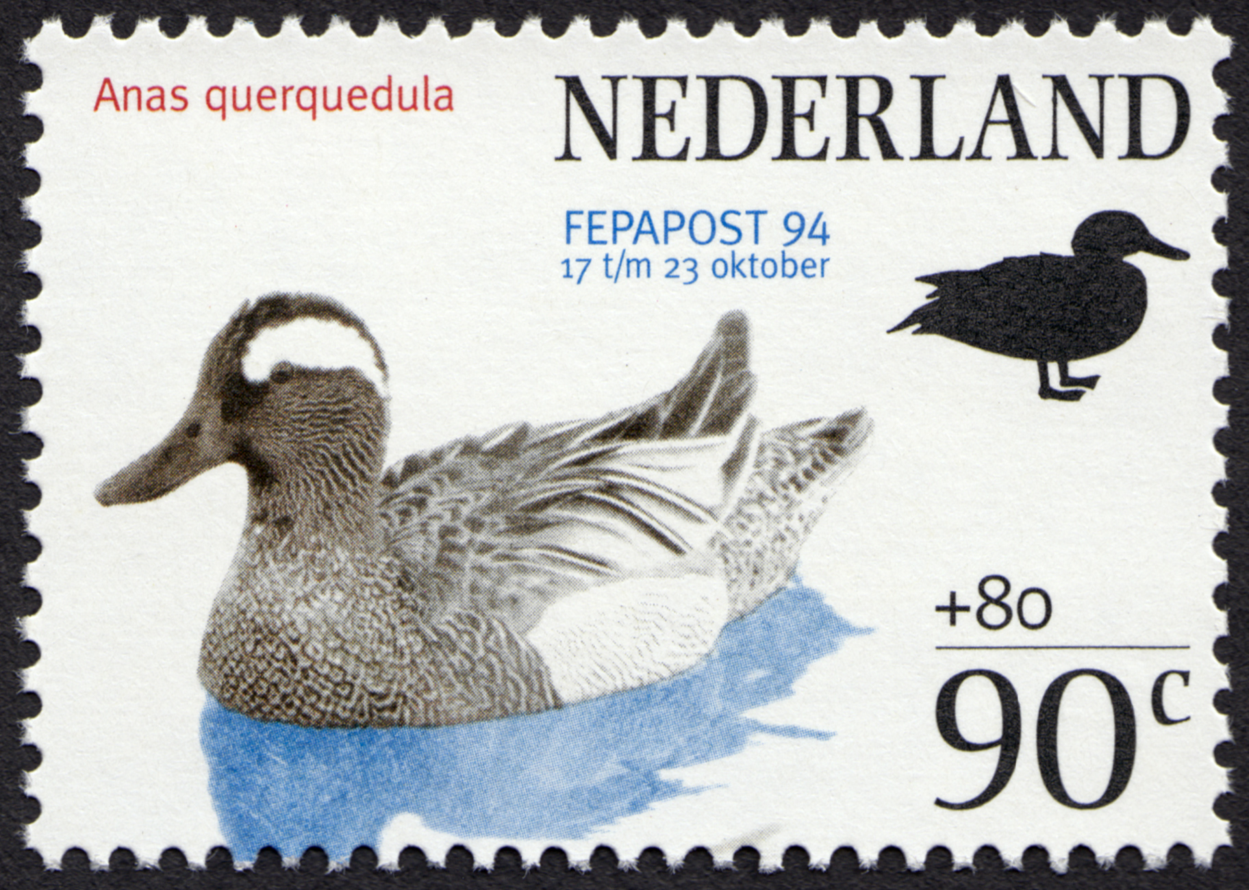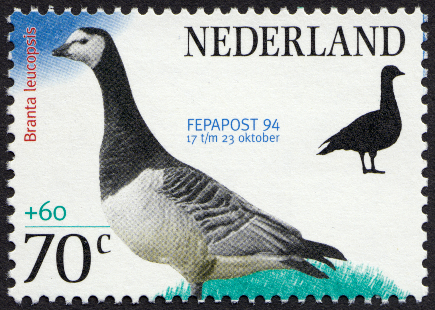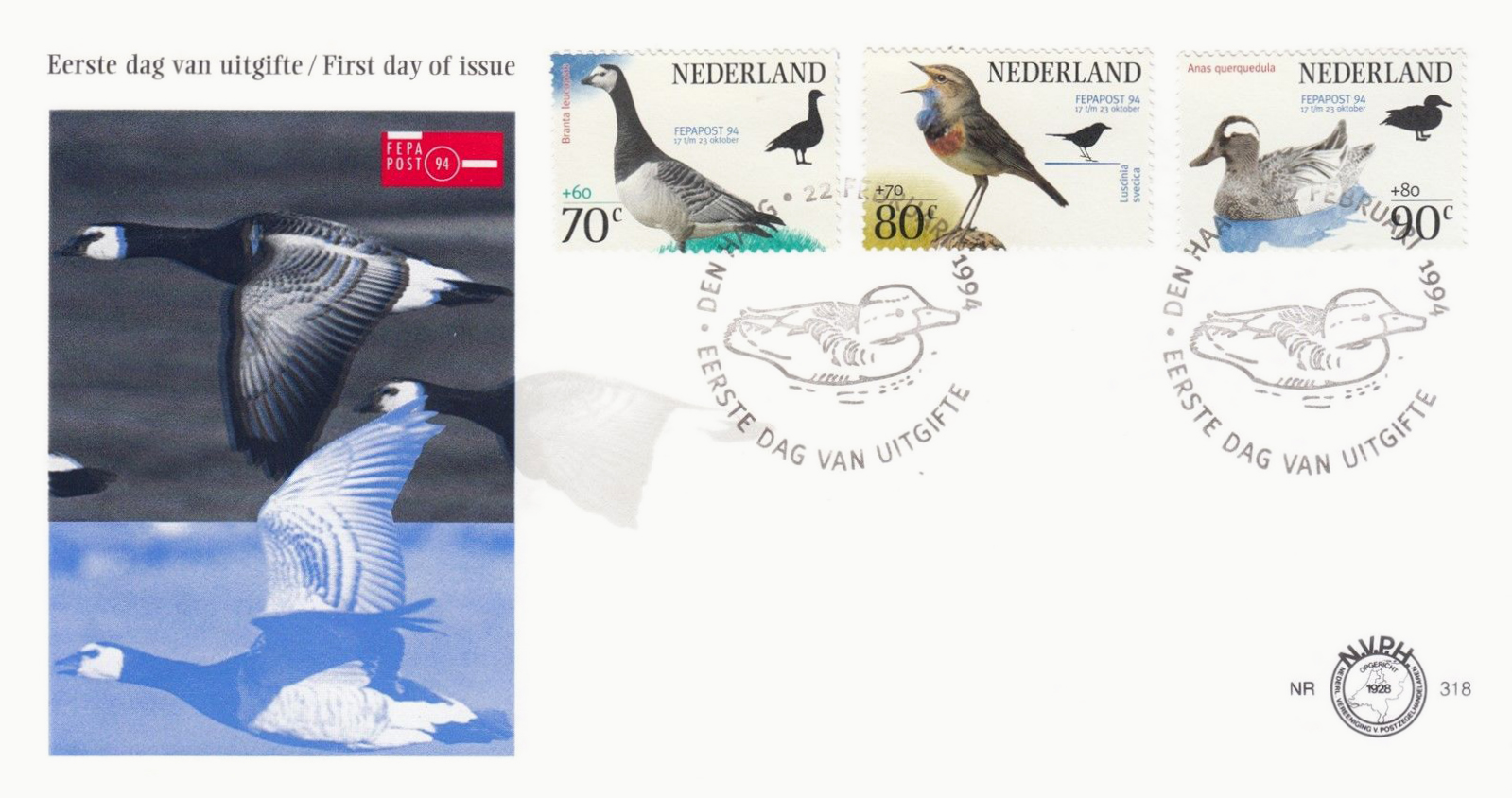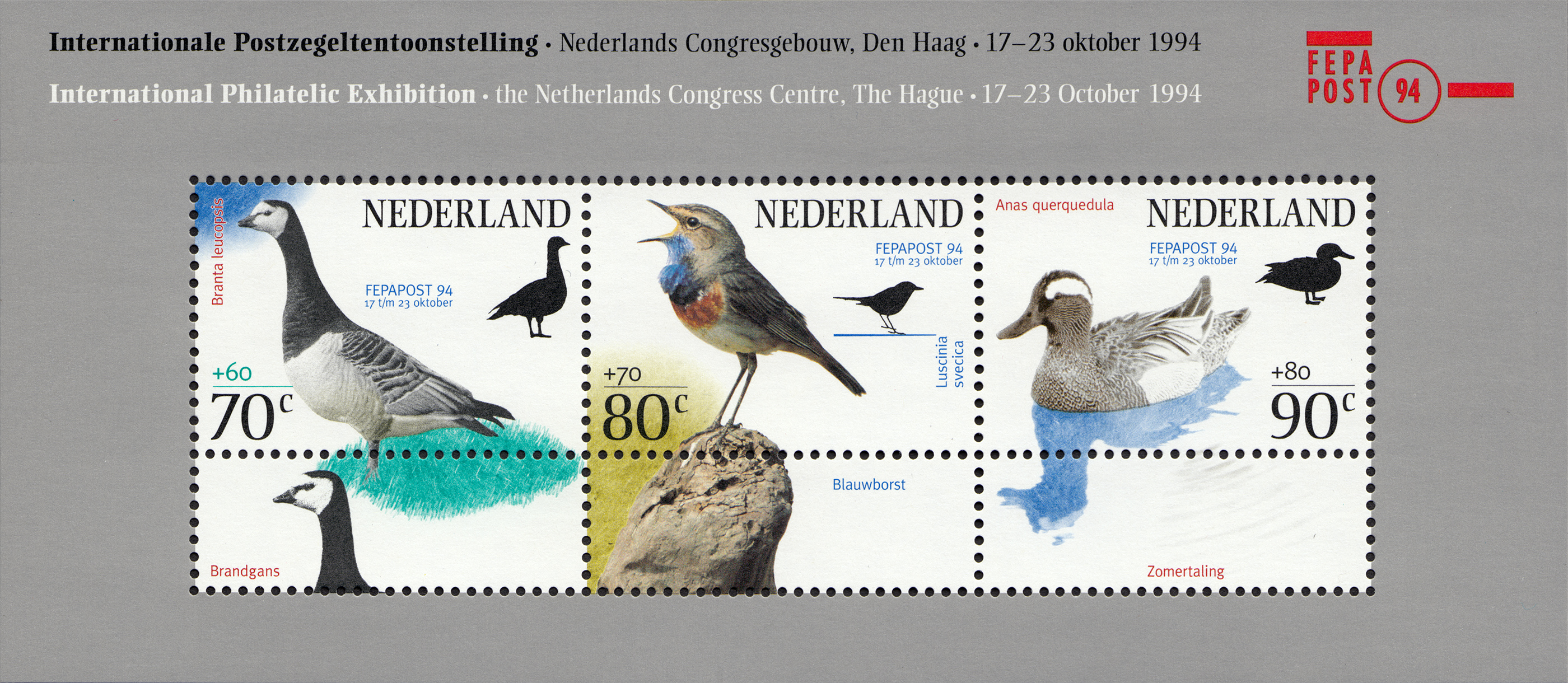 Dutch stamp series issued by Koninklijke PTT Nederland NV on the occasion of the international philatelic exhibition FEPAPOST 94 in the Netherlands Congress Centre, The Hague. The stamps show three bird species; the barnacle goose (Branta leucopsis), the bluethroat (Luscinia svecica), and the garganey (Anas querquedula).
