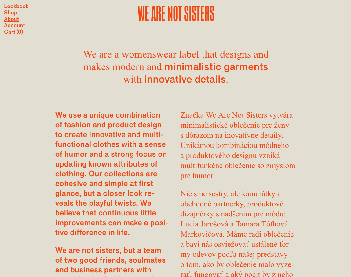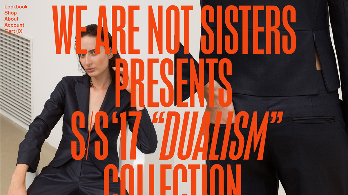 We Are Not Sisters website Contributed by ricordo on Mar 9th, 2017. Artwork published in circa 2017. License: All Rights Reserved. License: All Rights Reserved. License: All Rights Reserved. Source: wearenotsisters.com License: All Rights Reserved. Typefaces More about Maria (Baber)Get Maria (Baber)More about Times New RomanGet Times New RomanMore about PlacardGet Placard Formats Web (5513) Topics Fashion/Apparel (1521) Retail/Shopping (1092) Designers/Agencies Kristina Bartosova (2) Tagged withcolored body text (891)red (813)type on an image (144)modified typeface (1718)modified typeface (1718)womenswear (76)websites (3468) Artwork location Slovakia (57) In SetsBrand Logo (Rachel Lattanzi) (20)Brand (LaTrice Davis) (5)Sans Serif (obr yoon) (203)before bags (Chad Schram) (22)Ecom (Lua Cieza) (6)HM (C P) (76)Web & Type (Juan Ortega) (83) Post a comment Name Email – will not be published Website Your response Submit Comment More Maria (Baber) in use Silk Handkerchiefs trilogy by Paul Haworthc. 2009Sam de GrootContributed by ricordo The Outline website (2016)2016Code and TheoryStéphane ElbazThe OutlineContributed by Love Lagerkvist Staff Pick The Avery Review websiteEric HuNothing in CommonContributed by ricordo Sponsor More in Retail/Shopping BigBi2019Rodrigo SaianiPlauLucas CampoiContributed by Rodrigo Saiani Anna Rosholt Jewellery2023Digital ButterContributed by Tammy Adendorff S. A. Mitchell, Miner of and Dealer in Mica, Alstead, New Hampshire business cardc. 1880Photo(s) by Alan Mays on Flickr. Salling ads2015727Contributed by Jan Maack More in Web Skyguide2021NoordContributed by TypeType Loro restaurant website2023The Graphic StandardContributed by Shane Bzdok Staff Pick KTZ website2014Ondřej ŘičicaContributed by Ondřej Řičica Overmoonc. 2022MuchoRob DuncanLyam BewryContributed by Mucho More Fonts In Use Jantzen Swimwear Ads, 1946–481946Contributed by Stephen Coles Staff Pick Horizonte #10: Widerstand/Resistance2015Happy Little AccidentsPaul StolleRobin WeißenbornContributed by Production Type Staff Pick Nordkapp2013NordkappContributed by Stephen Coles Staff Pick Ränder dieser Bilder, Natalie Brück at Stadtgalerie Saarbrücken2024Hannes BrischkeContributed by Hannes Brischke Staff Pick