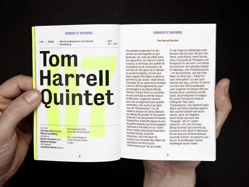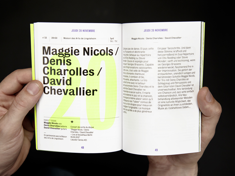 Jazzdor 2014 festival Contributed by Stephen Coles on Jan 28th, 2017. Artwork published in 2014. Source: www.helmo.fr License: All Rights Reserved. Posters and booklets for Jazzdor, jazz festivals in Strasbourg and Berlin. See other Jazzdor years, also designed by Helmo. Source: www.helmo.fr License: All Rights Reserved. Source: www.helmo.fr License: All Rights Reserved. Source: www.helmo.fr License: All Rights Reserved. Source: www.helmo.fr License: All Rights Reserved. Source: www.helmo.fr License: All Rights Reserved. Source: www.helmo.fr License: All Rights Reserved. Source: www.helmo.fr License: All Rights Reserved. Source: www.helmo.fr License: All Rights Reserved. Source: www.helmo.fr License: All Rights Reserved. Source: www.helmo.fr License: All Rights Reserved. Typefaces More about Bureau GrotGet Bureau Grot Formats Posters/Flyers (5879) Booklets/Pamphlets (2435) Topics Event (3291) Music (6457) Designers/Agencies Helmo (9) Tagged withJazzdor (3)jazz (496)music festivals (346)cropped type (509)overprint/multiply (381)transparent (104)programs (653)type on an angle (1364)all lowercase (905)one typeface family (1709)big type (1741)numerals (1116)two-color (1033) Artwork location Germany (3930) France (2912) Berlin (1167) Strasbourg (50) Montreuil (27) In SetsPersonal Favorites (Stephen Coles) (106)June 2020 (slee) (76) Post a comment Name Email – will not be published Website Your response Submit Comment More Bureau Grot in use The Silence of the Lambs (1991) title sequence1991M & Co.Contributed by Damian Treviño JanSport websiteContributed by Webtype International Handbook of Type Designers2007Contributed by Indra Kupferschmid Sponsor More in Music You Who Was Myself – Juice Webster2019Chayto NadinContributed by Chayto Nadin SEVENTEEN 2025 Season’s GreetingsHour Minute SecondsKwangmyung LimHyeonmo KimContributed by kim hyunmo CLIP website2023ManyoneContributed by Jan Maack Horacio Vaggione & 51717, ISSUE Project Room, New York2018Anja KaiserContributed by Pierre Pané-Farré More in Booklets/Pamphlets Saul Ray magazine2021KeenContributed by Daniel McQueen (TDF) Norbergfestival 2023 visual arts program2023Agga StageAlexander SöderContributed by Out of the Dark Magical Athlete2025SMLXLElizabeth GoodspeedContributed by Elizabeth Goodspeed Staff Pick You and the Night and the Music exhibition booklet2025SS16 StudioAndreaTabocchiniArchitectureContributed by Samira Schneuwly More Fonts In Use Extensions of Self2023Maria RudakovaContributed by Benoît Bodhuin Staff Pick Apple Advertising of the 1970s–80sc. 1977AppleContributed by Robin Rendle Staff Pick Mart Stam Preis 20232024Vreni KnödlerContributed by Lucas Le Bihan Staff Pick Casa Cardona wines2020Marçal PratsContributed by Marçal Prats Staff Pick