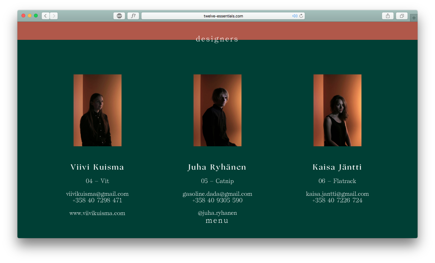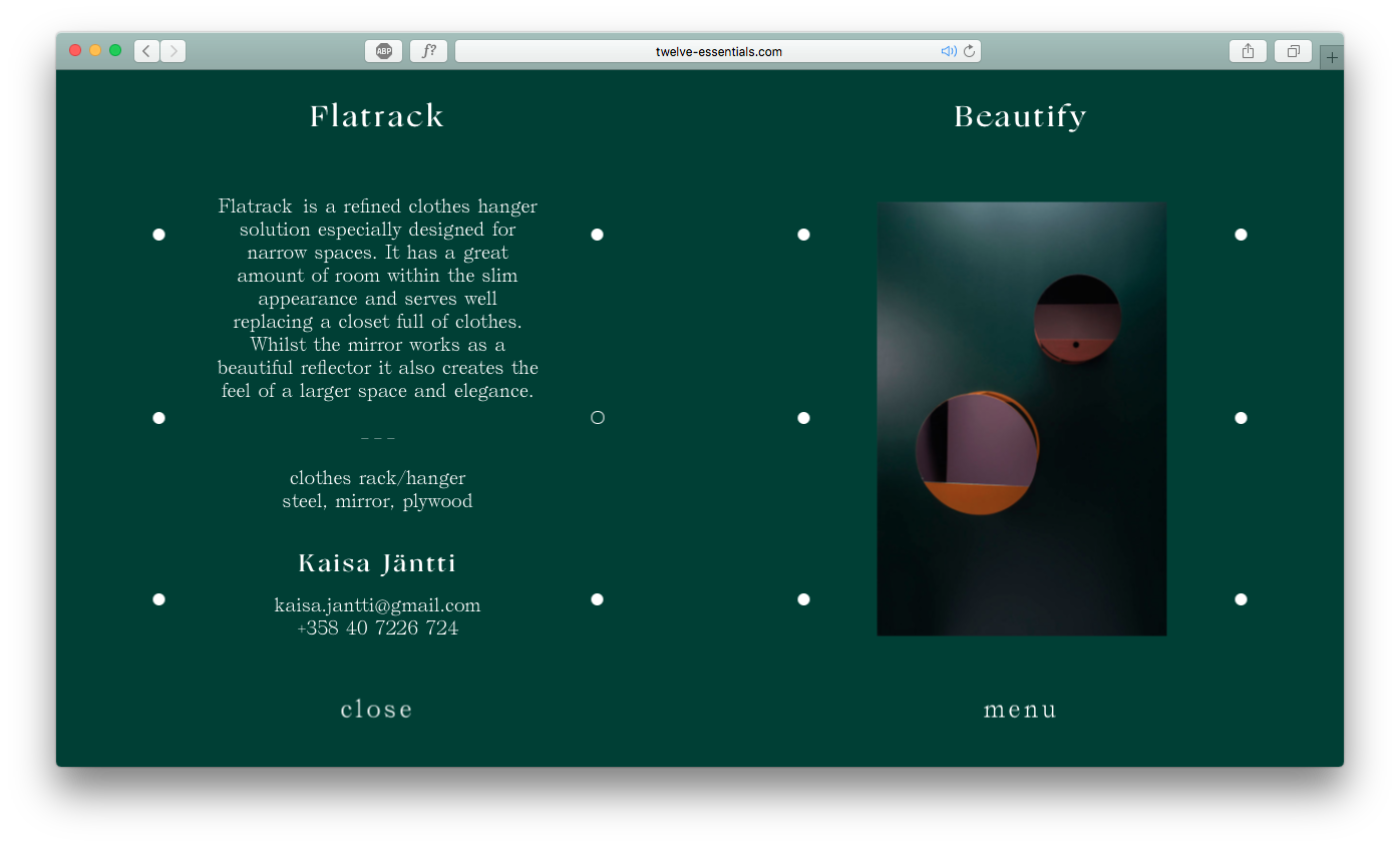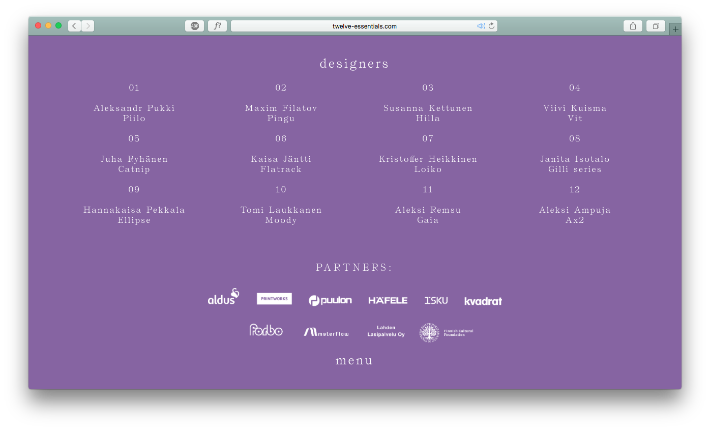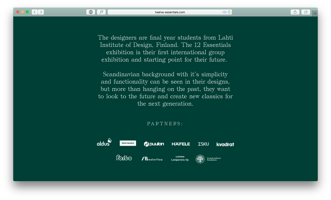12 Essentials is an exhibition by twelve young emerging designers. By studying the basic needs of human life they have designed twelve different objects which respond to our most deep desires. […] The designers are final year students from Lahti Institute of Design, Finland. The 12 Essentials exhibition is their first international group exhibition and starting point for their future.