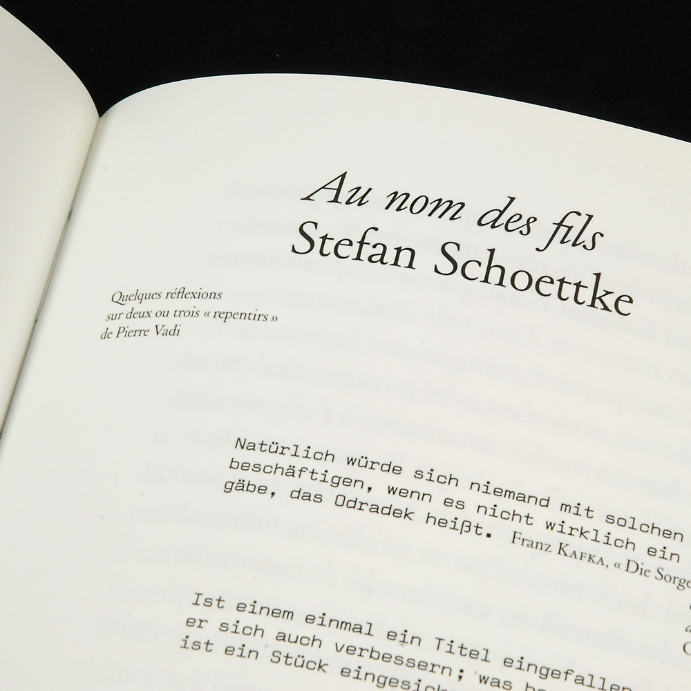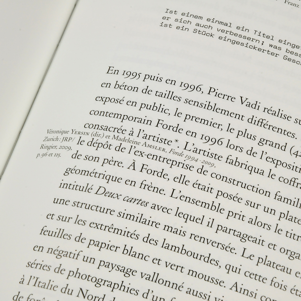 Pierre Vadi: Hotel Contributed by 205TF on Mar 11th, 2017. Artwork published in November 2011. Photo: 205TF. License: All Rights Reserved. Hotel is the first monograph about the artist Pierre Vadi. This book gathers a large collection of works and exhibitions, with a thousand of pictures, and three essays. Photo: 205TF. License: All Rights Reserved. Photo: 205TF. License: All Rights Reserved. Photo: 205TF. License: All Rights Reserved. Typefaces More about HenryGet HenryMore about LL ValentineGet LL Valentine Formats Books (6671) Topics Art (4789) Designers/Agencies Huz & Bosshard (20) Tagged withmonographs (265)Pierre Vadi (1)German (language) (2587)French (language) (2603)typeface combinations (4035)interlocking text blocks (35) Artwork location France (2915) Paris (1362) In Setssmooth (Karo Konieczna) (522)Stilin/FERRER (Eric Wink) (38)Books (Kyle Kabel) (163)Beautiful Typesetting (Lucas Bevilaqua) (684)Experimental (Lucas Bevilaqua) (200) 1 Comment on “Pierre Vadi: Hotel” Stephen Coles says: Mar 11th, 2017 8:01 pm The caption that sits between lines of the body text is an interesting solution. Post a comment Name Email – will not be published Website Your response Submit Comment More Henry in use Dessous l’écorce / Below the bark by Fabien Mérelle2019Denis DecaluweContributed by 205TF Au creux de la main2012Laure AfchainHugo AngladeThomas PetitjeanContributed by 205TF Collection Frictions by Éditions Loreleic. 2023Huz & BosshardContributed by 205TF Sponsor More in Art Intertitles by Jess Chandler, Aimee Selby, Hana Noorali & Lynton Talbot (eds.)2021Traven T. CrovesContributed by Forgotten Shapes 2023 Title Match: Dongi Lee vs. Sangwoo Kang2023Ordinary PeopleContributed by Nguyen Gobber How to Do Things with Colour poster2024Stephanie SpechtContributed by 205TF Saarländische Galerie Berlin2009Studio Laucke SiebeinDaniel BingerContributed by Stephen Coles Staff Pick More in Books Doing Things Differently: The Women’s Design Service at 20 by Eeva Berglundc. 2021Megan RiccaContributed by Laura Csocsán Tokyo auf 24×36c. 2019Thomas MartinContributed by Blaze Type 50 years of Abralin2018Valquíria RabeloEstúdio GuayaboGabriela AbdallaContributed by Estúdio Guayabo Staff Pick Les arts moghols2024unknownContributed by PampaType Team More Fonts In Use Herman Ze German2010Joby BarnardContributed by Stephen Coles Staff Pick Catalogue raisonné des plantes vasculaires du Jura bernois, du canton du Jura et du Laufonnais2012Matthieu CortatContributed by 205TF Staff Pick The Other Times Modernc. 1970C D MoorbyWilly FleckhausRolf StaudtContributed by Stephen Coles Blog Tempo by Olga Bell2016Benjamin Wilkerton TousleyContributed by Stephen Coles Staff Pick