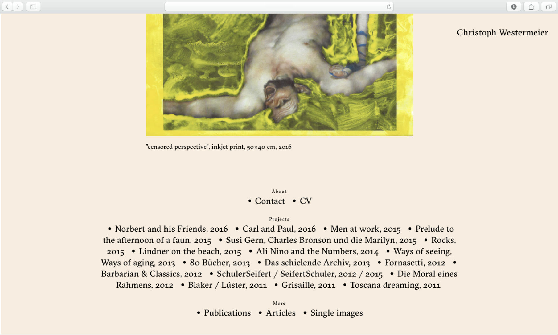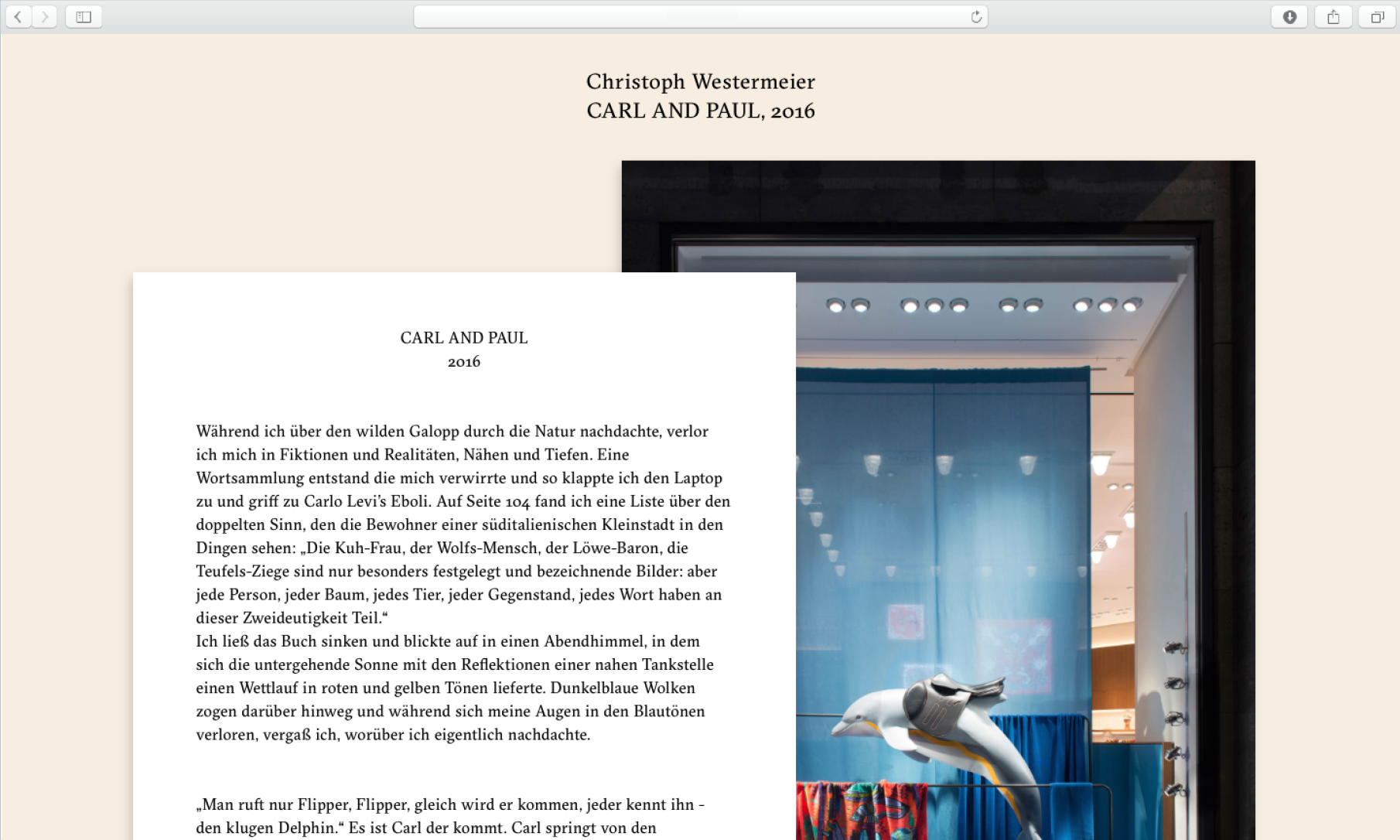 Christoph Westermeier Contributed by mainly afternoon on Mar 9th, 2017. Artwork published in circa April 2016. License: All Rights Reserved. Christoph Westermeier is a Düsseldorf based visual artist. The website was designed to highlight longer texts accompanying each project. License: All Rights Reserved. License: All Rights Reserved. License: All Rights Reserved. Typefaces More about GT SectraGet GT Sectra Formats Web (5675) Topics Art (4741) Designers/Agencies Mainly Afternoon (2) Tagged withphotography (983)contemporary art (513)personal websites (264)portfolios (778) Artwork location Germany (3903) Düsseldorf (95) 1 Comment on “Christoph Westermeier” Mina says: Mar 9th, 2017 7:34 pm Nice layout! Post a comment Name Email – will not be published Website Your response Submit Comment More GT Sectra in use Languages of the World – World of Languages2019Julia BaldaufContributed by Julia Baldauf Surf & Stayc. 2018MAFFElke TreunenContributed by Grilli Type The University of Texas at Austinc. 2015Dyal and PartnersContributed by Grilli Type Staff Pick Sponsor More in Art Museu do Tesouro Real2022Francisco ProvidênciaContributed by DSType Super Galerie2018Maison VolcanNina DelevaqueContributed by Nina Delevaque Raqib Shaw: Palazzo della Memoria2022Studio ArdContributed by Lineto Staff Pick Opera Out Of The Box2019undercastContributed by undercast More in Web marcoferri studio2024marcoferri studioContributed by Marta Marco Gourdin & Müller website2013Gourdin & MüllerContributed by Webtype Neography2010Alex GirónContributed by Stephen Coles Blog Motorverse2024Pangaea CreativeContributed by Teguh Arief More Fonts In Use Andreu Carulla in Chistén exhibitionc. 2024Run DesignContributed by Xavier Roca Connétable Staff Pick Planet of the Apes German movie poster1975unknownContributed by Florian Hardwig Staff Pick Fray Issue 3: Sex & Death2012James GoodeContributed by Jeff Porter Staff Pick “Penney’s Rainbow Lane” poster1967Peter MaxContributed by Florian Hardwig Staff Pick