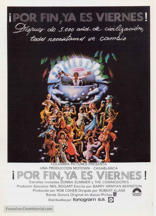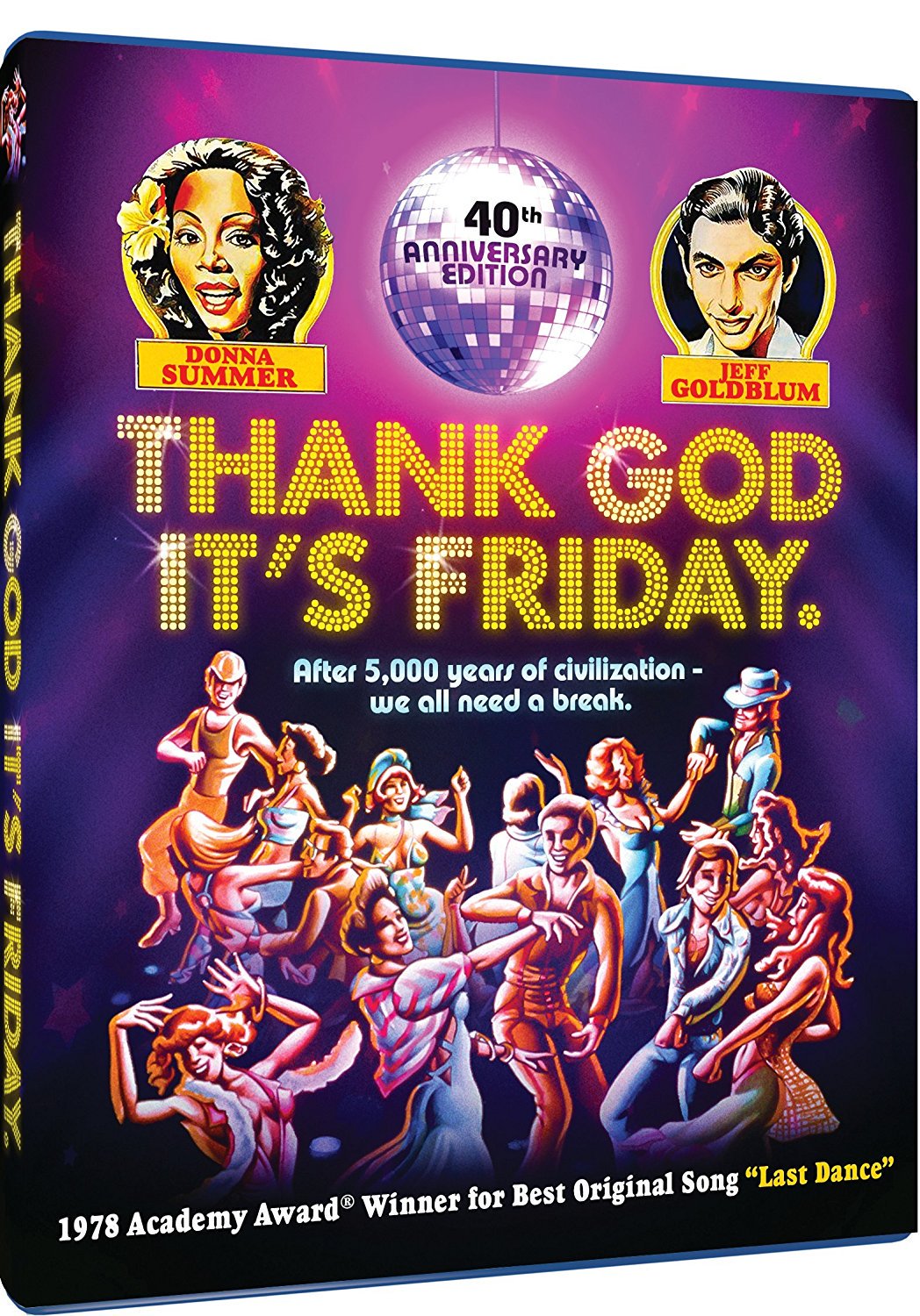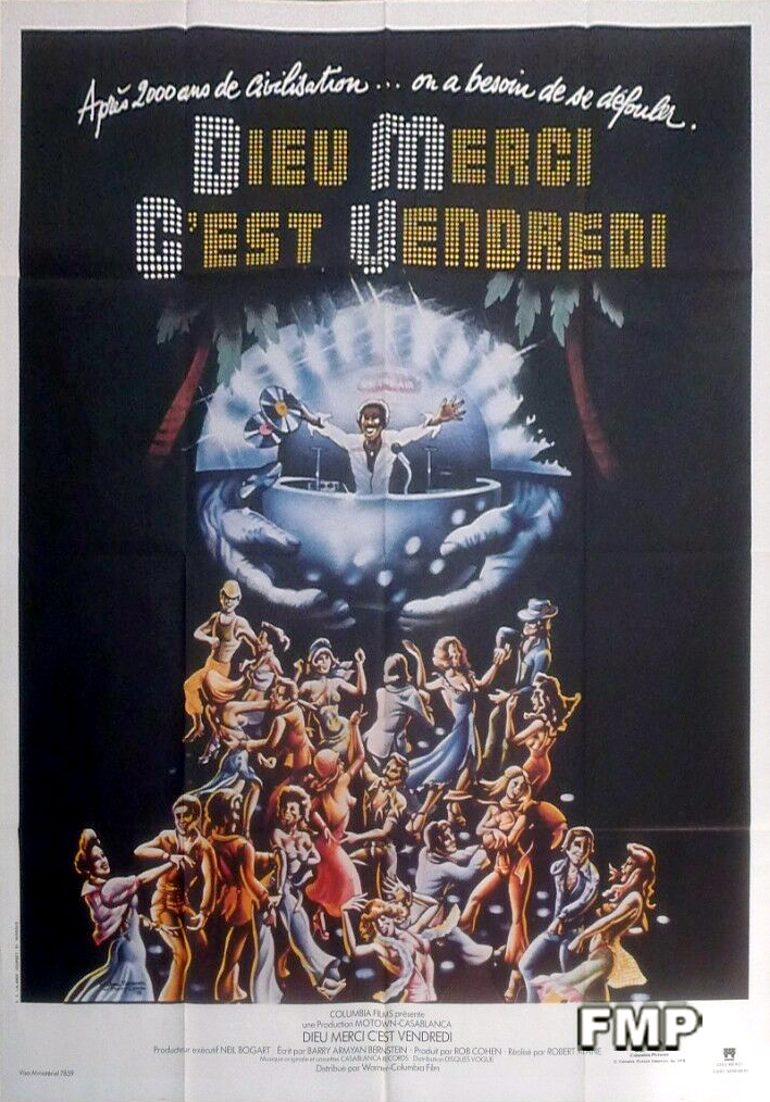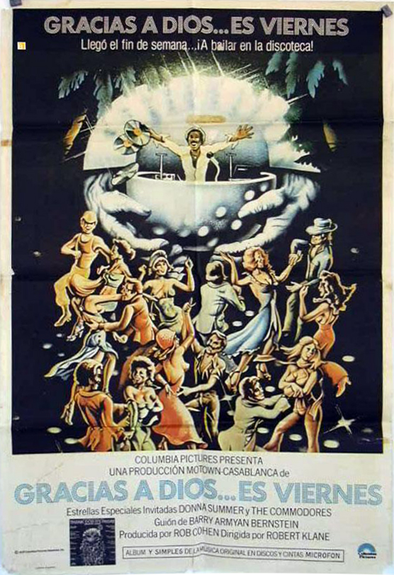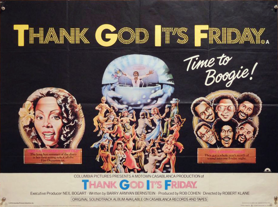 Thank God It’s Friday is a 1978 American musical disco comedy film directed by Robert Klane and produced by Motown Productions and Casablanca FilmWorks for Columbia Pictures (whose torch-holding mascot, in a specially produced animation, dances to disco music before the opening credits). Produced at the height of the disco craze, the film features The Commodores performing “Too Hot ta Trot”, and Donna Summer performing “Last Dance”, which won the Academy Award for Best Original Song in 1978. The film features an early performance by Jeff Goldblum and the first major screen appearance by Debra Winger. — Wikipedia