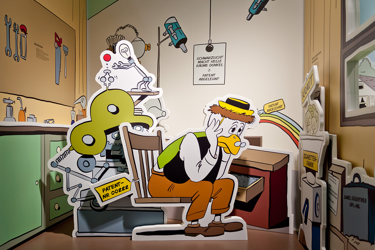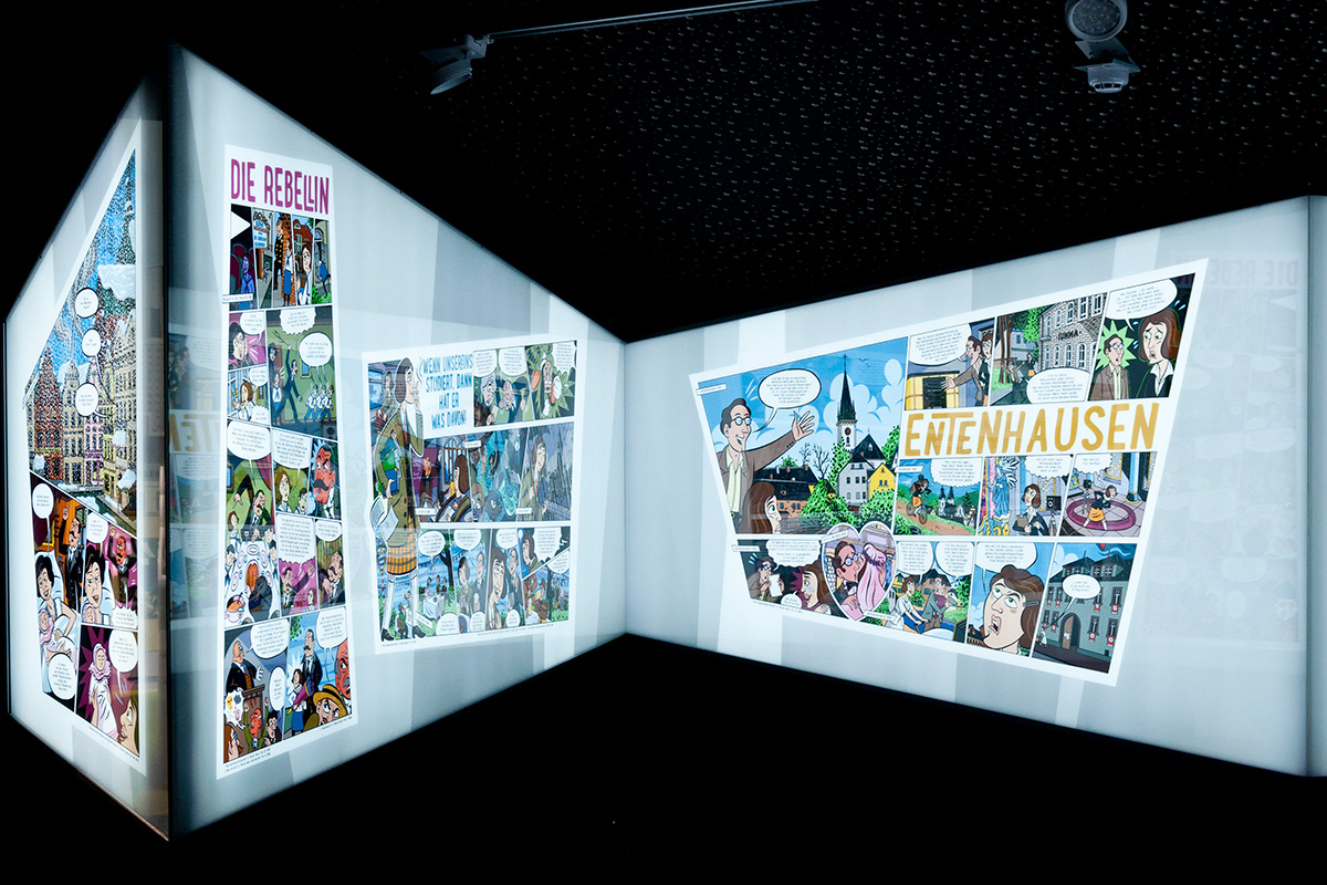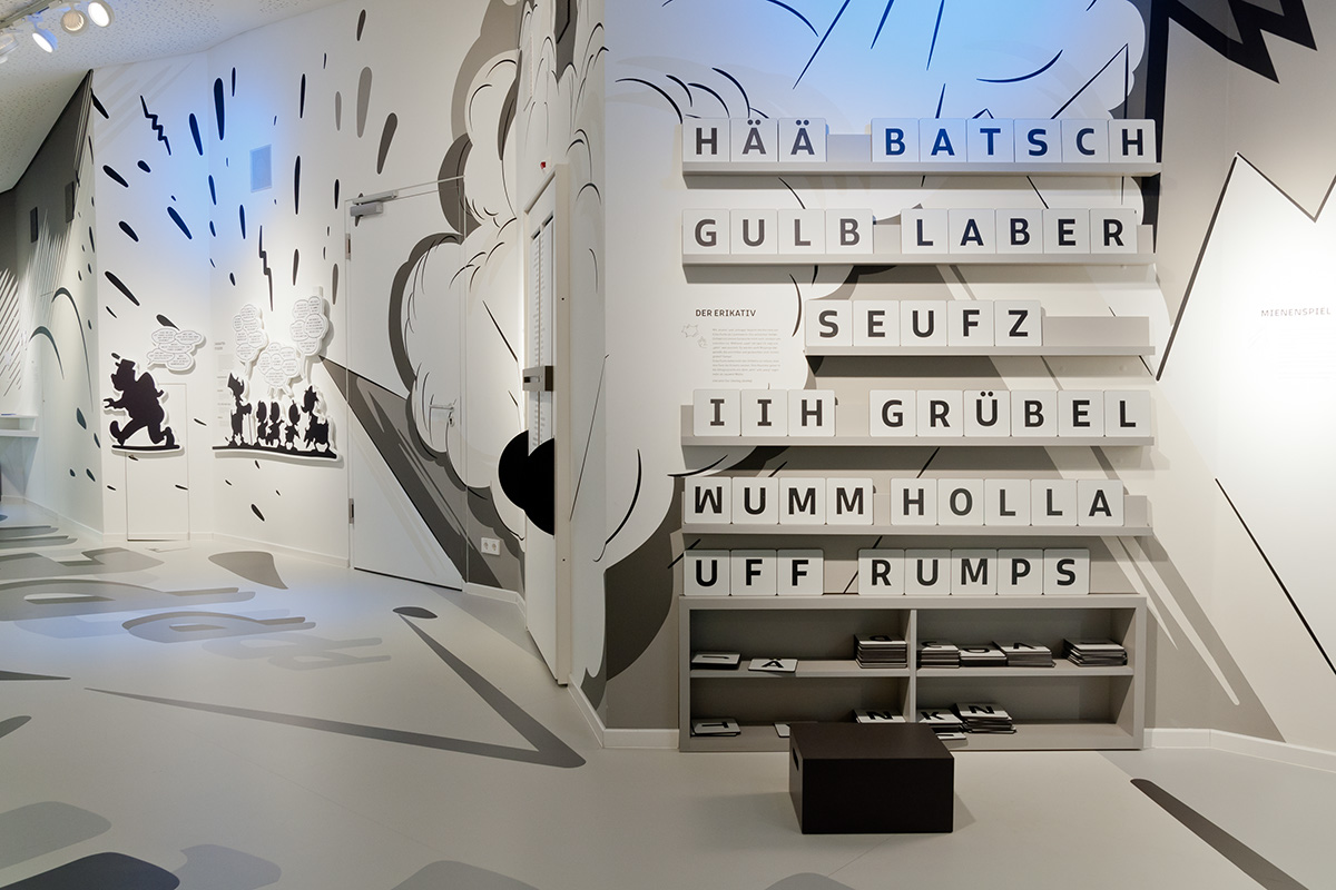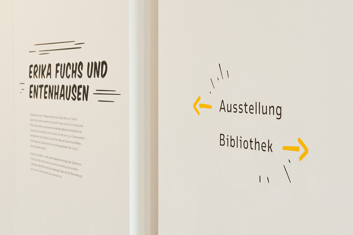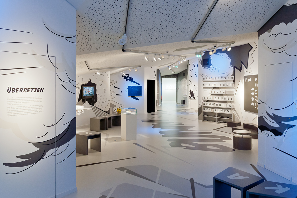 The Erika-Fuchs-Haus | Museum für Comic und Sprachkunst is the first museum ever to focus on the achievements of a translator, namely Erika Fuchs (1906–2005), who is best known for ingeniously bringing the adventures of Mickey Mouse and Donald Duck to the German language. The museum transforms the two-dimensional medium of comics into a three-dimensional exhibition and thus allows to experience them in a new way. In addition to media expositions about the life and work of the translator and the history of comics, there are numerous interactive objects which help to comprehend Erika Fuchs’s accomplishments through playful experiments with language. With blown-up details from the comics, room-filling lettering and symbols, as well as a specially developed wayfinding system, the exhibition graphics and architecture guide the visitors into a unique cosmos of comic culture.
