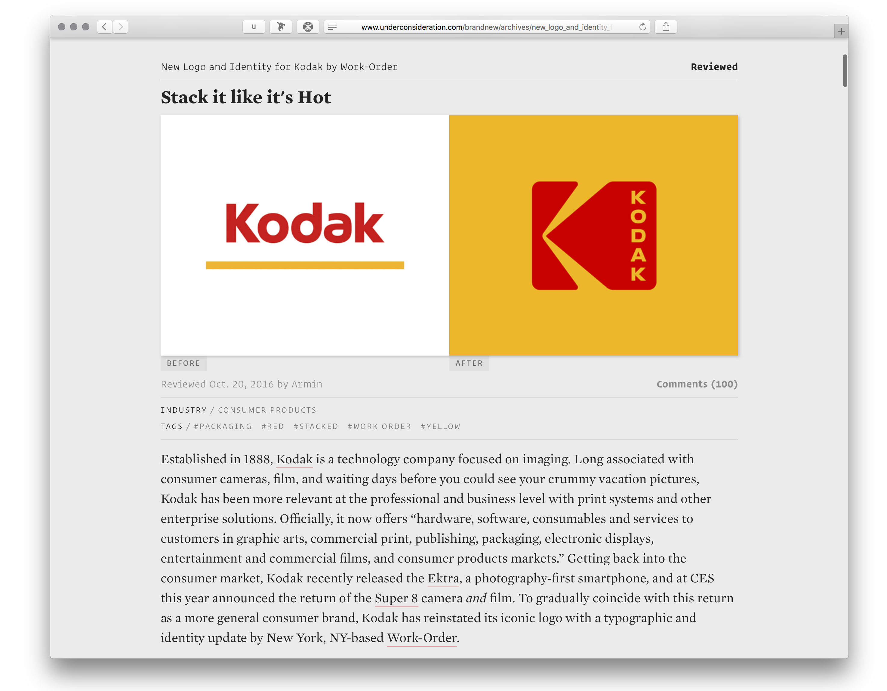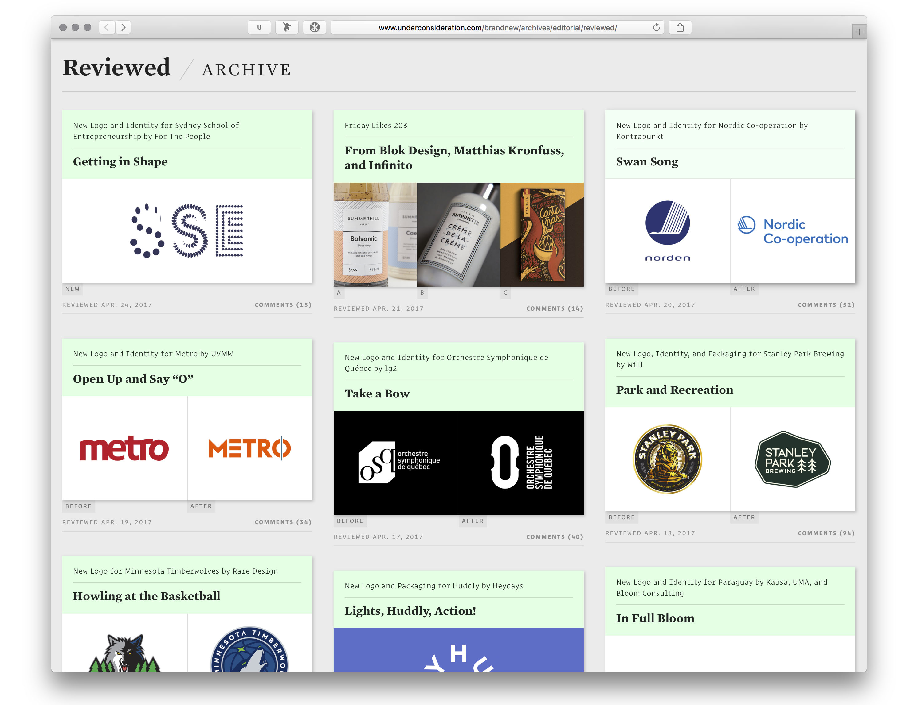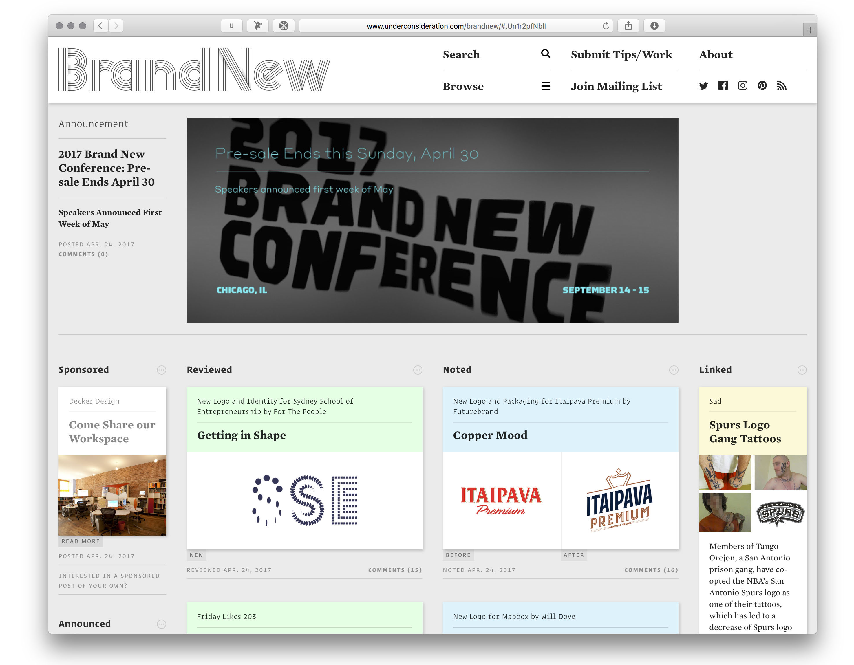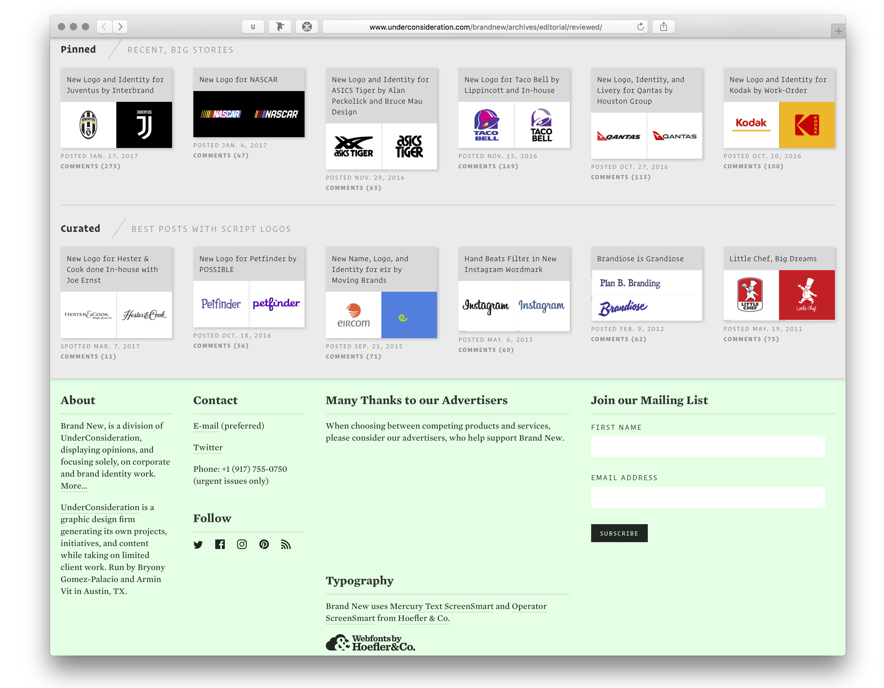 Brand New is the place on the web for writing and critique on branding and identity design, published and maintained by UnderConsideration LCC. In February 2017, they launched a new version of their website, meta-reviewed here. Highlights from the post include: