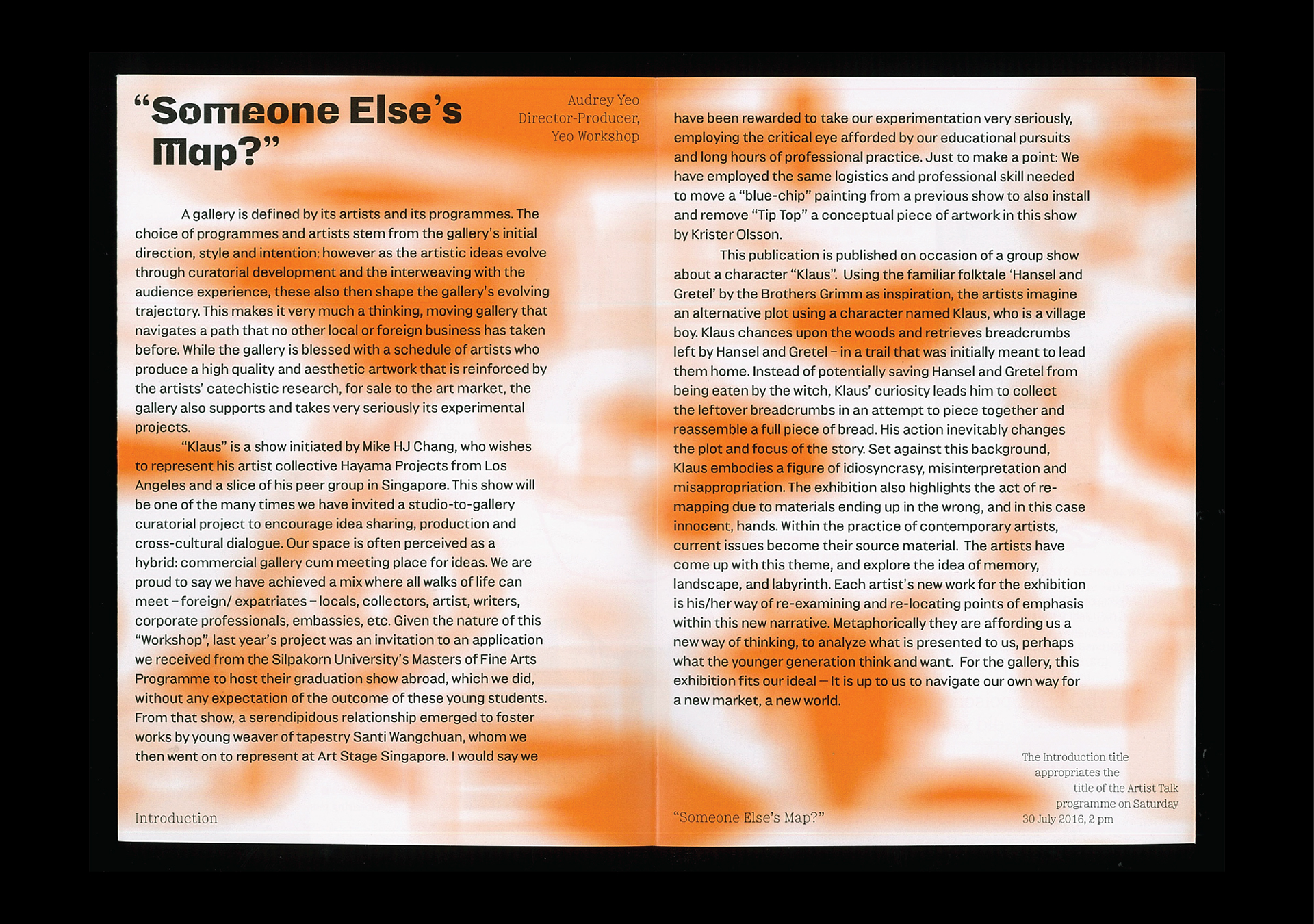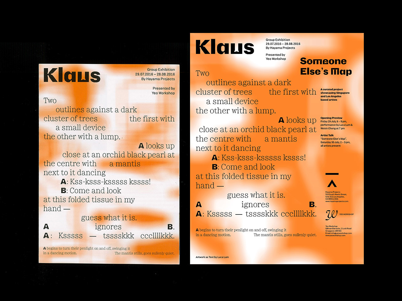 Klaus exhibition, Yeo Workshop Contributed by Production Type on Jun 15th, 2017. Artwork published in July 2016. Source: www.behance.net License: All Rights Reserved. Graphic designer Melvin Tan, helped by Gideon Kong Wen Da, made up the poster and a nice little catalog for the Klaus exhibition by Hayama Projects at Yeo Workshop, Singapore. They are designed with the whole Minotaur family: Minotaur, Minotaur Sans & Minotaur Beef. Source: www.behance.net License: All Rights Reserved. Source: www.behance.net License: All Rights Reserved. Source: www.behance.net License: All Rights Reserved. Source: www.behance.net License: All Rights Reserved. Source: www.behance.net License: All Rights Reserved. Titles are a mix of Minotaur Sans Bold & Minotaur Beef. This is made possible cause typefaces share same proportions. Source: www.behance.net License: All Rights Reserved. Source: www.behance.net License: All Rights Reserved. Source: www.behance.net License: All Rights Reserved. Source: www.behance.net License: All Rights Reserved. Source: www.behance.net License: All Rights Reserved. Typefaces are also used inside the exhibition. Source: www.behance.net License: All Rights Reserved. Typefaces More about Minotaur SansGet Minotaur SansMore about Minotaur BeefGet Minotaur BeefMore about MinotaurGet Minotaur Formats Booklets/Pamphlets (2398) Exhibition/Installation (1182) Topics Event (3208) Art (4684) Designers/Agencies Melvin Tan (2) Gideon Kong Wen Da (1) Currency (2) Tagged withexhibition catalogs (861)art exhibitions (864)type series: sans+serif (378)ink traps (77)orange (448)type series (624)Yeo Workshop (1)Hayama Projects (1) Artwork location Singapore (53) In SetsTrendlisty (Roque Strew) (33)2+ typefaces by 1 designer (Florian Hardwig) (1115)cool (Karo Konieczna) (871)Ideologically superior graphic design (Thiago) (170)Production Type (Production Type) (492)展览 (yang fang) (8) Post a comment Name Email – will not be published Website Your response Submit Comment More Minotaur Sans in use Sphères magazine n.15, “Le train”2024Élyse DelahaieContributed by Lucas Descroix Robin Tutenges – On Asphalt We Grow2024Théo MillerContributed by Théo Miller Staff Pick Trax magazine2015LargeProduction Type teamContributed by Production Type Staff Pick Sponsor More in Event Stefanie Egedy concert poster2022Savio BanholzerContributed by Savio Banholzer Festival Summer Plovdiv 20232023PunktContributed by TypeType Parola workshop flyer2021Dum Dum StudioContributed by Mario Julian Gutierrez Munduko Arrozak #192022Vedia Design StudioClara Briones VediaAntton UgarteContributed by Antton Ugarte More in Booklets/Pamphlets Power Aargauc. 2022Studio WayContributed by F37® Umweltagentchen Bachelor’s thesis2021Jana HeinzContributed by Ivo Gabrowitsch Naylor Love identity2018Eddy DaviesChris FlackLiam OoiContributed by eddy davies Cinergy Film Festival2021Rees MorganContributed by Rees Morgan More Fonts In Use wPunkt, Września2020Jakub IzydorczakContributed by Darden Studio Staff Pick Microtopies – Chantiers ouverts au public2025Julien LelièvreContributed by SM Foundry Staff Pick 2666 by Roberto Bolaño (Farrar, Straus and Giroux / Picador)c. 2008Charlotte StrickContributed by Mike Blystone Staff Pick JUP Newspaper2012Atelier d’alvesContributed by Sergio Alves Staff Pick