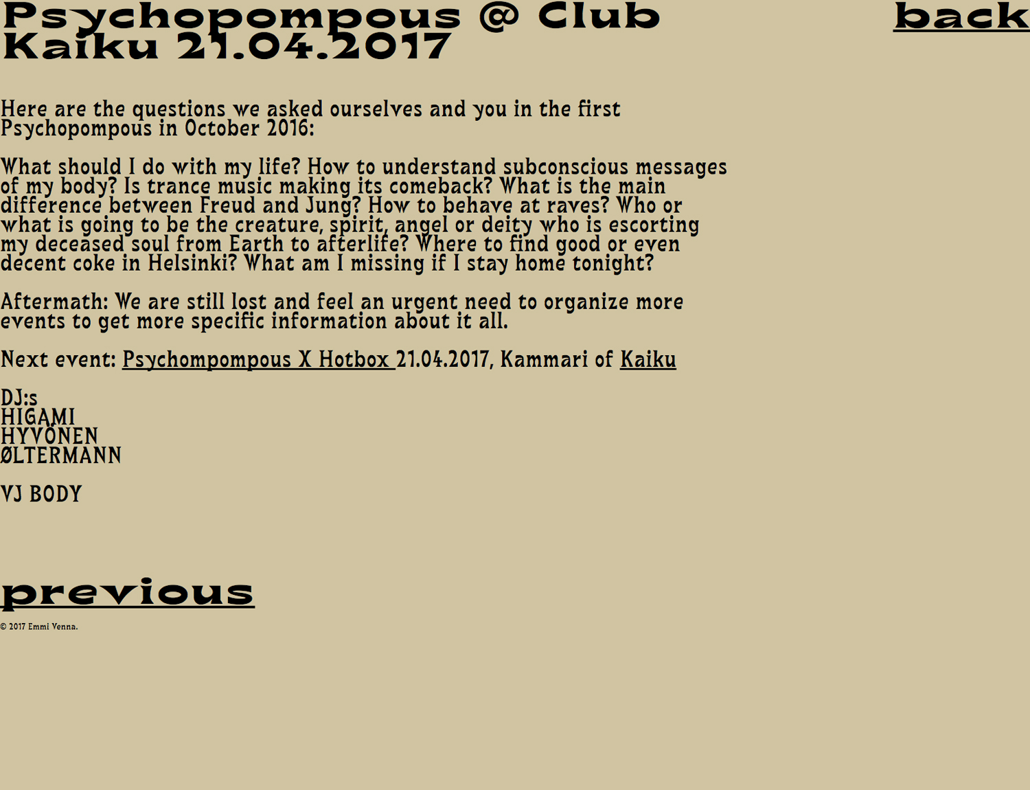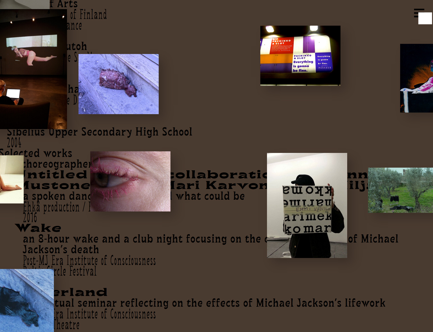 Emmi Venna website Contributed by Benoît Bodhuin on May 30th, 2017. Artwork published in 2017. Source: kiia.fi License: All Rights Reserved. A very punk website for Emmi Venna designed by Kiia Beilinson with bb-book A typeface and coded by Eevi Rutanen License: All Rights Reserved. Source: kiia.fi License: All Rights Reserved. Source: kiia.fi License: All Rights Reserved. Typefaces More about bb-book AGet bb-book A Formats Web (5557) Topics Performing Arts (982) Tagged withchoreography (13)dance (214)performance art (89)personal websites (261)multiple widths (554)layers (102)overlap (337)one typeface family (1662)reversed type (3333)shadow effects (1197) Artwork location Finland (177) Helsinki (127) Post a comment Name Email – will not be published Website Your response Submit Comment More bb-book A in use Hello Mister2018Michal LobaContributed by Benoît Bodhuin This is the Same Ocean issue 62017Marijn DegenaarContributed by Benoît Bodhuin Big BBQ by Bite Club2017Marijn DegenaarContributed by Florian Hardwig Staff Pick Sponsor More in Performing Arts Teuda Bara by João Santos2016Filipe LampejoJoão EmediatoContributed by Filipe Lampejo The Improv comedy club logoc. 1980unknownContributed by Alex Stick Tattoox2024THRU MotionVagrant StudioMorboContributed by Vagrant Studio Nous ne disparaîtrons pas poster2019Atelier ValenthierContributed by Swiss Typefaces More in Web Rodchenko Art School: Photo in Media2018Nicolai IvanovContributed by Nicolai Ivanov Maison Saint-Gervais 2024/25 identityc. 2024Dual RoomEmmanuel CrivelliContributed by Yevgeniy Anfalov Staff Pick London College of Style websitec. 2020unknownContributed by Jan Tonellato Made by Codica website2023CodicaContributed by Kostas Bartsokas More Fonts In Use A Word in Your Eye1996Ken Garland & AssociatesContributed by Stephen Coles Staff Pick Wolfra Alpenschorle packaging2020Zeichen & WunderContributed by TypeMates Staff Pick “Two Case Prepositions Song” music video2020Gast StudioContributed by Benoît Bodhuin Staff Pick Venus Motorrollerc. 1955Contributed by Florian Hardwig Staff Pick