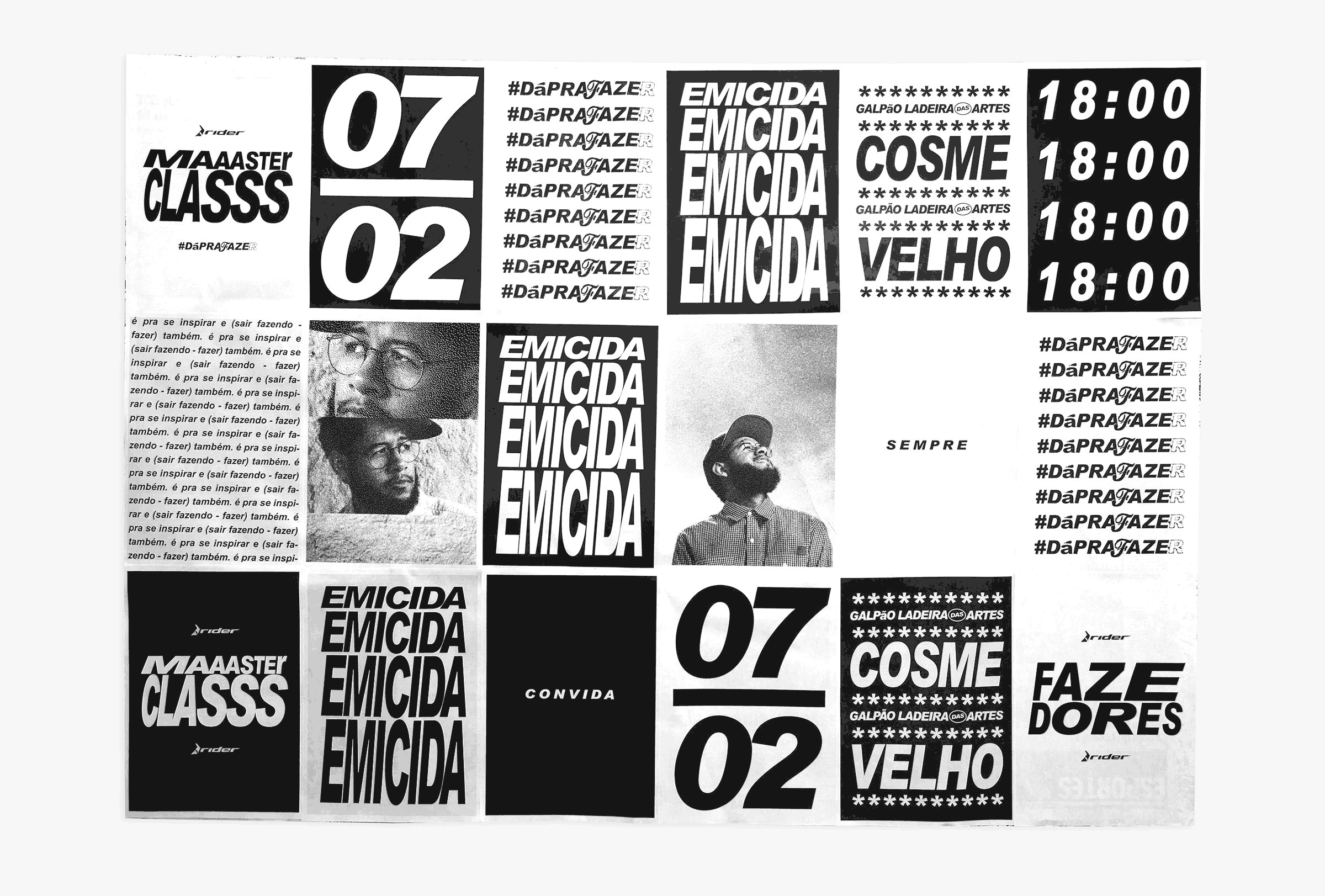 The Arial typeface occupied Rider’s festival. The visual system was mainly typographic and based on our research made in the streets. We had an essential grid to highlight visual hierarchy and composition. Posters, facebook posts, banners and wheat-posters are unfoldments of this grid.