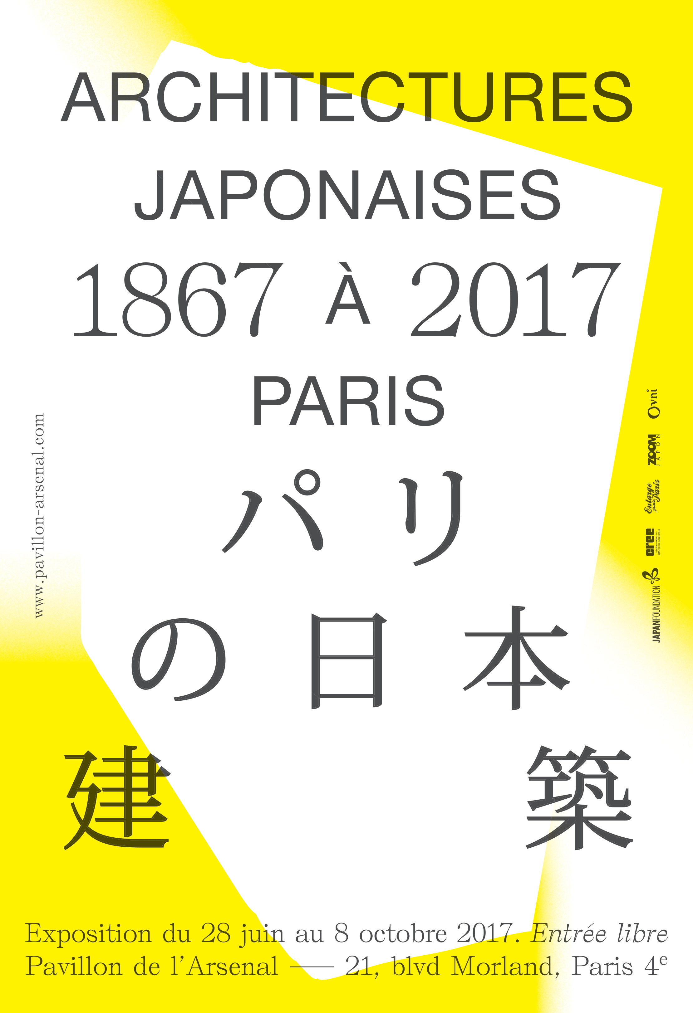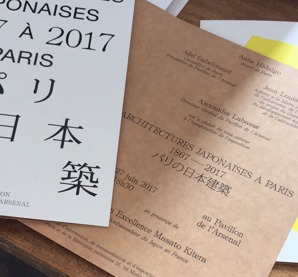 The posters and invitation cards created by Pierre Vanni for the exhibition “Architectures Japonaises à Paris” at the Pavillon de l’Arsenal make use of Bretagne’s Self Modern, designed by French type designer Lucas Le Bihan. Its Japanese typeface counterpart is found in Adobe’s Kozuka Mincho.