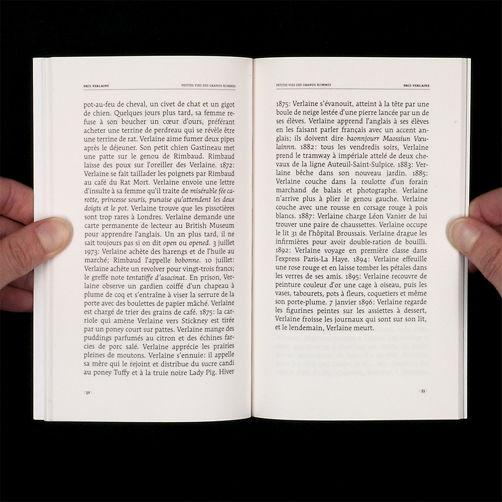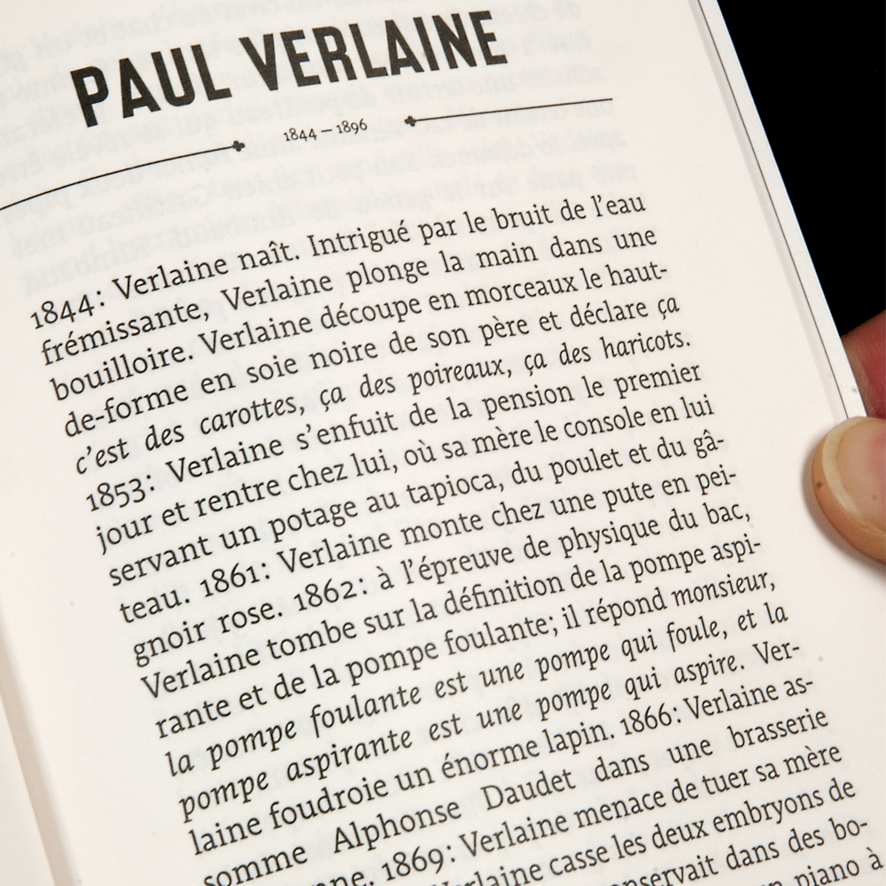 Malraux eating cauliflower stalks in 1937 in Barcelona, Hemingway treated as a “capitalist bourgeoisist pig” by a Polish mechanic he provoked in a duel, Liszt smoking the cigar in his Vatican apartment … Small, the lives of these great men told number after number in a column in Le Tigre. The little things of life remain, the absurd, the stripped-down man. All this tightened, compressed – because small, these lives are also compressed by the format and the rhythm at the course. Lætitia Bianchi cuts, amputated, waist of joy in the existences pleases to the excess, keeps what no biographer or dictionary would have kept. The scrolling life is expressed with the tasty details it remains, interrupted only in the last line by the death that survives always, only certainty.