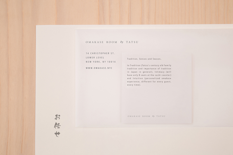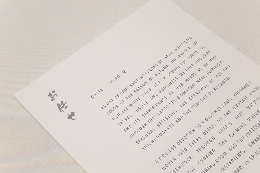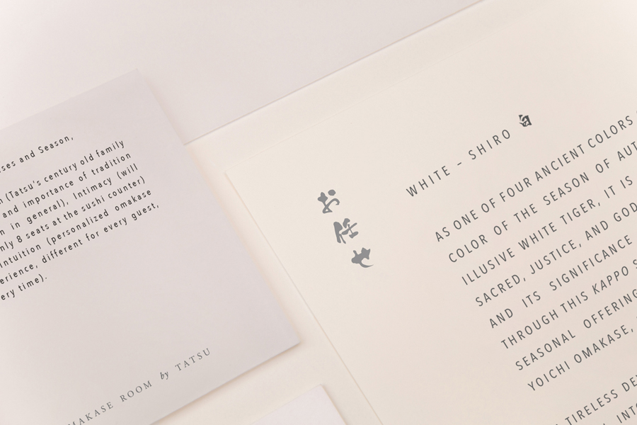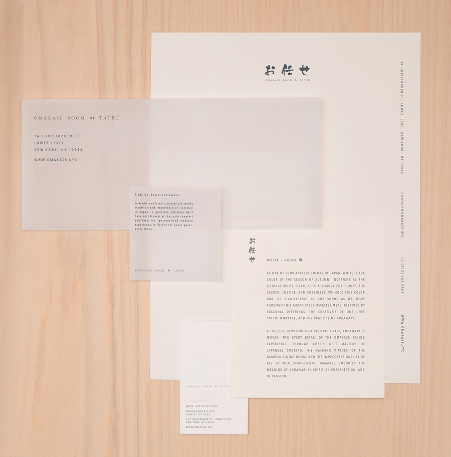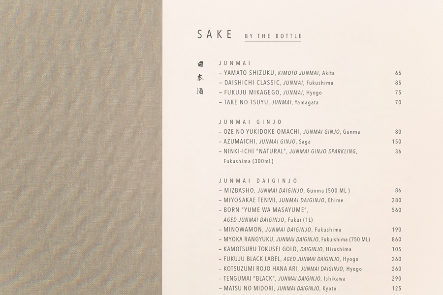 Much like the restaurant’s high quality materiality but stylistic restraint, Savvy’s choice of few fonts, pairing the free brush strokes of font Kouzan Gyousho with the generous spacing of Avenir Next Condensed, finds a balance between individual aesthetic character and conceptual subtlety, channeling something of New York’s architectural signage, and the personable calligraphic craft of the East. These are nuanced but discernible ideas and details that layer but remain in line with experience.