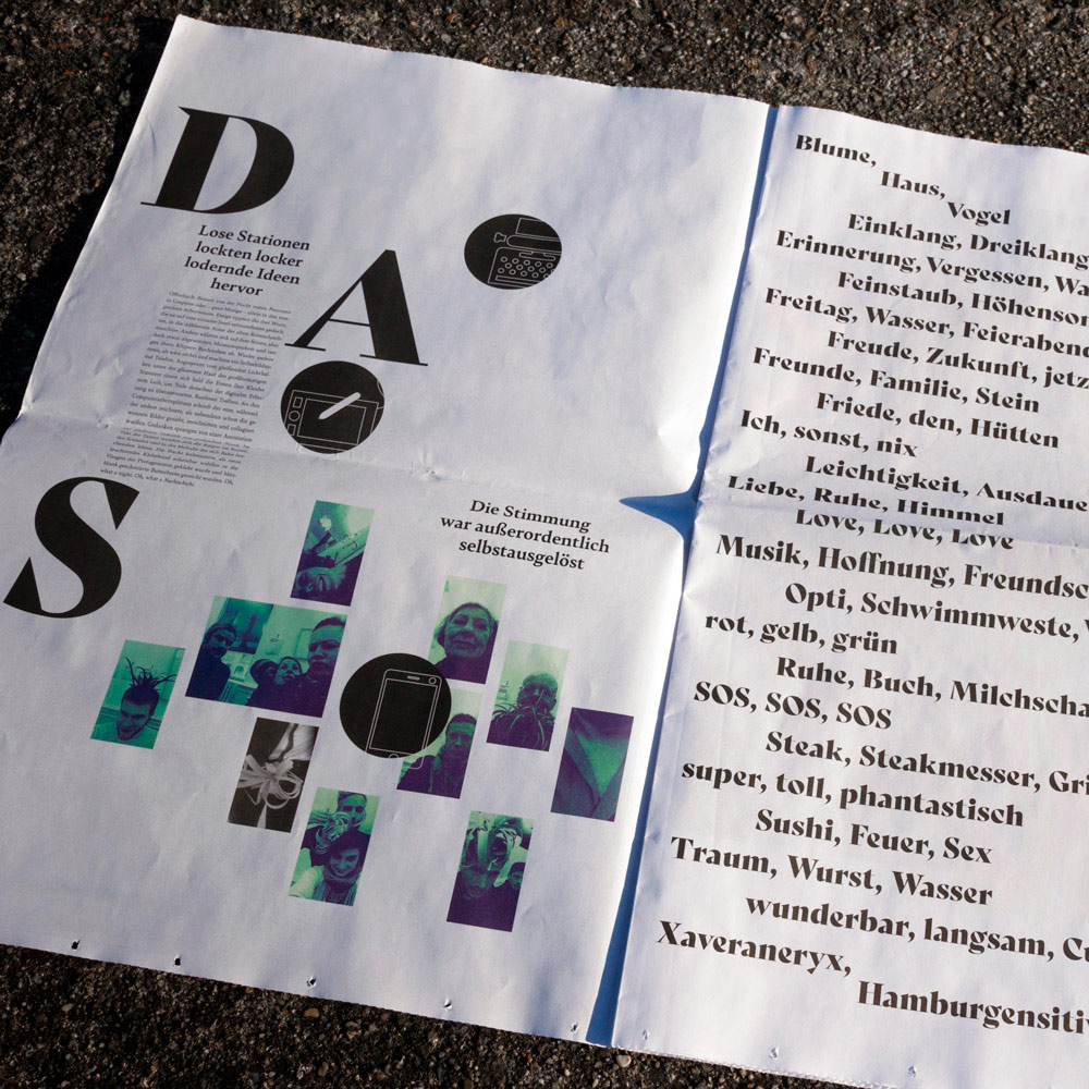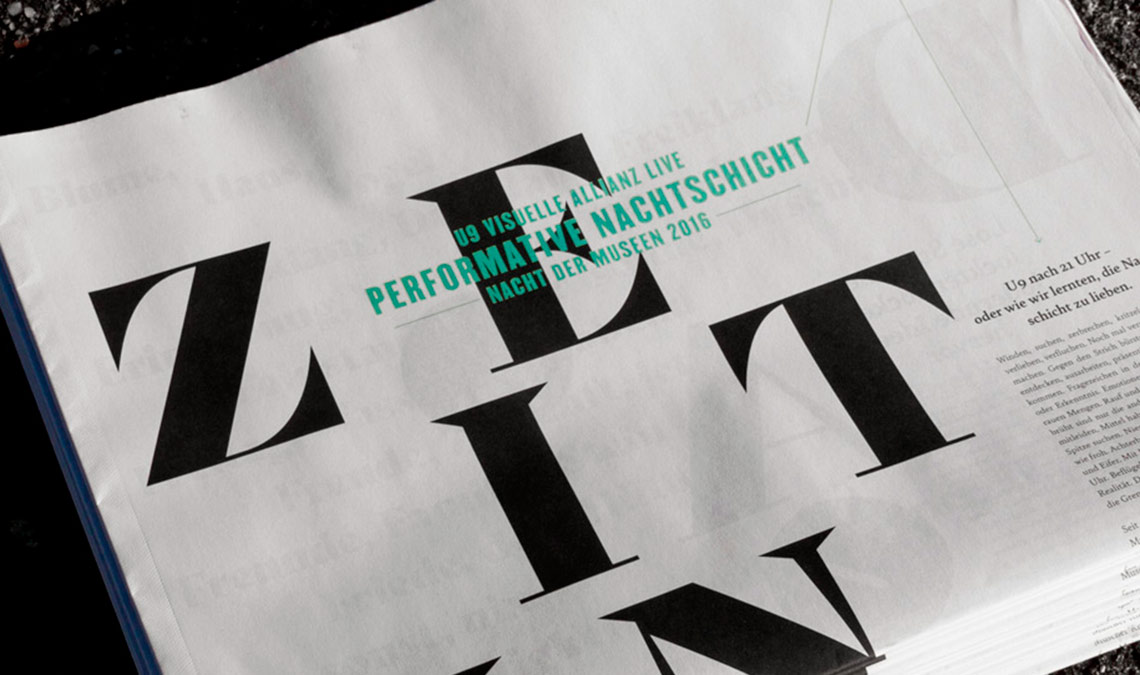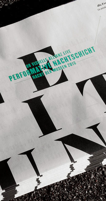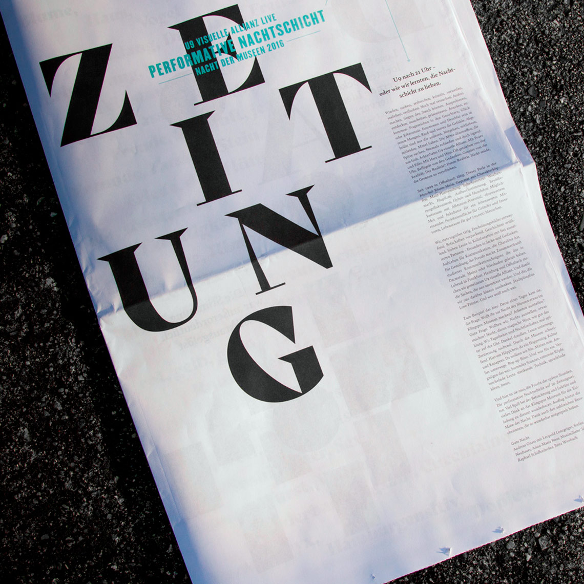 Die Frucht (The Fruit) is a newspaper that was created at the Klingspor Museum for Book Art, Typography and Calligraphy in Offenbach, Germany during the annual “Night of the Museums” event as result of a performative night shift by the designers of U9 visuelle Allianz. It was designed with scanner, typewriter and webcam, using bodies, guests, smartphones and cacti. The typeface in use is Roxane Gataud’s typeface Bely.