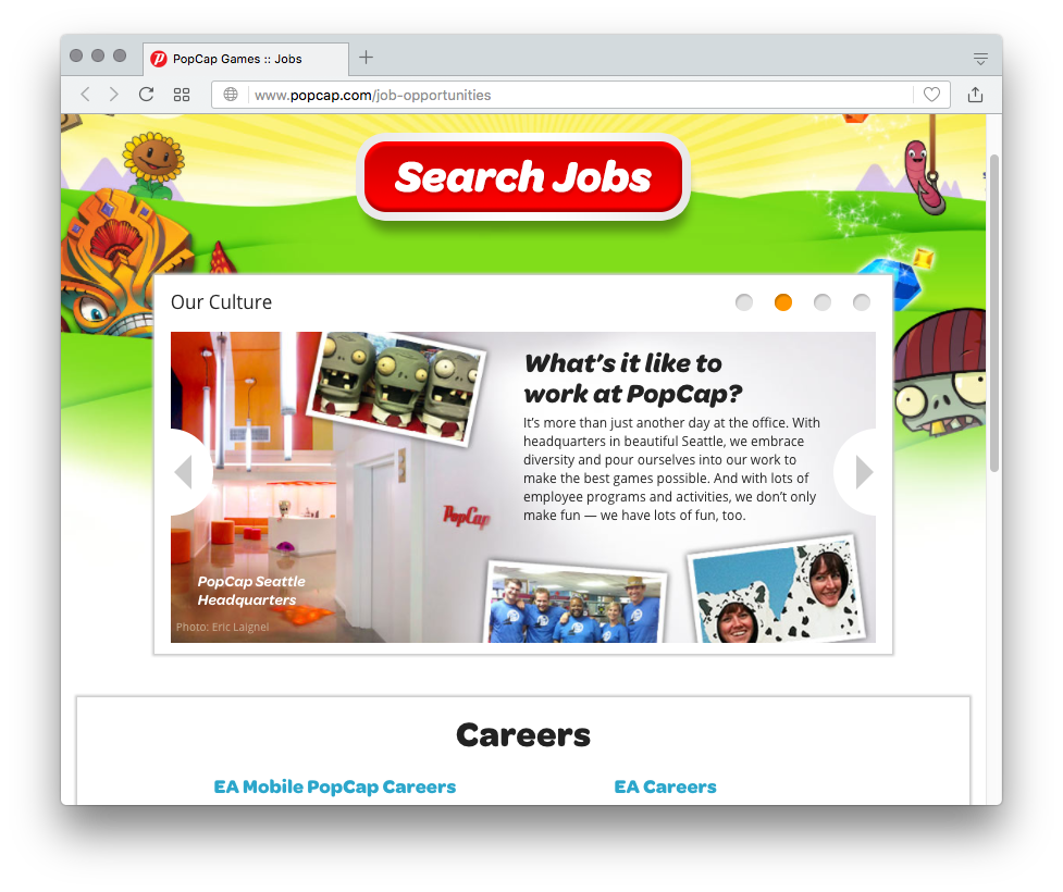 PopCap Games, Inc. is a video game developer and publisher based in Seattle. A subsidiary of Electronic Arts, it is best known for their puzzle games, including the Bejeweled series of tile-matching games, the pachinko-like Peggle and the tower defense game Plants vs. Zombies. [Wikipedia]