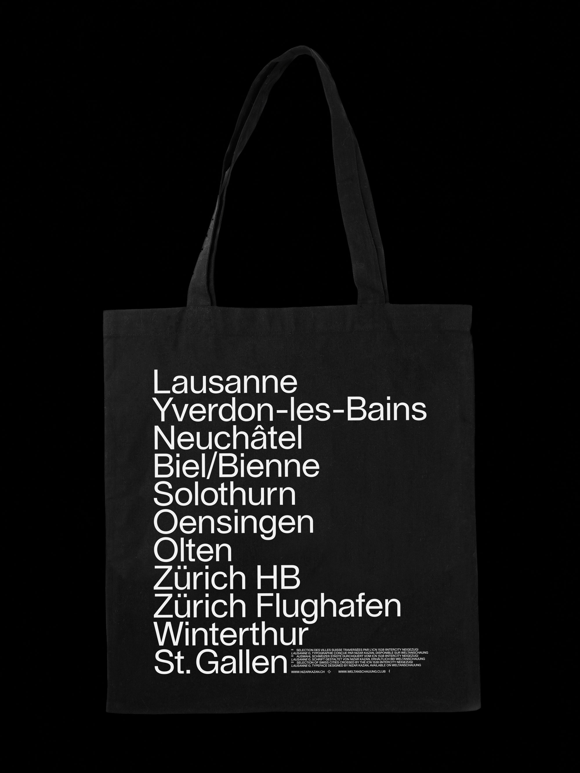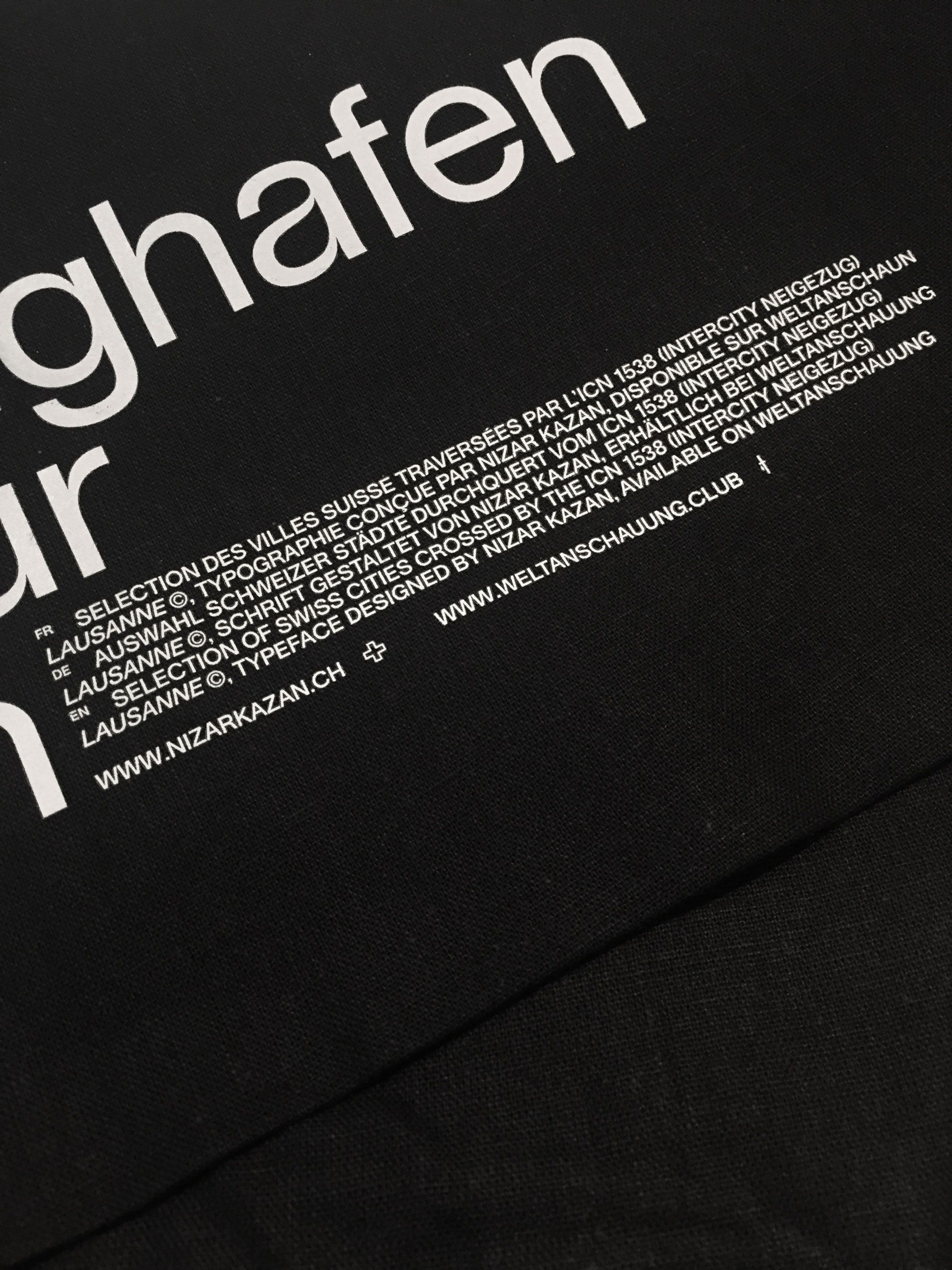 “ICN 1538” tote bag Contributed by WELTKERN® Typefaces on Sep 12th, 2017. Artwork published in September 2017. Photo: WELTKERN® Typefaces. License: All Rights Reserved. FR — Selection des villes Suisse traversées par l’ICN 1538 (InterCity pendulaire) DE — Auswahl Schweizer Städte durchquert vom ICN 1538 (InterCity Neigezug) EN — Selection of Swiss cities crossed by the ICN 1538 (Intercity Tilting Train) The tote bag set in the Lausanne typeface is available here. Photo: WELTKERN® Typefaces. Nizar Kazan/WELTANSCHAUUNG. License: All Rights Reserved. Photo: WELTKERN® Typefaces. License: All Rights Reserved. Photo: WELTKERN® Typefaces. License: All Rights Reserved. Photo: WELTKERN® Typefaces. License: All Rights Reserved. Typefaces More about TWK LausanneGet TWK Lausanne Formats Object/Product (1117) Topics Graphic Design (2952) Travel (785) Lifestyle (1415) Designers/Agencies Nizar Kazan + Co (16) Tagged withtote bags (537)limited editions (423)black and white (1979)reversed type (3296)one typeface (1741)cities/towns (33)railway / railroad (72)Switzerland (76)type promotion (108)uses by the typeface’s designer (1239)multilingual (2548)French (language) (2470)German (language) (2444)English (language) (2364) Artwork location Switzerland (1098) Lausanne (149) In Sets2022_UNTITLED (selina sisik) (26)bb (Leonardo de la Fuente) (1305) Post a comment Name Email – will not be published Website Your response Submit Comment More TWK Lausanne in use Do Not Feed Alligators2023David ShamaContributed by WELTKERN® Typefaces Dekor Mixtape (MAR-013)2019Lucas HesseContributed by WELTKERN® Typefaces Slé2022unknownContributed by WELTKERN® Typefaces Sponsor More in Travel Logan Village to Yarrabilba Rail Trailc. 2022DotdashDespina MacrisDomenic NastasiContributed by Despina Macris Staff Pick Dave Criddle Travel LtdContributed by james millner Qatar Airways (2015–)c. 2015Qatar Airways180 KingsdayContributed by Rajasree Bhadra Guidebook for people with autism – Museum in Wilanów2014Studio 2×2Wojciech StaniewskiMaciej BączkowskiContributed by Wojciech Staniewski More in Object/Product “Go Psycho with Elvira!” campaign1989unknownContributed by fangly Anarchist “Punk As Fuck” e-cigarette productsAnarchist ManufacturingContributed by Stephen Coles Brhadia fashion brand2018Miguel AnønimoContributed by miguel anønimo Bau Mich Auf 20212021Yosh SchreinerTim LindacherLive From EarthContributed by Dinamo Typefaces Staff Pick More Fonts In Use Lovely & Company Website2013Meg LewisGhostly FernsAeolidiaContributed by Stephen Coles Staff Pick Seven Steps to Better Listening1964unknownContributed by Indra Kupferschmid Staff Pick Out of Control: The Concrete Art of Skateboarding, Audain Art Museum2022Judith SteedmanSteedman DesignContributed by Sandrine Nugue Staff Pick Group Le Monde headquarters wayfinding2020SnøhettaContributed by 205TF Staff Pick