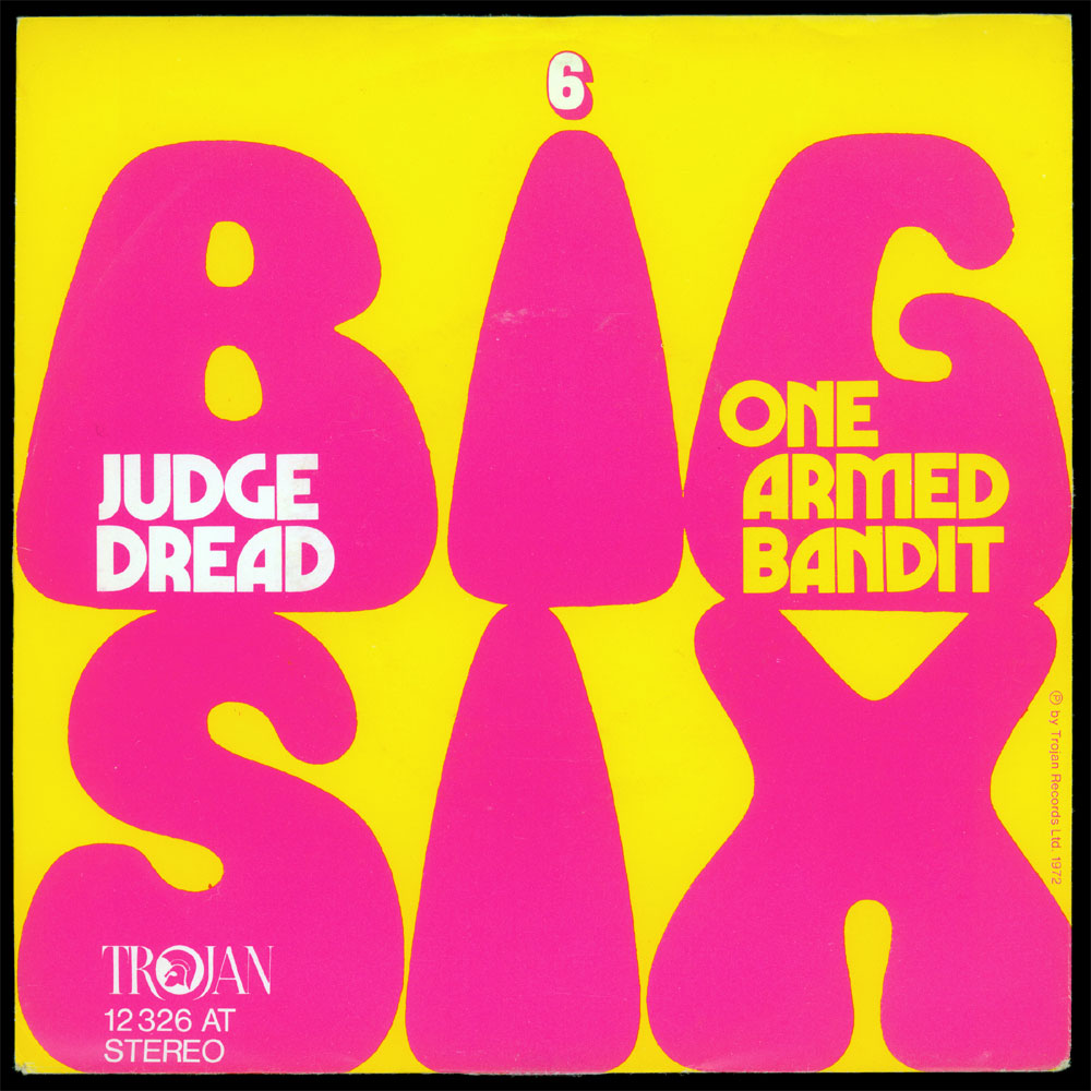 “Big Six” sold 300,000 copies and spent 27 weeks in the British charts, despite the radio ban and the refusal of several distributors to carry the record. The cover of the German single release (distributed by Ariola) reflects the title: It is dominated by six (very) big letters. They stem from Lettergraphic’s Mania which, together with PLINC’s similar Obese, was a staple in late 1960s/early 1970s psychedelic typography. Fun fact: Judge Dread’s subsequent debut album was named Dreadmania. The song titles within the big pink bottom-heavy letters are set in Marvin. In a typographic equivalent to the lewd lyrics, Mania’s phallic ‘I’ is cheekily dotted with a ‘6’ from Sans Serif Shaded.