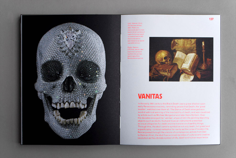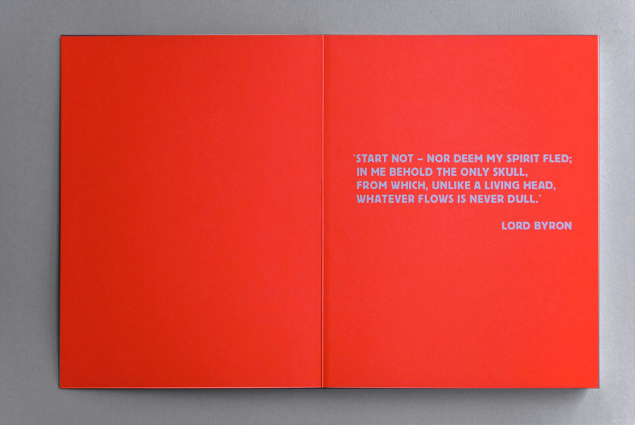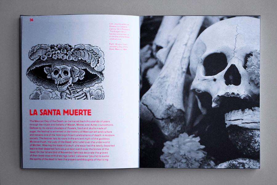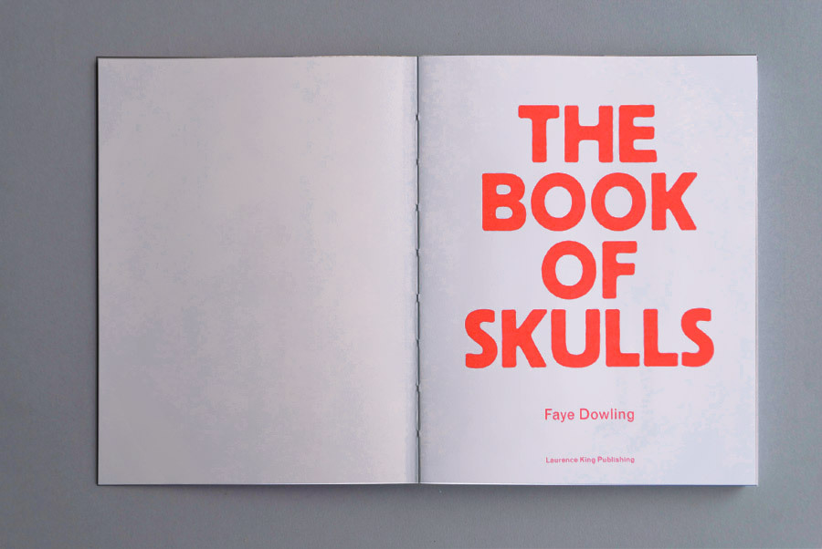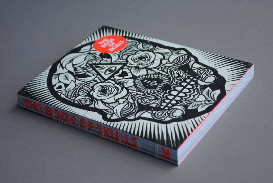 “The black and white cover and the open spine give the tone to this dedication to the skull in all its forms. Inside, the sobriety gives way to bright fluorescent red, the only colour besides the images. Darkness and light combine to create a full-on visual exploration of the human skull in pop culture.”