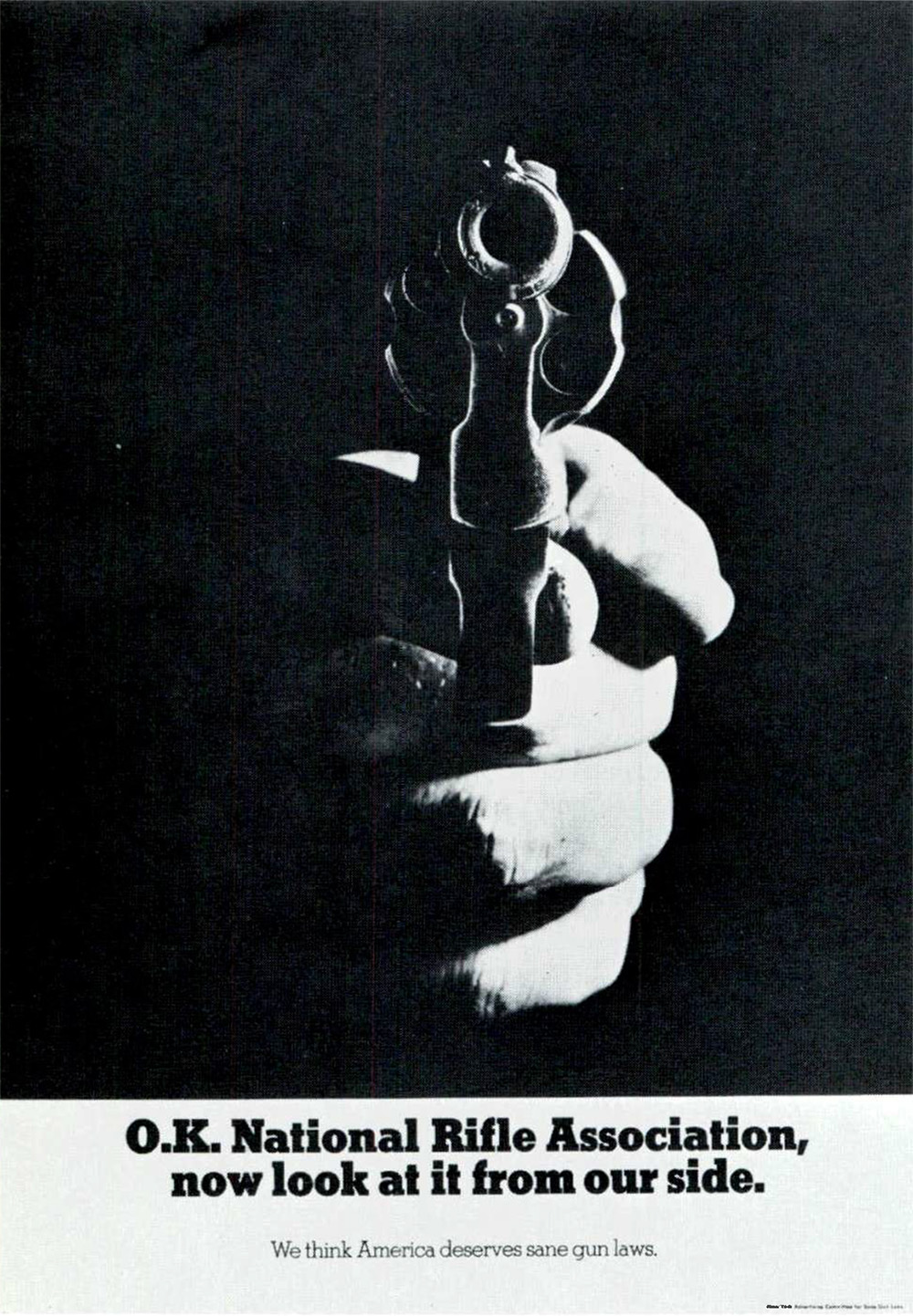 In response, the advertising agency Papert Koenig Lois created this ad under the banner of the “New York Advertising Committee For Sane Gun Laws”. The 48th Annual Of Advertising Art lists the Art Director/Designer as Steve Bryan.