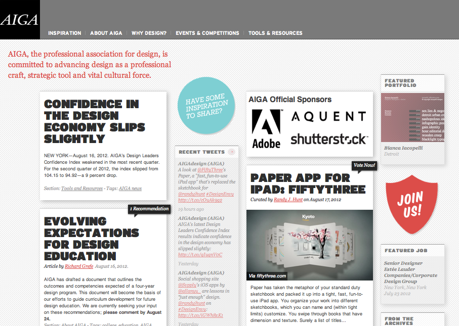 AIGA website (2011) Contributed by Webtype on Oct 13th, 2012. Artwork published in 2011. Source: www.aiga.org License: All Rights Reserved. AIGA, the professional association for design, is using Interstate, the Ultra Black weight in particular, as a webfont from Webtype. Source: www.aiga.org License: All Rights Reserved. Typefaces More about InterstateGet Interstate Formats Web (5790) Topics Institutional (1452) Graphic Design (3066) Education/Academia (2249) Designers/Agencies Method (1) Tagged withdesign (38)associations (77)extra bold (125)webfonts (449)Webtype (73)AIGA (26) Artwork location United States (10201) In SetsWebtype (Webtype) (241) Post a comment Name Email – will not be published Website Your response Submit Comment More Interstate in use 37signals Suite Logos201137signalsCarlos SeguraBasecampContributed by Stephen Coles Firestone TireContributed by Webtype Before I Go To Sleep UK poster2014Empire DesignContributed by Stephen Coles Sponsor More in Institutional Fulbright University Vietnam2019unknownContributed by Darden Studio Staff Pick ArtEZ Business Centre visual identity2022Dongbin HanBenjamin McMillanContributed by Dongbin Han Players. Magnum photographers come out to play2018David TorrentsSilvia MíguezTaller TorrentsContributed by Emtype Foundry Théâtre Joliette, Season 2023/20242023Super TerrainContributed by Oudin Romain More in Web Kleinschmidt2018One Design CompanyContributed by David Sieren Matilde Viegas portfolio website2023Frau im MondContributed by Frau im Mond Digdog2017Stanislas WiartContributed by stanislas wiart Curl Maven websitec. 2024unknownContributed by Pixesia Studio More Fonts In Use “Incalculable Loss” front page of The New York Times for May 24th, 20202020The New York TimesAndrew SondernTom BodkinContributed by Nick Sherman Blog Literatur Spiegelc. 2015Nils KüppersDer SpiegelContributed by Nils Küppers Staff Pick House of Cans & Villages Brewery2019David PearsonPhoto(s) by Label Craft on Flickr. Staff Pick Techno Cafe2014Fabienne FeltusBureau FContributed by Michael Hochleitner Staff Pick