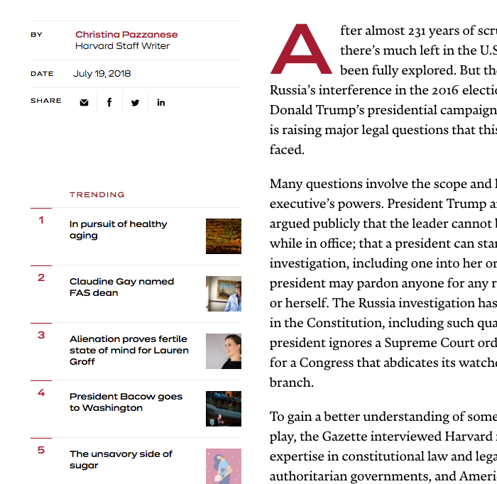 Our research and design explorations took inspiration from the Gazette archives to independent print magazine to modern data visualization applications. We think we landed on a logomark and visual language just right for modern-day Harvard — authoritative, accessible, and dynamic.