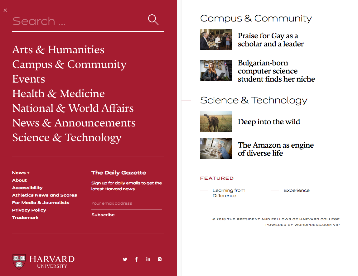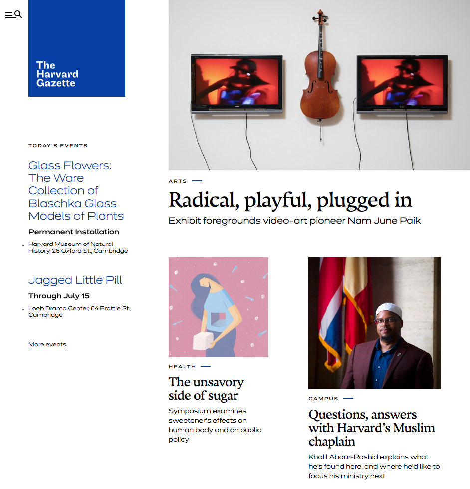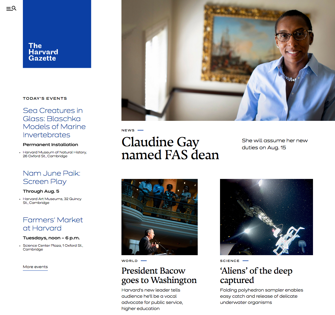 The Harvard Gazette is the official news website for Harvard University. Upstatement was recently commissioned to reimagine the venerable publication. The new font palette combines the sans serif Dinamit (Revolver Type Foundry) and the serif Nocturno (Typotheque).
