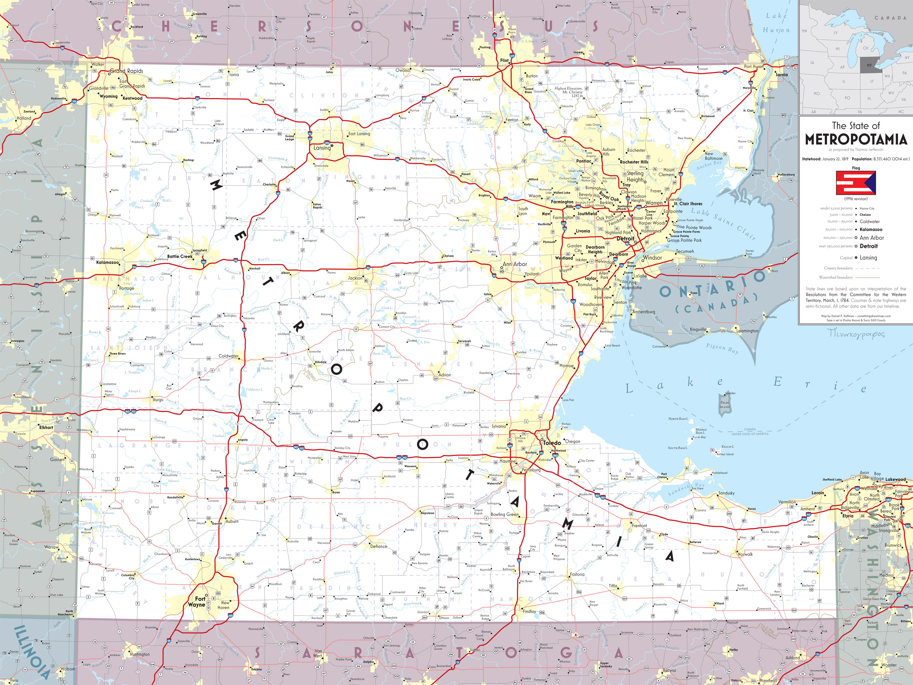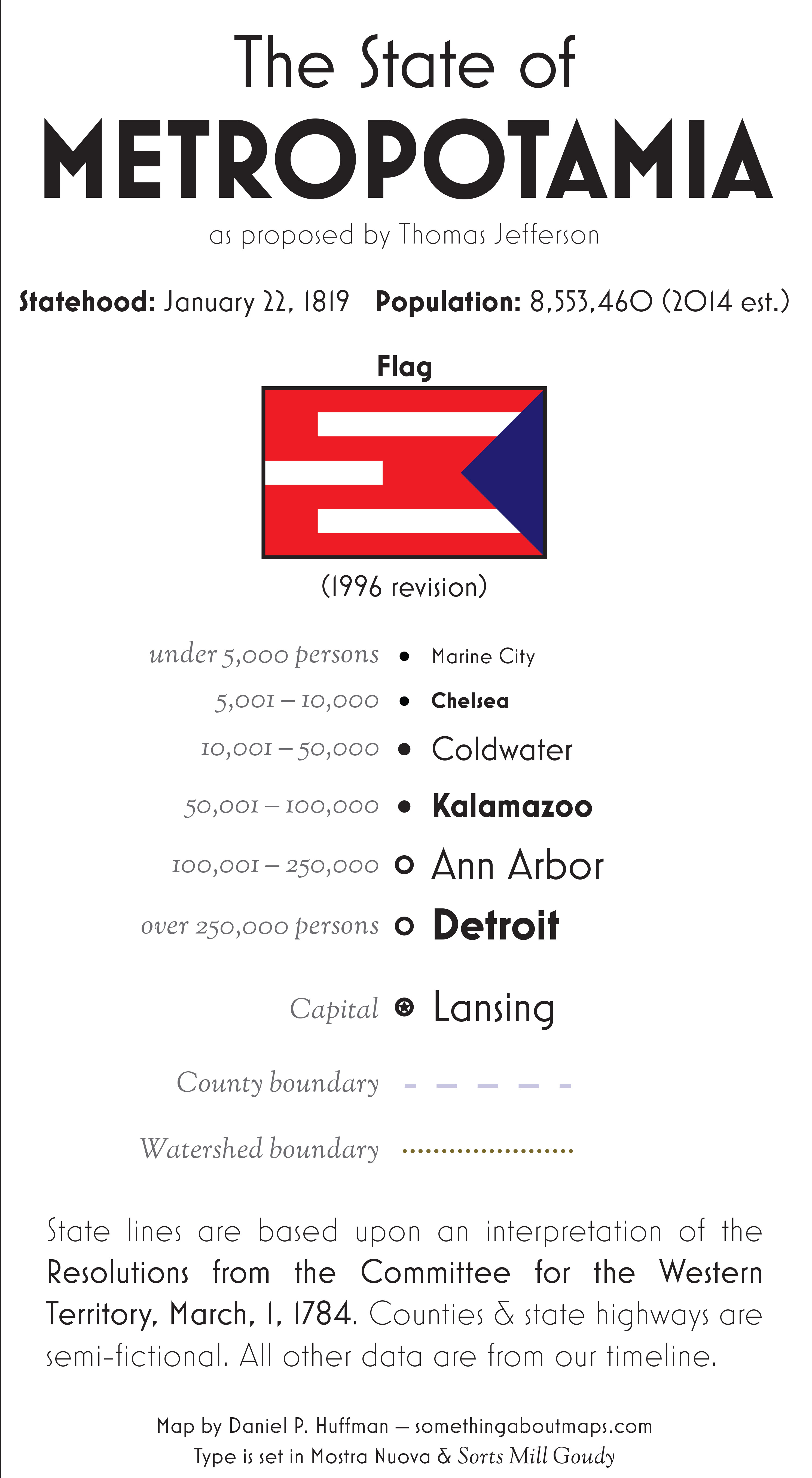 In 1784, a committee headed by Thomas Jefferson proposed dividing up the Northwest Territory (as it would later be called) into a set of future states. These recommendations were never carried out, however, and instead of states like Saratoga, Sylvania, and Chersonesus, we ended up with the more familiar Michigan, Illinois, and Wisconsin. But I thought it might be fun to pretend that Jefferson’s ideas had been carried out, and so I decided to map his imagined state of Metropotamia.