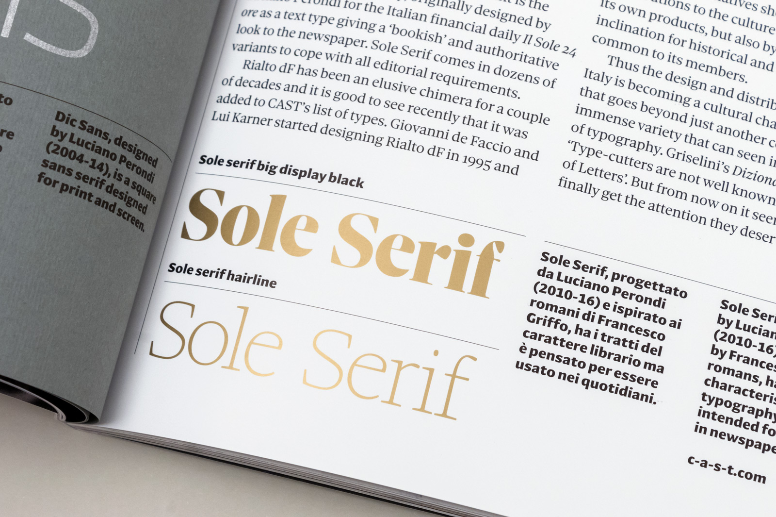 Originally designed in 2010 by Luciano Perondi for Italy’s leading financial paper Il Sole 24 Ore, Sole Serif has all the attributes of a newspaper face: big x-height, short ascenders and a roundish and wide italic for text and titles. Nonetheless, details like the inclined axis, calligraphic terminations, Renaissance proportions and a refined but slightly mannered design, all evoke the book rather than the daily paper.