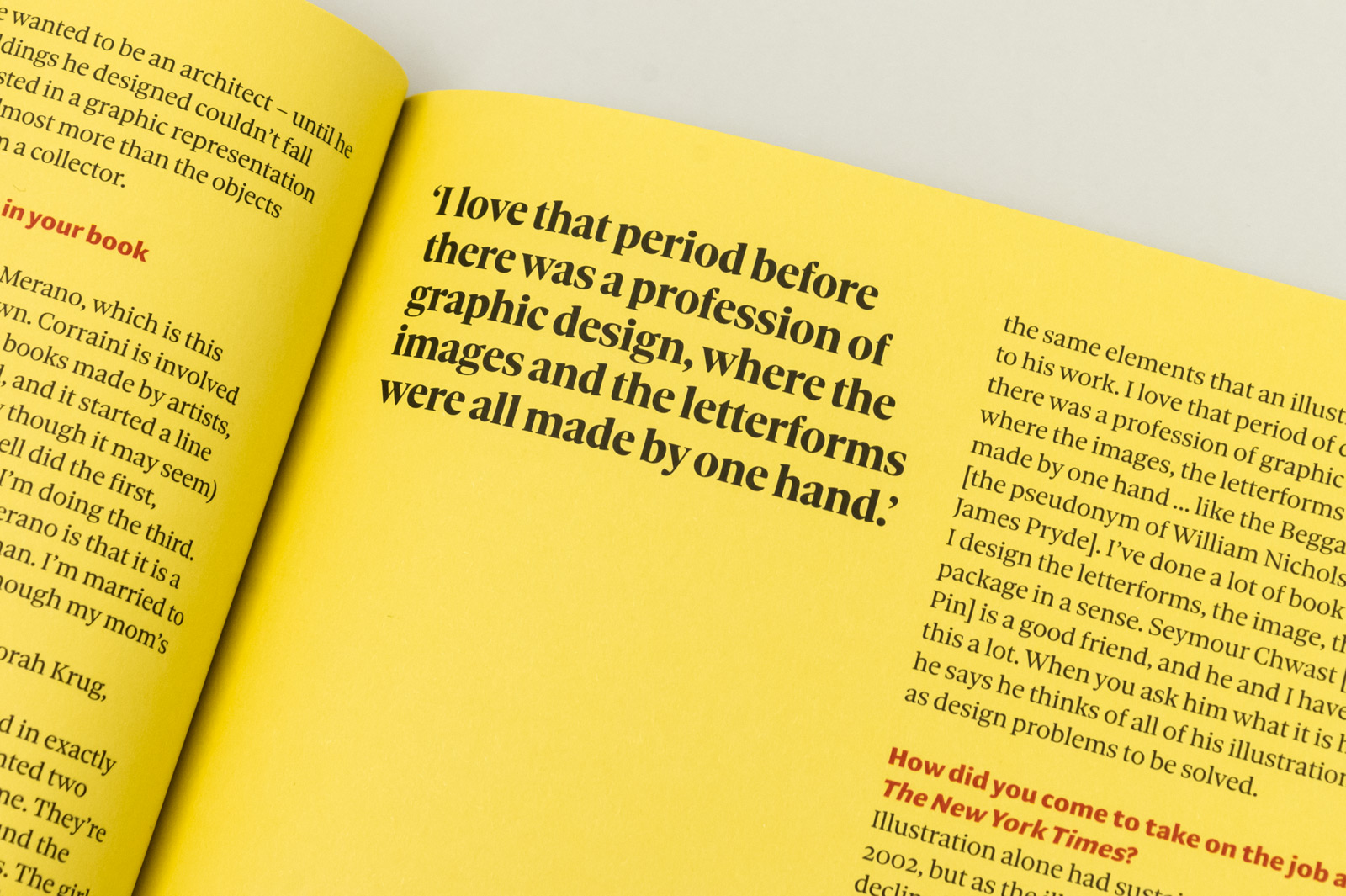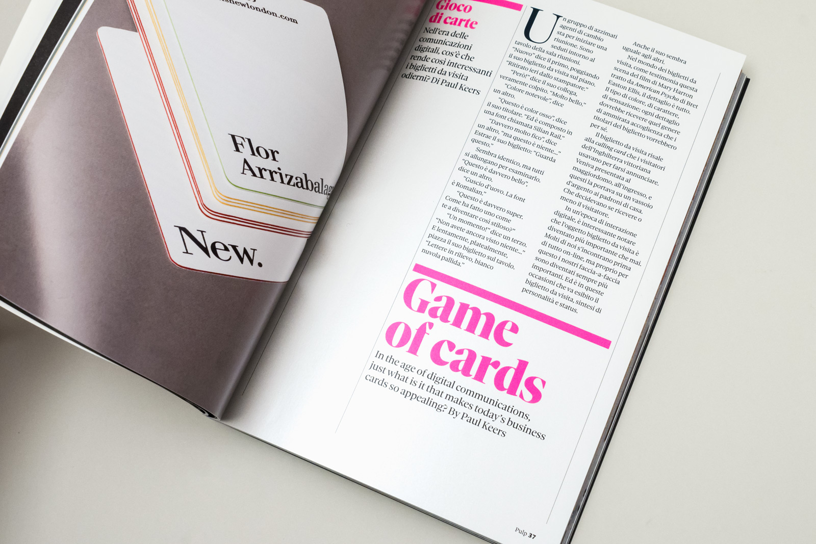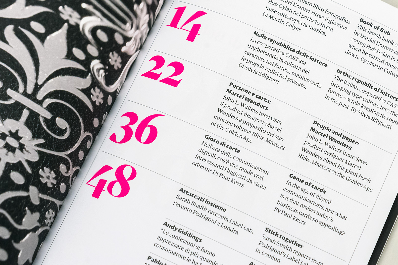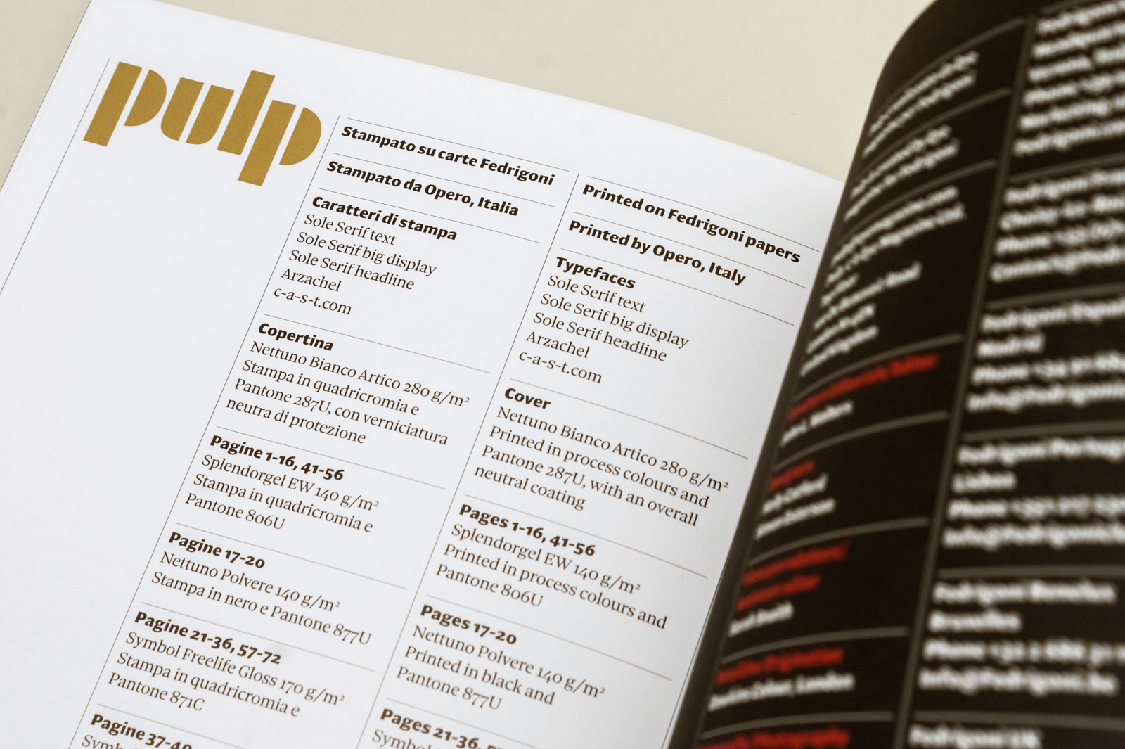 Pulp is a ‘quarterly journal of people and paper’ produced for Fedrigoni in two editions (Italian/English and French/Spanish) by Eye magazine’s editorial staff: John L. Walters, editor, Simon Esterson, art director, Holly Catford, art editor, Sarah Snaith, assistant editor, and Janet South, business manager. Printing techniques, fonts, layouts, graphic and editorial projects, illustrations, photographs, archives, swapping ideas with the people who get all this on the move and all the paper they use for their projects: these are the topics that Pulp has been covering since its first issue (March 2014).