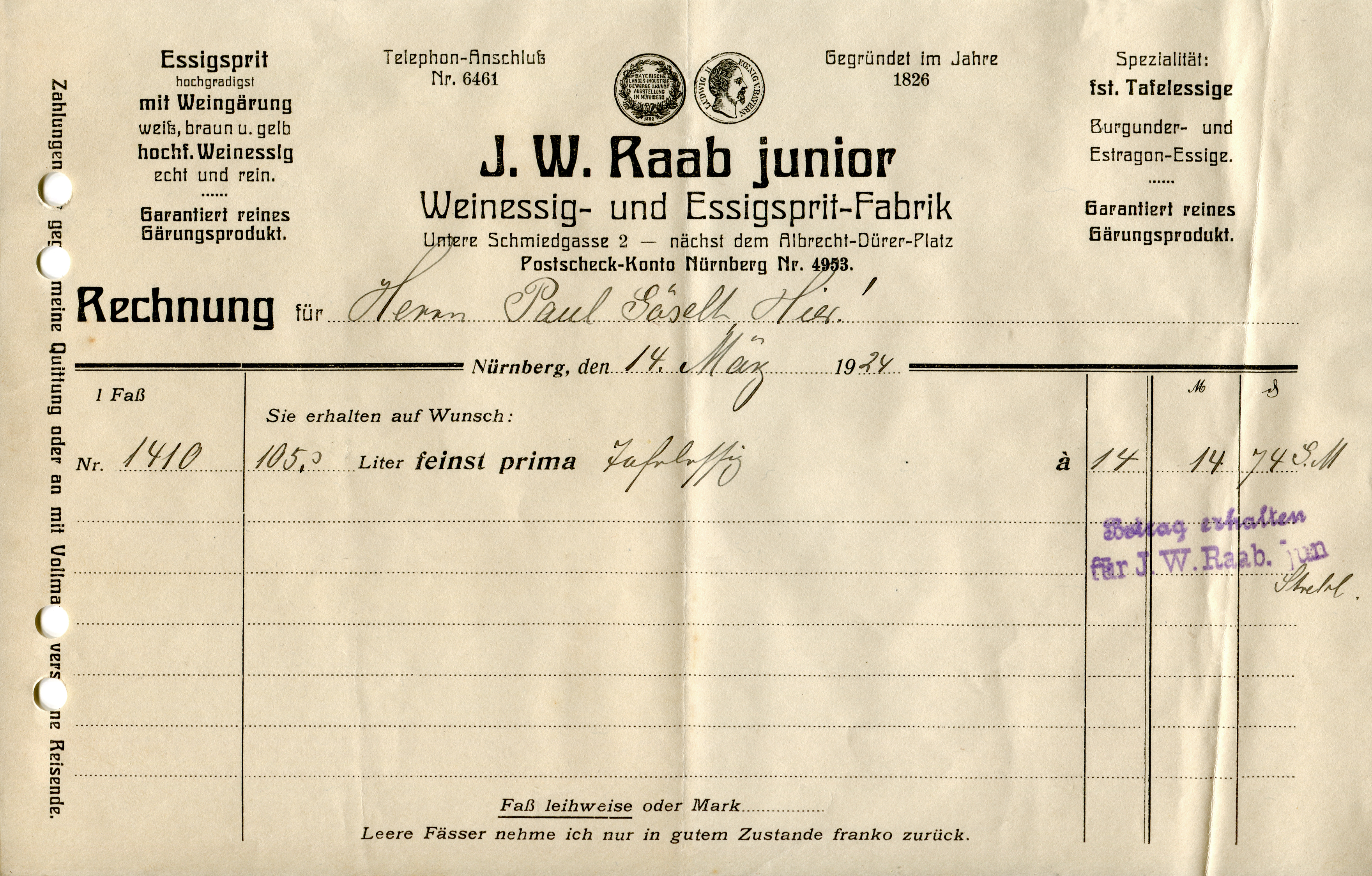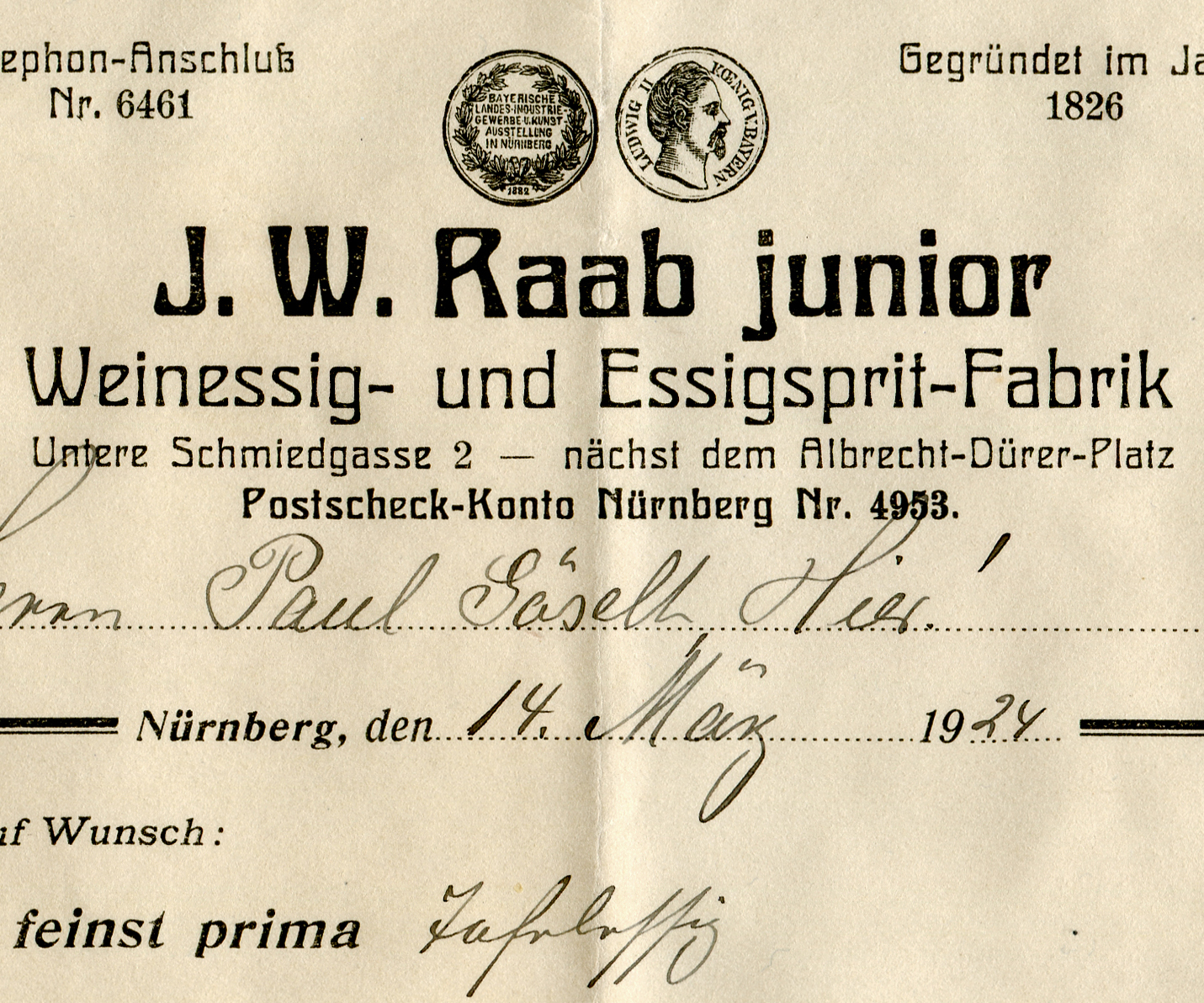The invoice from J.W. Raab junior’s factory for wine and spirit vinegars shows both weights of Radium. The character set does include numerals, but for some reason, they were not used here. Maybe the printer hadn’t purchased the sorts?