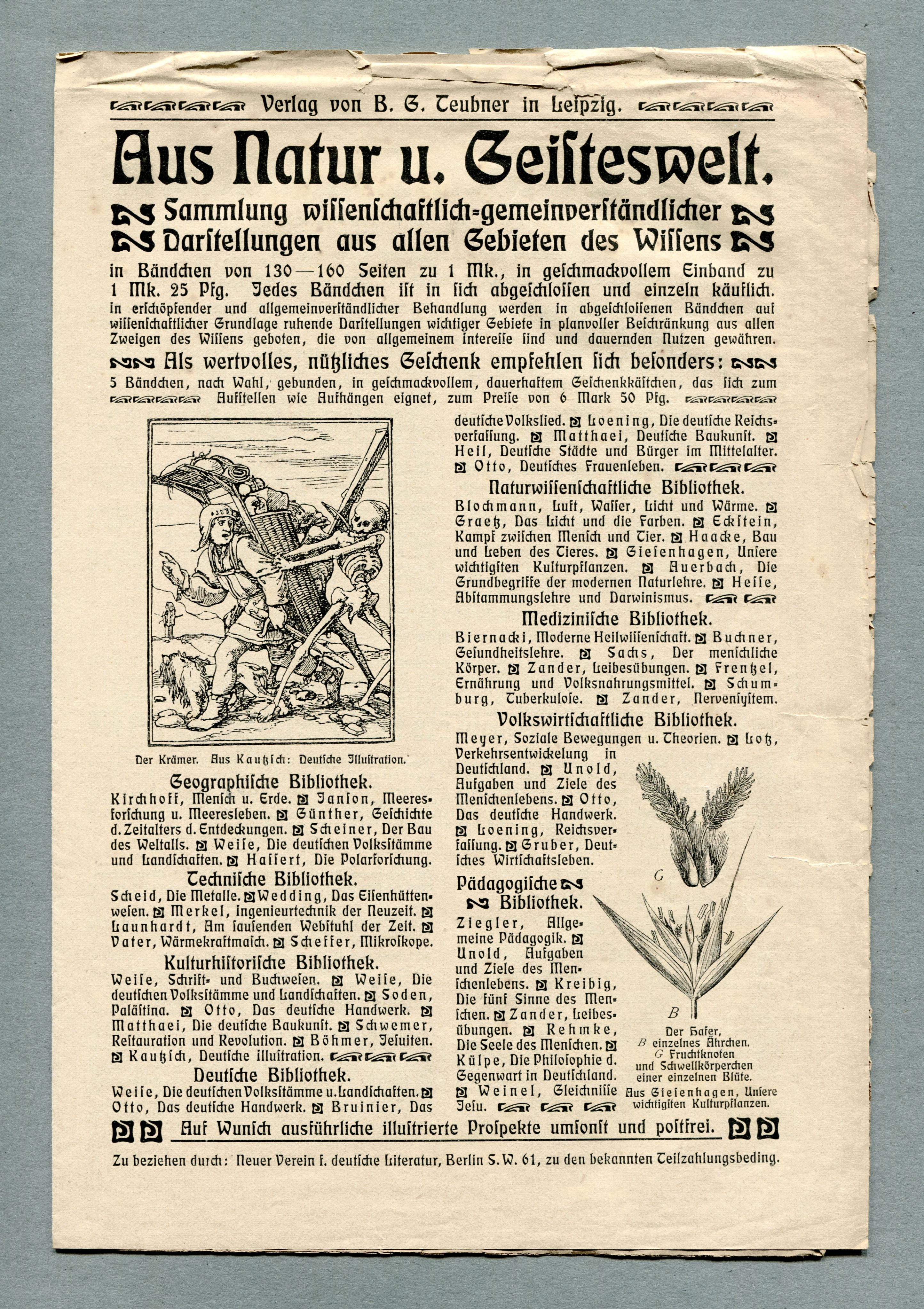 Brochure for non-fiction books from the Leipzig-based Verlag B. G. Teubner (1811–2008). “From nature and humanities. Collection of scientific and generally understandable depictions from all areas of knowledge”. Aus Natur und Geisteswelt was published from 1899 on and spanned 240 volumes. This brochure is probably from the late first decade of the twentieth century.