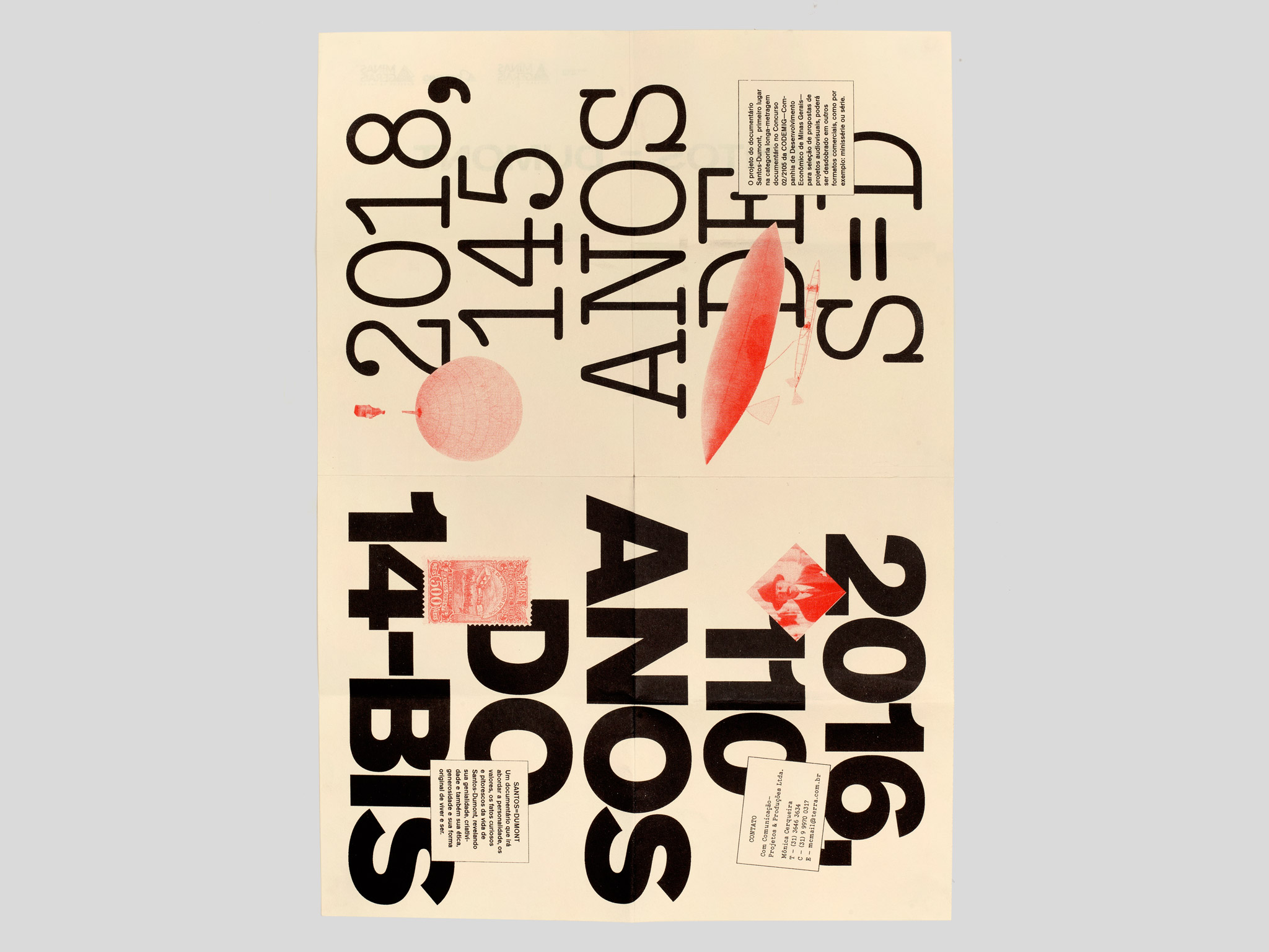 The folded sheet was distributed inside plastic bags to underline the historical-documental nature of the movie and the poster itself. The back contains a blown-up photograph of moments before Santos-Dumont flew his first invention, the Brasil balloon, dated 1898.