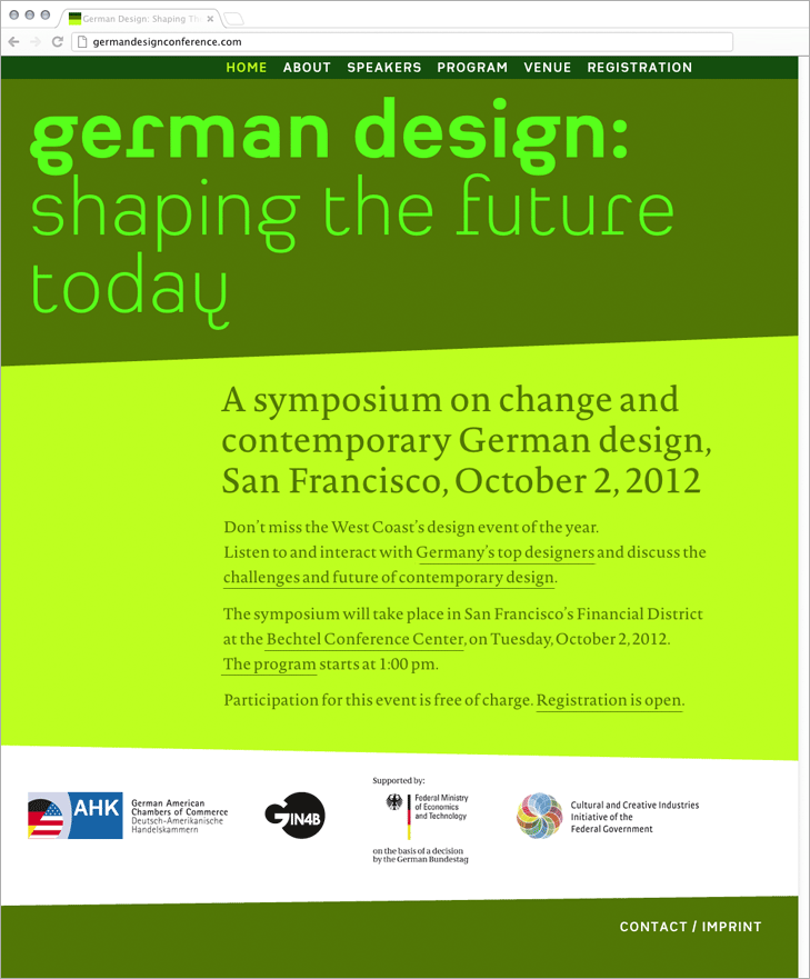 German Design Conference Contributed by Nina Stössinger on Sep 15th, 2012. Artwork published in 2012. Source: kaune.hardwig.com Design and images © Kaune & Hardwig, Berlin. License: All Rights Reserved. Identity, print materials and website for the “German Design” conference in San Francisco: [translated from source] Visual identity for a symposium on change and contemporary German Design. Design and development of online and print media. “German Design: Shaping the Future Today” San Francisco, October 2, 2012 germandesignconference.com Source: kaune.hardwig.com Design and images © Kaune & Hardwig, Berlin. License: All Rights Reserved. Typefaces More about Heimat SansGet Heimat SansMore about NovelGet Novel Formats Web (5682) Branding/Identity (8546) Topics Event (3262) Graphic Design (3028) Designers/Agencies Kaune & Hardwig (2) Tagged withdesign conferences (86)conferences (115)San Francisco (27)webfonts (449)typeface combinations (3990)green (779) Artwork location Germany (3910) Berlin (1165) In Sets2+ typefaces by 1 designer (Florian Hardwig) (1141) Post a comment Name Email – will not be published Website Your response Submit Comment More Heimat Sans in use Tallio2014Willy DangPresentContributed by Willy Dang Schindler Seko Architects2012Klara KvízováReDesignPetr KrejzekContributed by Florian Hardwig Applaus 2015, FH Potsdam2015Julian ThielAdina RadkeContributed by Florian Hardwig Sponsor More in Graphic Design One and All2017DynamicMTLContributed by Sharp Type Glitchin youth2017Alex Plesovskichyyy.clubContributed by alex p Futura: The Typeface2016Isabel NaegeleStephanie KaplanContributed by Lali Rossy Black Antoinette. The Work of Olaf Hajek2012Contributed by Florian Hardwig More in Web Central Park Sydney2010Frost*Contributed by Florian Hardwig HURS website2022https://bonnielangedijk.com/Contributed by Jan Maack Staff Pick The Metaverse Music Festival 20222022DecentralandContributed by Teguh Arief Jili Buro website2025Artem ShcherbanContributed by Artem Shcherban More Fonts In Use Humbug July 2020 program poster series2020Berger + Co.Contributed by berger + Co. Staff Pick Lightning Rods by Helen DeWitt2011Steve AttardoContributed by Stephen Coles Staff Pick The Little Book of Bhakti-Yoga2006Christoffer LekaKaisa LekaMåns BrooContributed by Christoffer Leka Staff Pick “Love Is …” comic strips1970Kim CasaliLos Angeles TimesContributed by Florian Hardwig Staff Pick