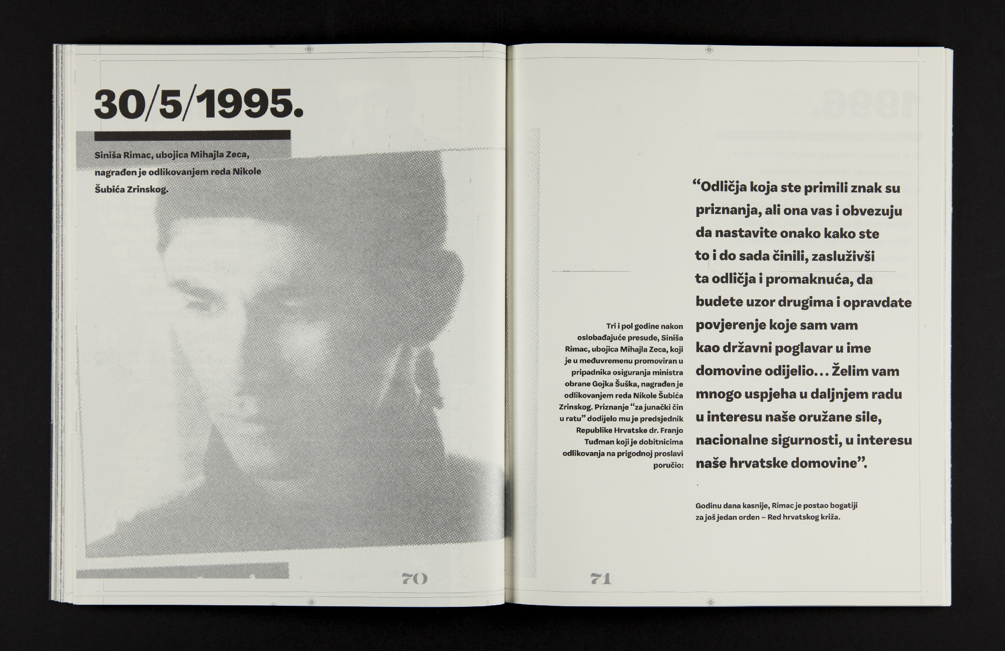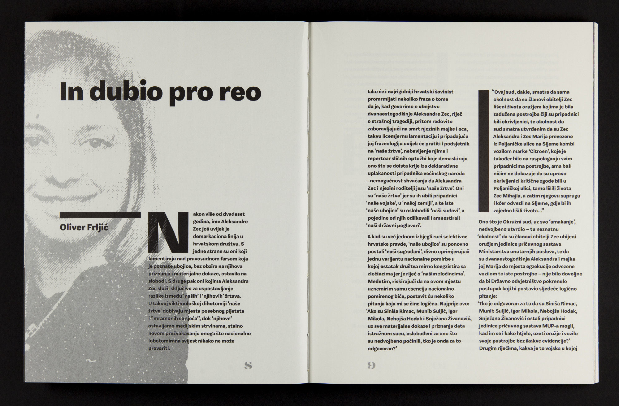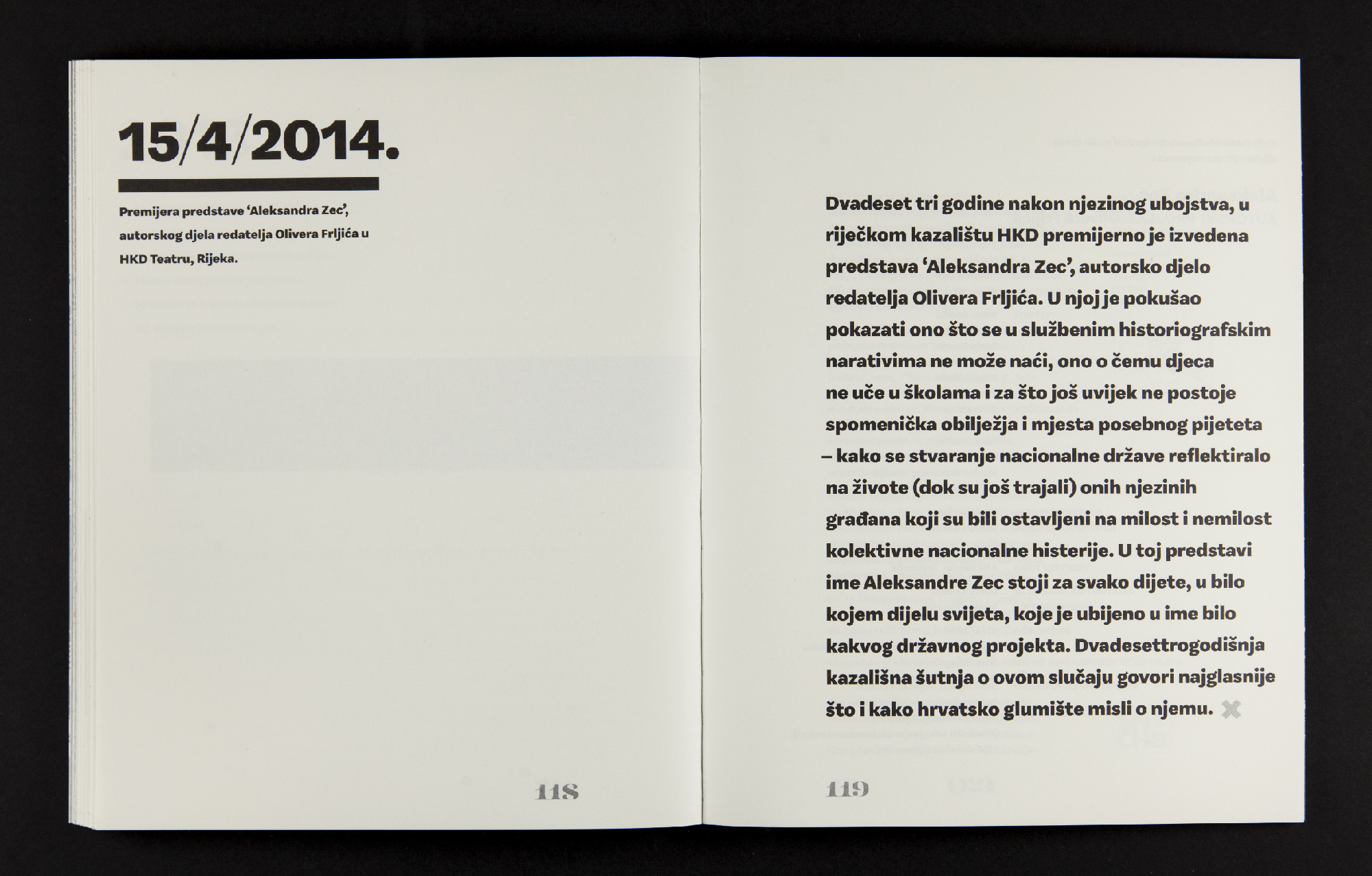 In 2014 theatre director Oliver Frljić premiered his Aleksandra Zec show in Rijeka, Croatia. The play is based on real events that occurred in Zagreb, Croatia during the Yugoslav wars, more specifically on the execution of the Zec family, including their underage daughter Aleksandra Zec. This book shows research material collected during the process of making the stage adaptation and was published by The International Small Scene Theatre Festival.