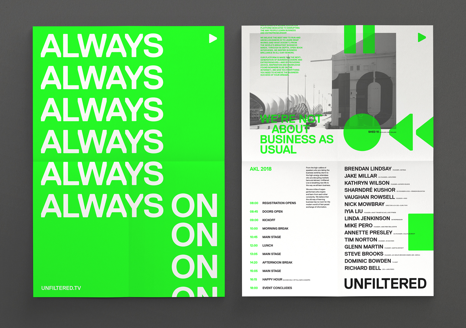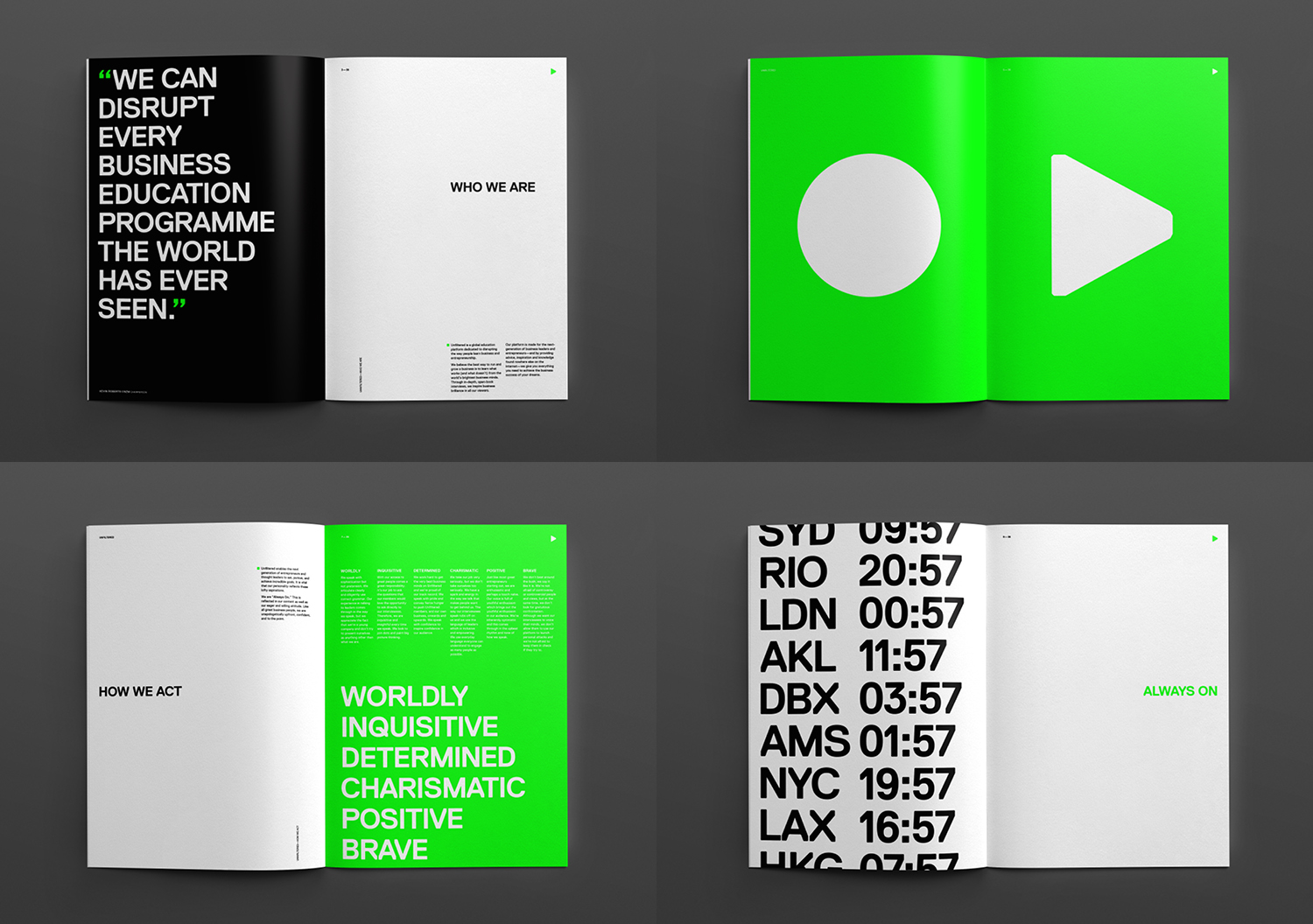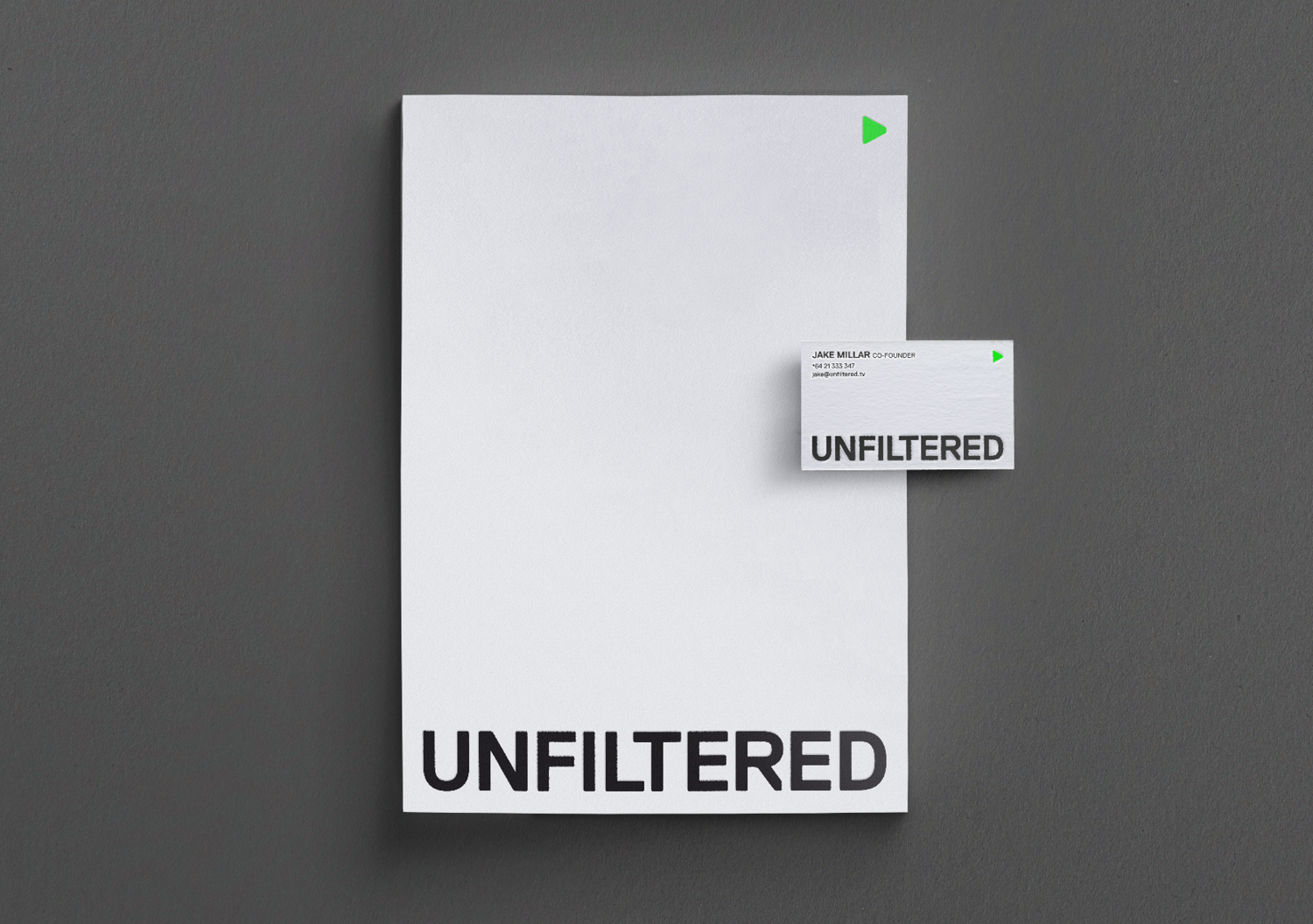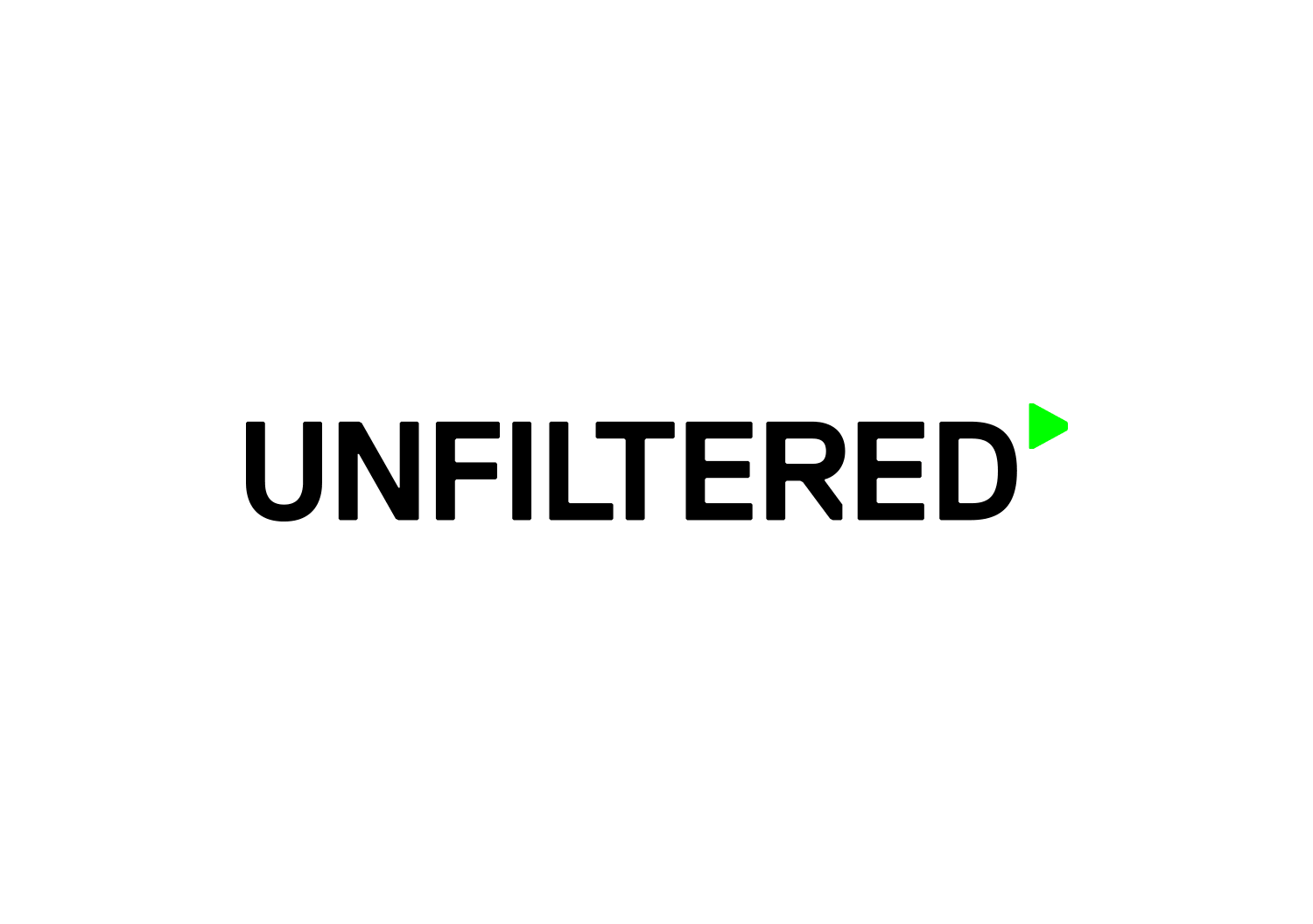 Strategy Creative created a brand based on two core elements: an ‘ownable’ typeface and an ‘ownable’ colour. With this is mind, we created a bold and upfront all-caps logo. The chamfered edges of Lineto’s Replica allowed the wordmark to be set as a strong unit, and created a subtle reference to digital LCD displays. The play symbol was added in reference to the ‘always on’ nature of Unfiltered’s business. This was extended into a full set of playback symbols that were used as brand elements across print and motion executions. A flexible system was rolled out across the collateral, creating a dynamic relationship between the wordmark and the play symbol.